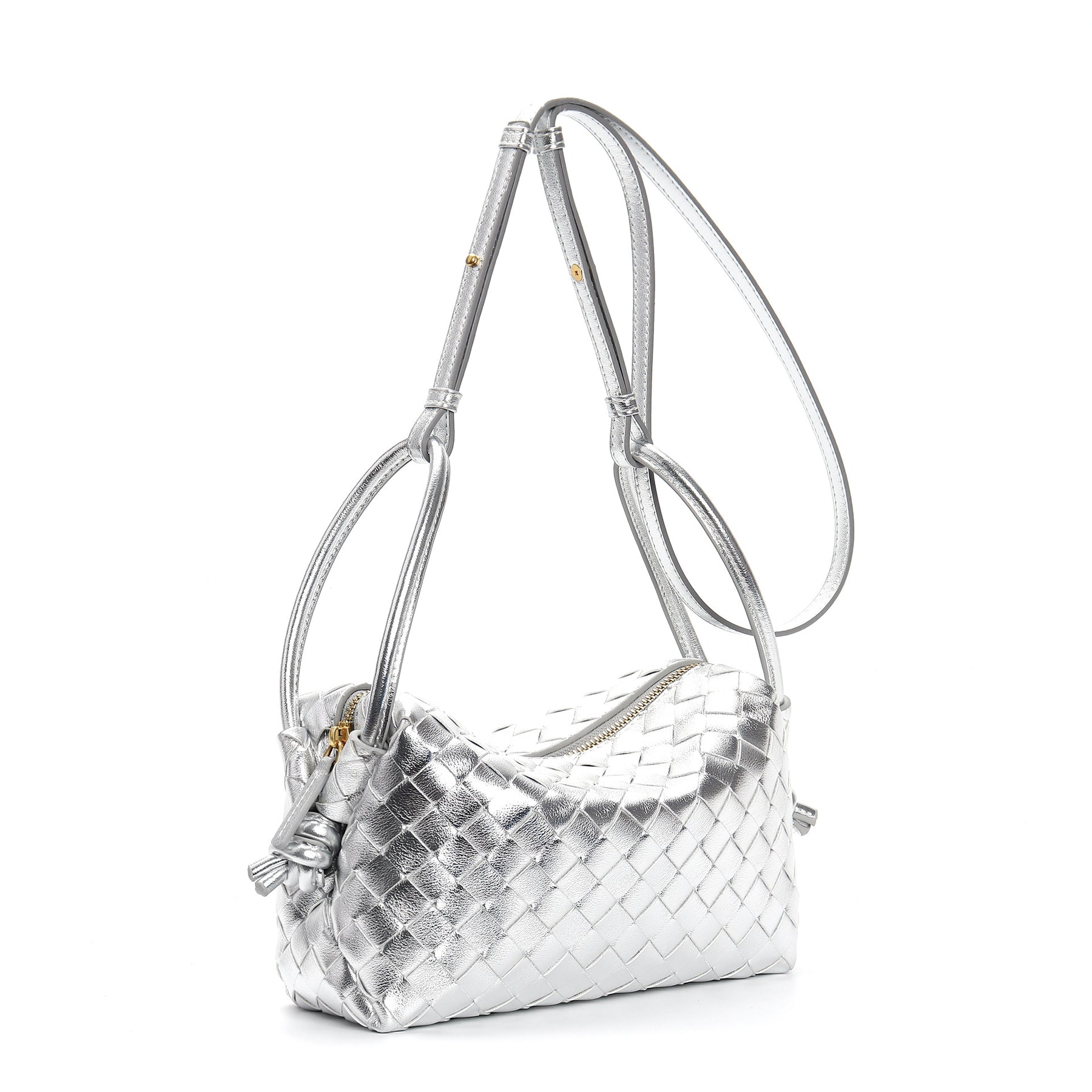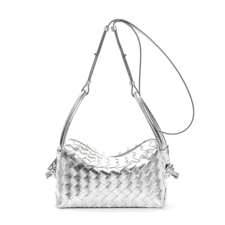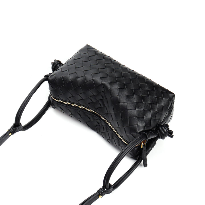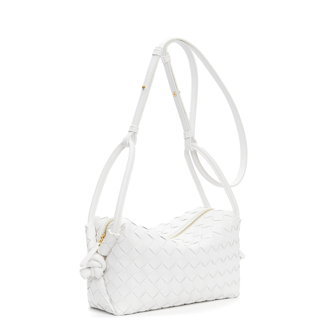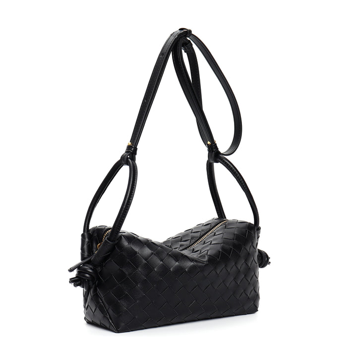 Sculptural sans effort, ce sac tissé noir et blanc présente une silhouette incurvée, des poignées supérieures structurées et un passepoil noir élégant. Un compagnon léger mais audacieux pour vos essentiels quotidiens.