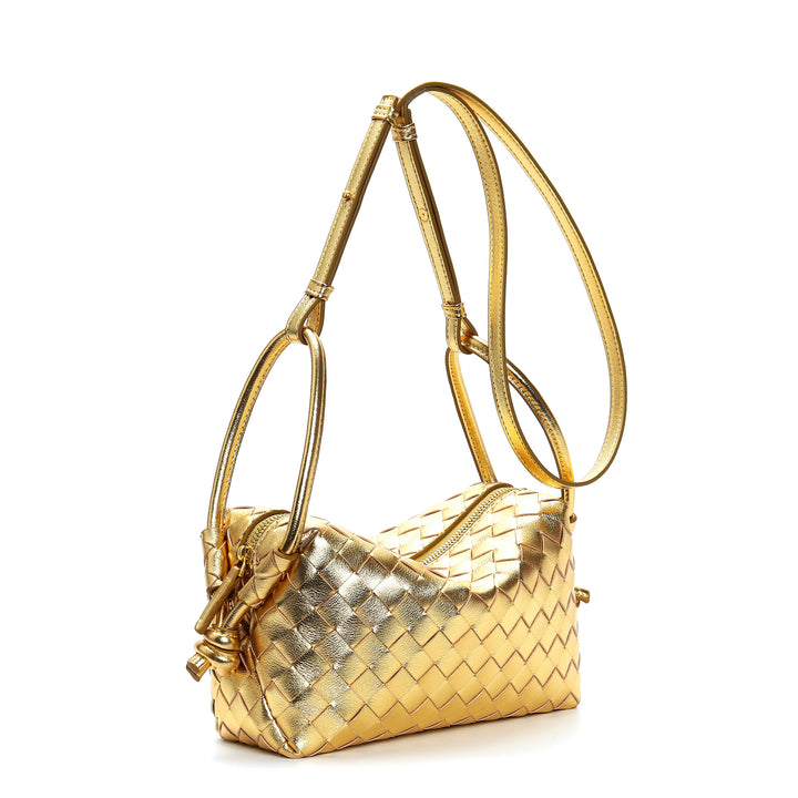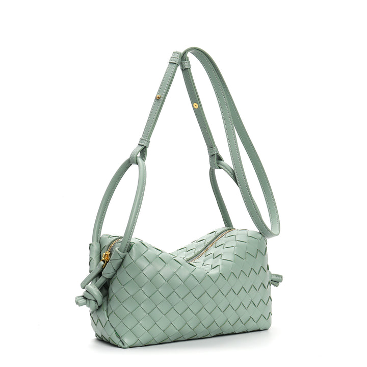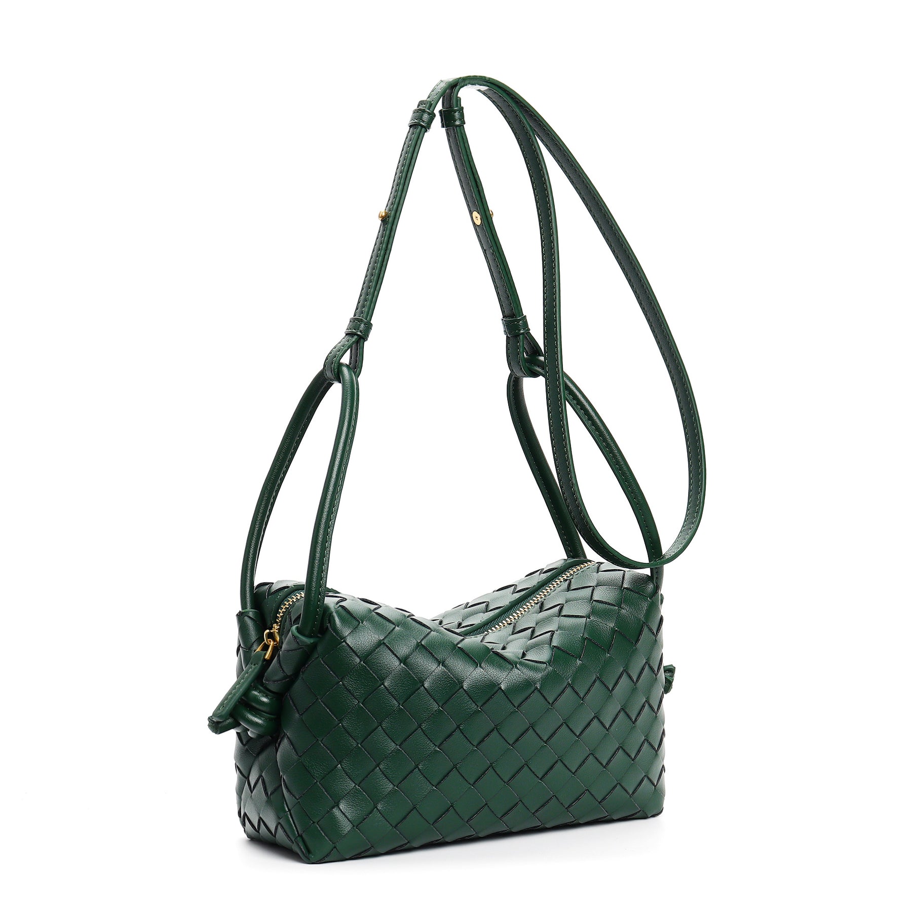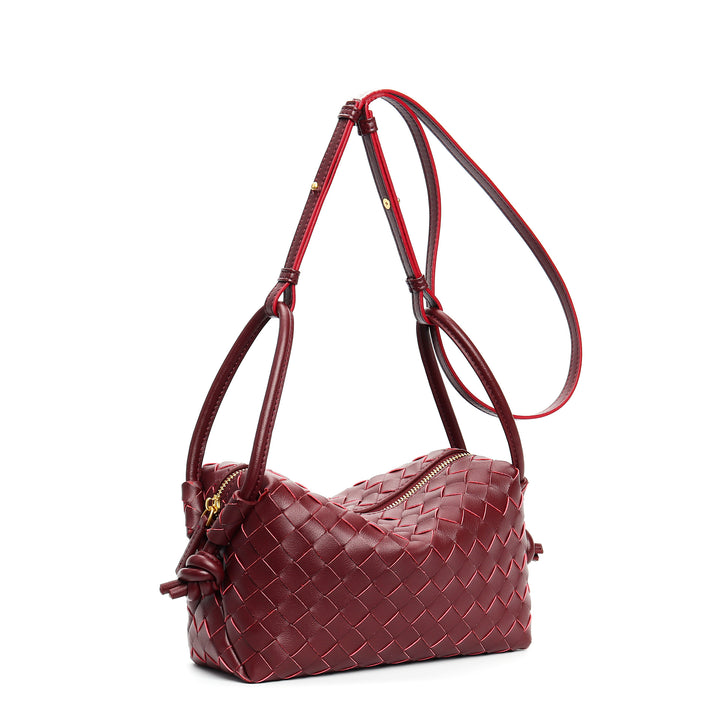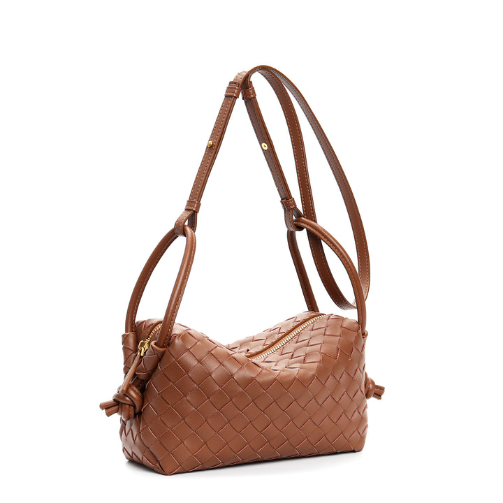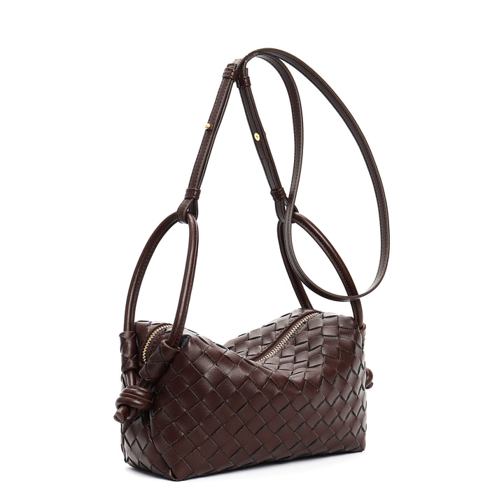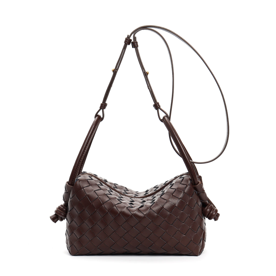 Sculptural sans effort, ce sac tissé noir et blanc présente une silhouette incurvée, des poignées supérieures structurées et un passepoil noir élégant. Un compagnon léger mais audacieux pour vos essentiels quotidiens.