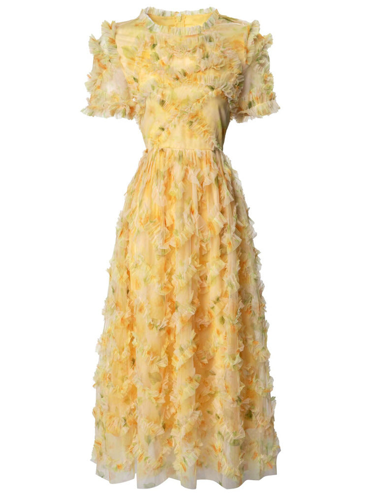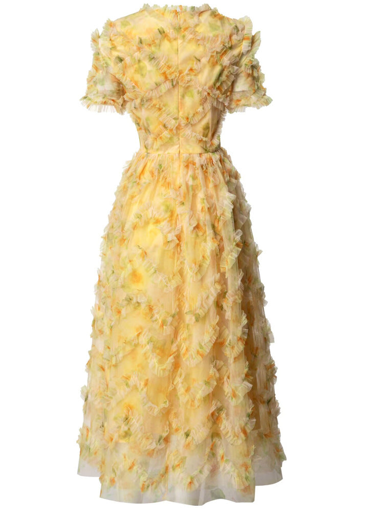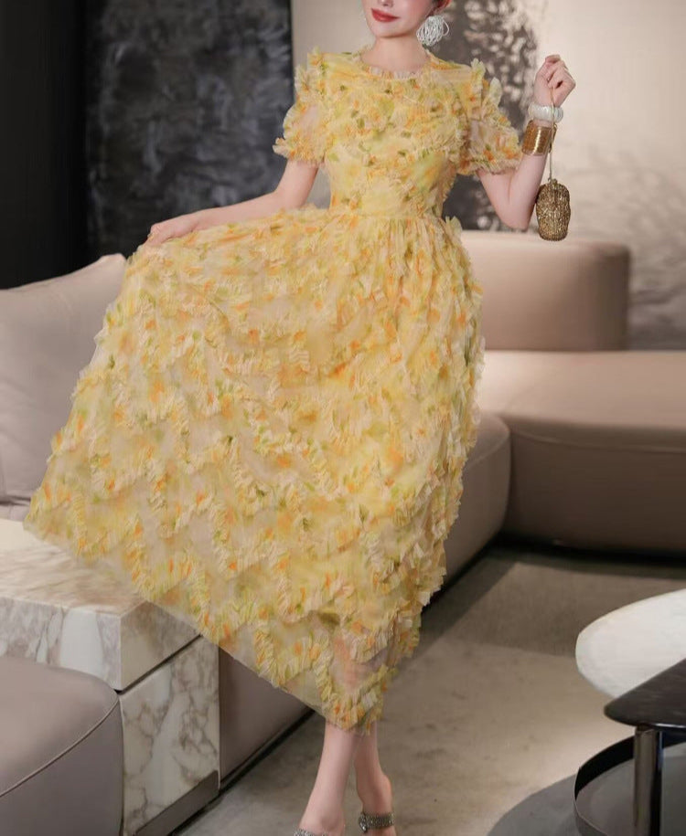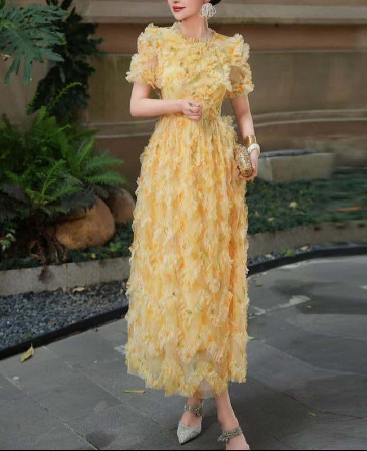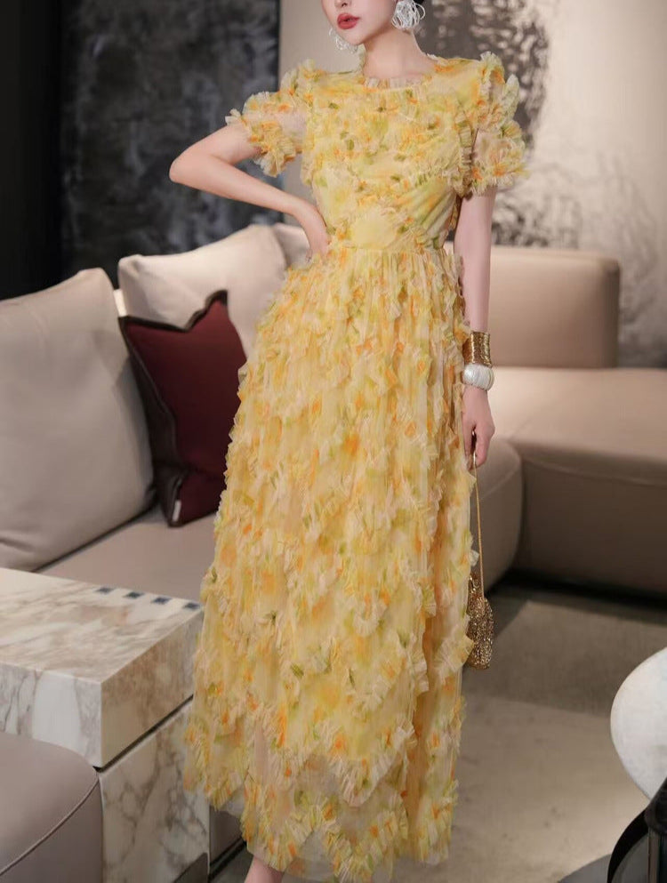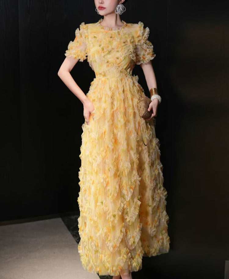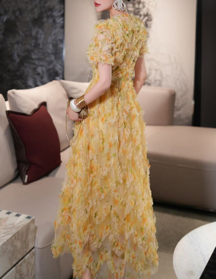 A radiant floor-length gown in sunshine yellow, adorned with layered petal-like ruffles that create soft volume and a rich 3D texture. Perfect for garden parties or elegant summer soirées, it radiates charm and femininity with every step.