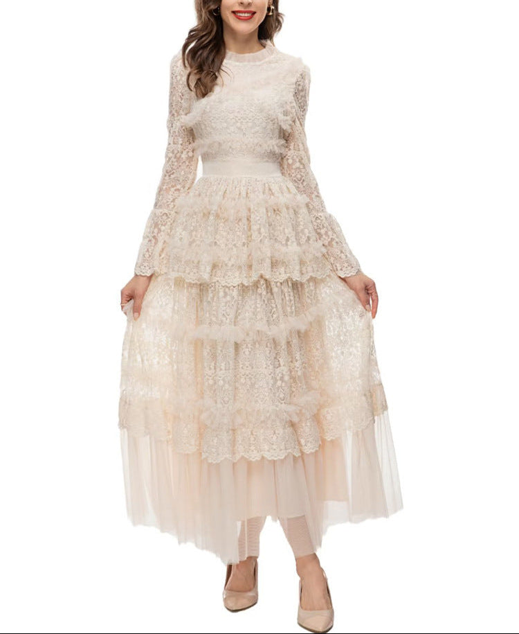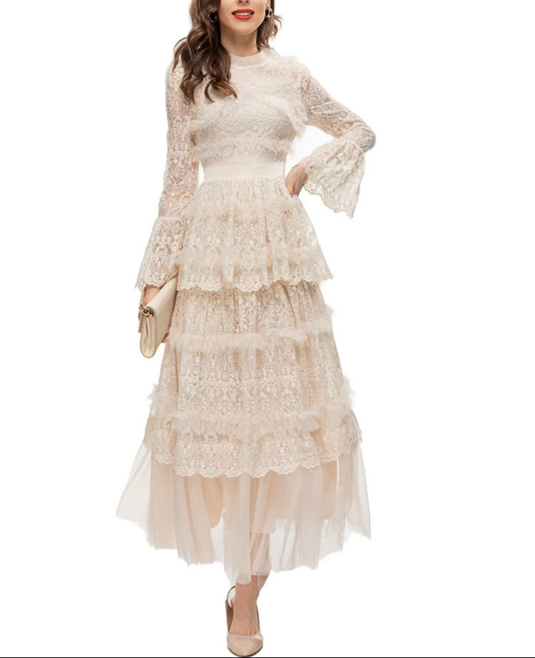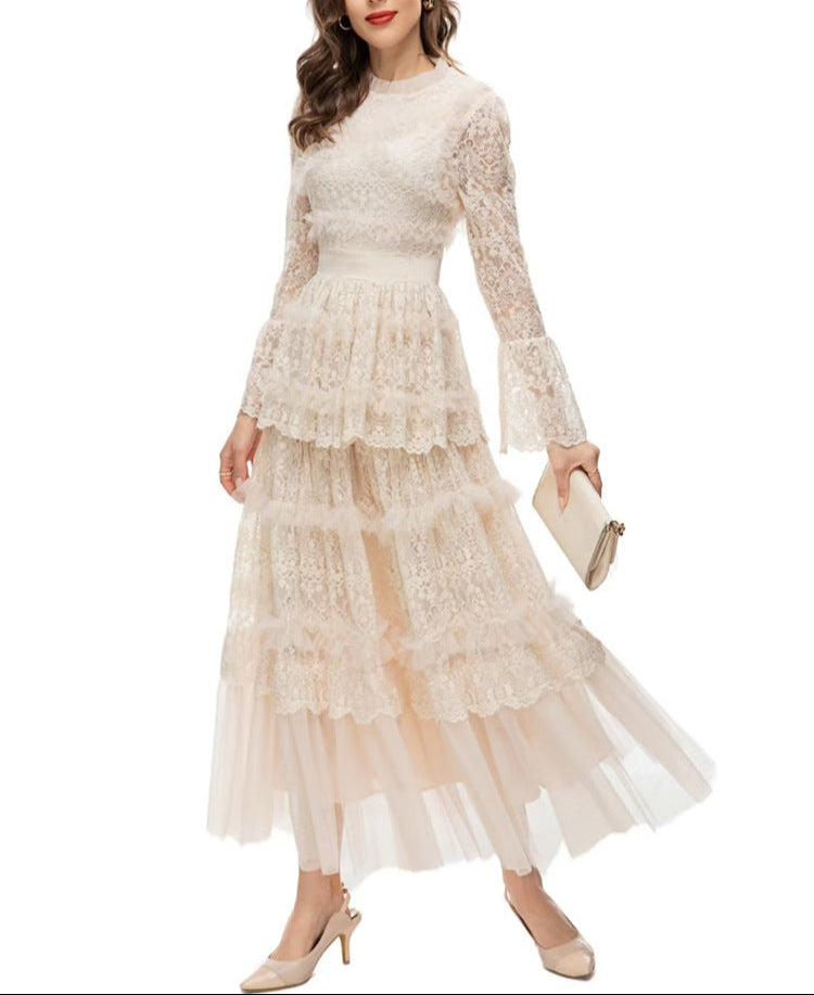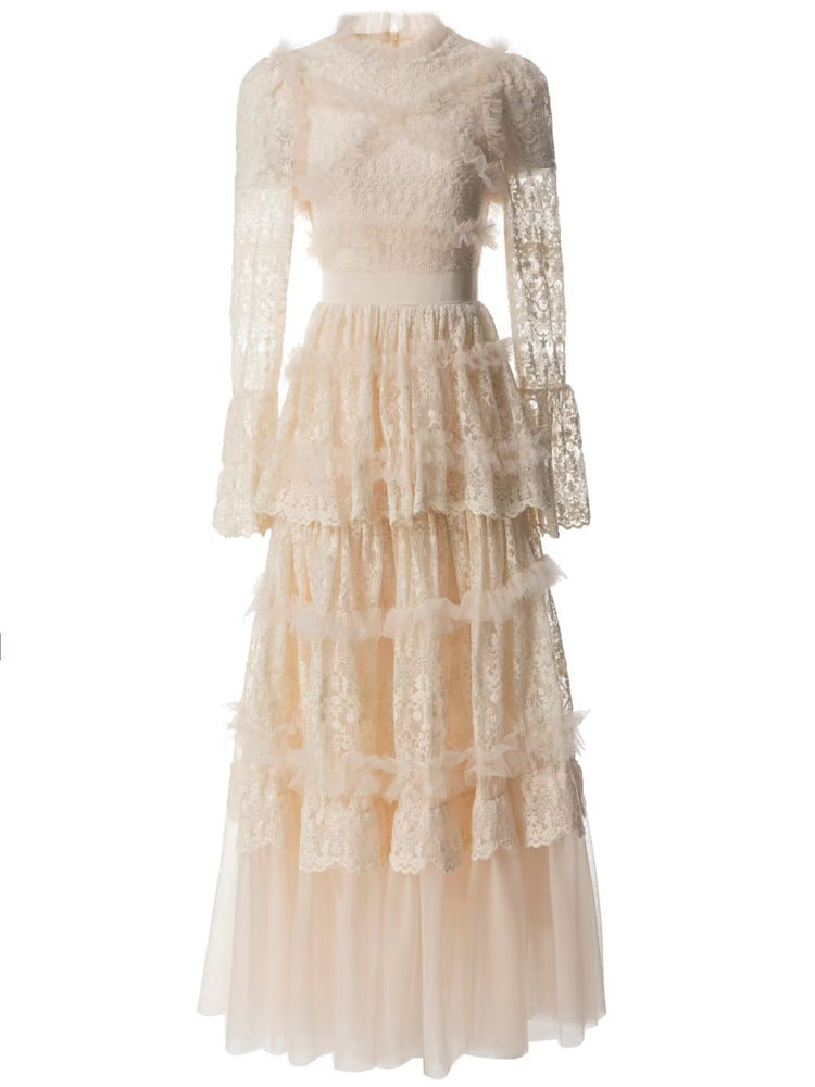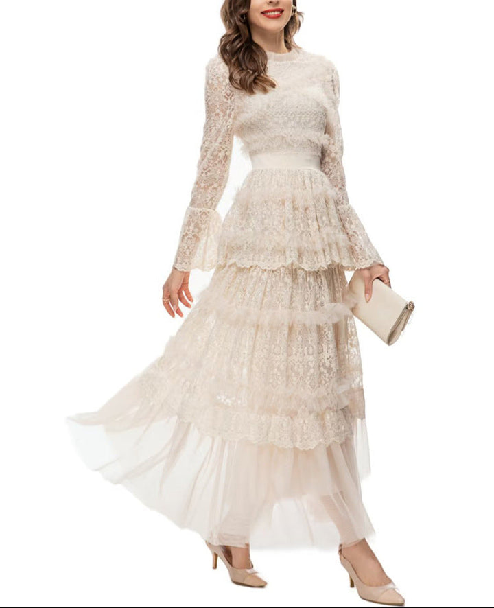 Romantic and refined, this champagne-toned gown features layered lace tiers, sheer long sleeves, and a soft tulle hemline. With a fitted waist and high neckline, it’s a graceful choice for bridal occasions, receptions, or timeless evening elegance.