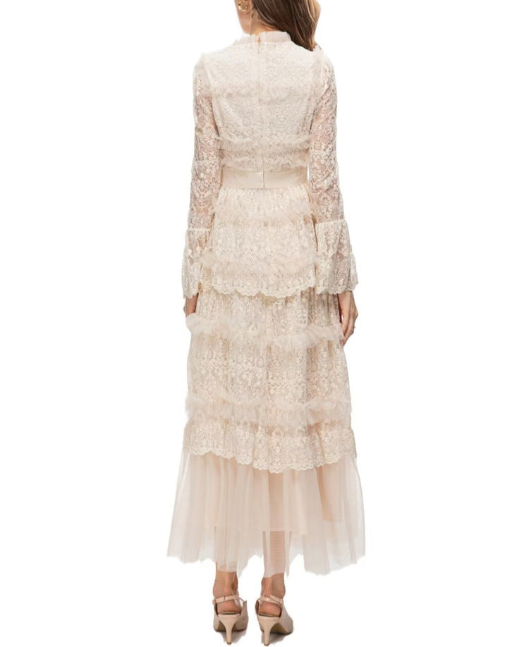 tiered lace gown with long sleeves and tulle hem – CHAMPAGNE FROST