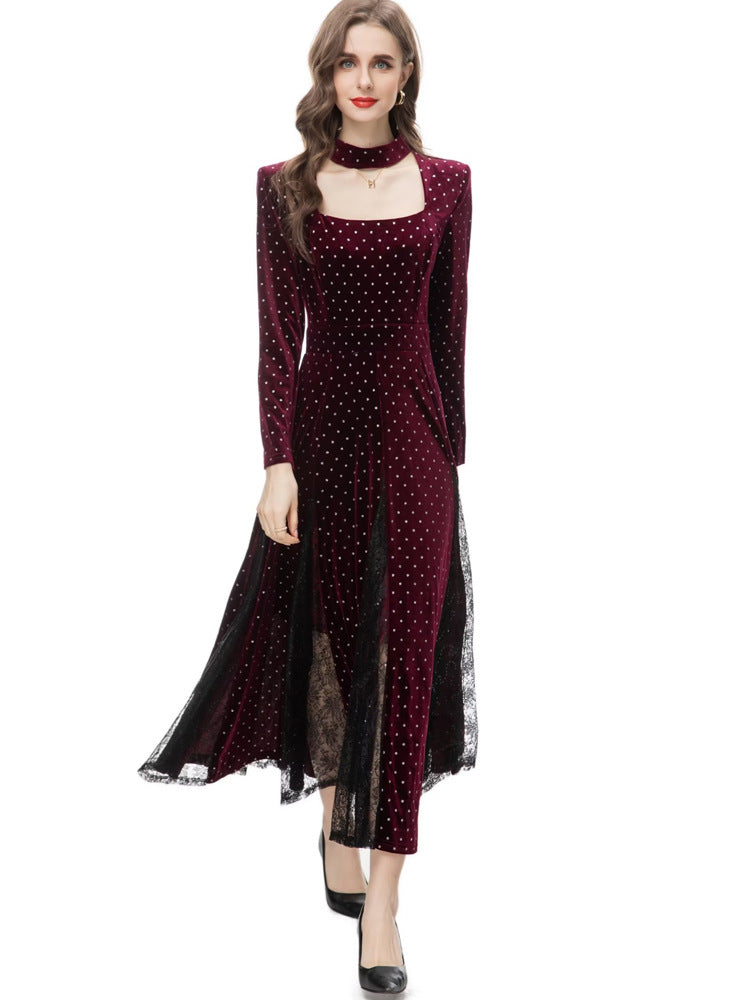 Refined and glamorous, this black velvet gown is adorned with delicate polka dots, a square neckline, and a statement choker collar. Featuring a crystal-embellished belt and sheer lace panel at the hem, it's the perfect blend of vintage drama and modern elegance.