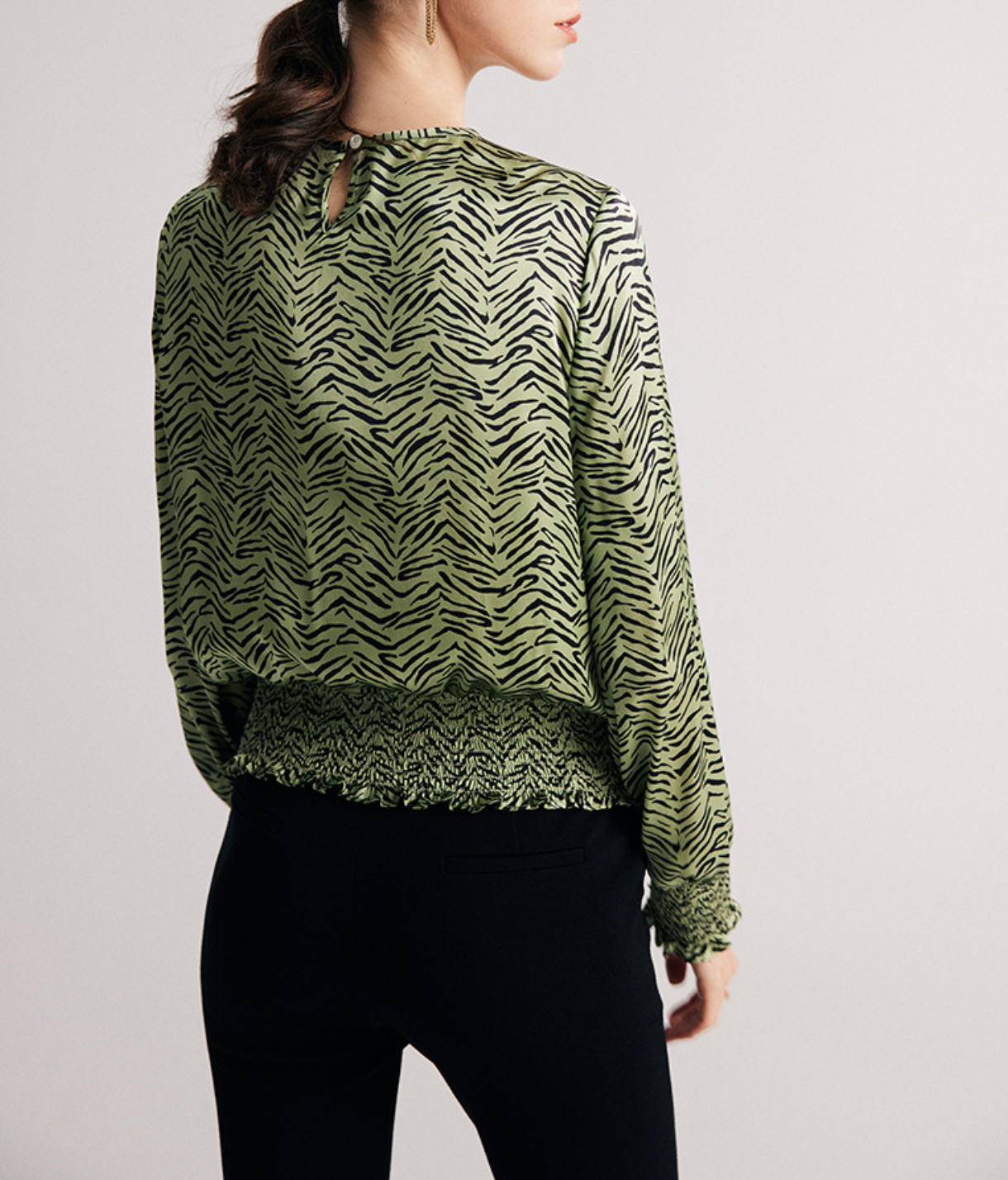 A refined statement blouse featuring a modern zebra print in soft olive tones. Designed with a relaxed silhouette, gathered neckline, and long sleeves finished with elastic cuffs, while the smocked hem defines the waist for a flattering fit. Perfectly balanced between elegance and everyday chic—ideal for styling with tailored trousers or skirts.