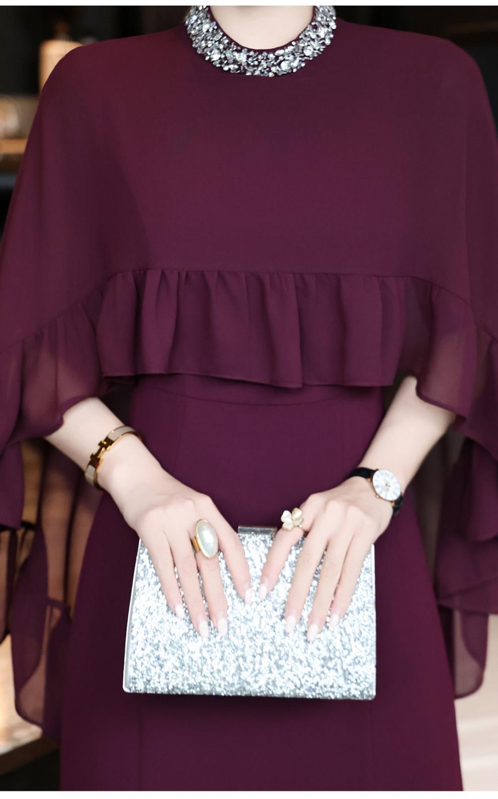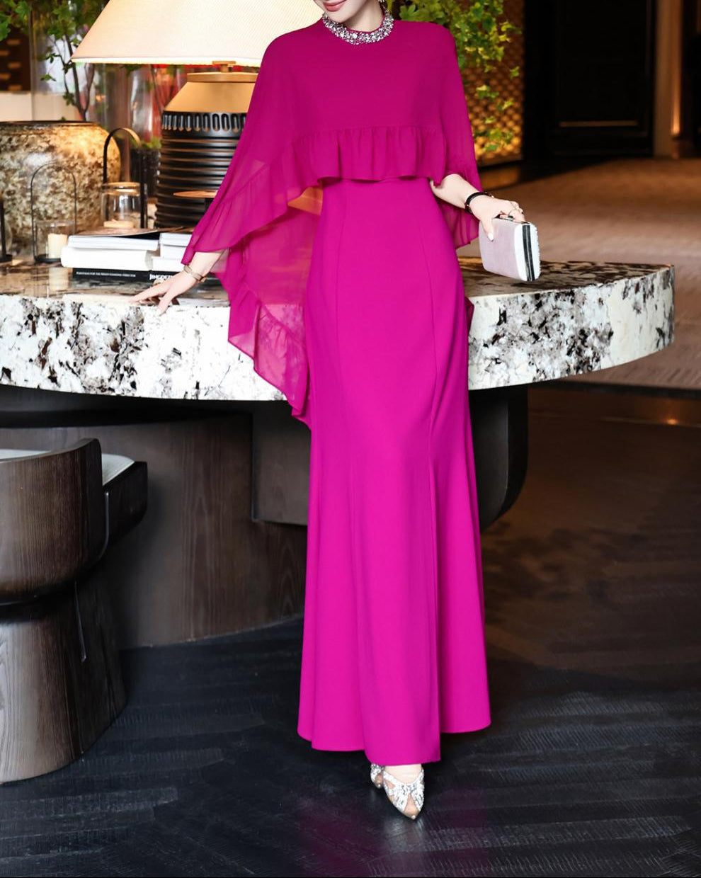 A sophisticated black evening gown featuring a soft chiffon cape overlay with a delicate ruffled tier that drapes gracefully over the shoulders. Designed with a sleek floor-length silhouette for an elegant, refined look—perfect for formal dinners and timeless occasions.