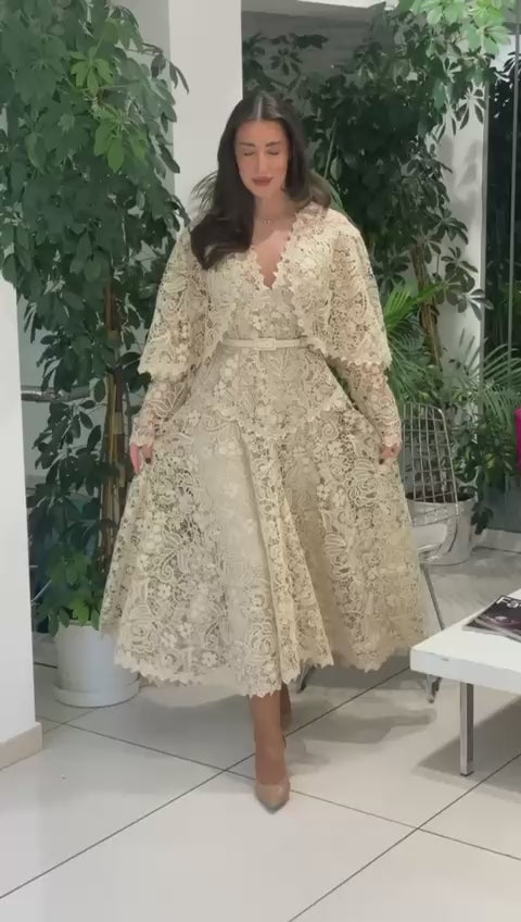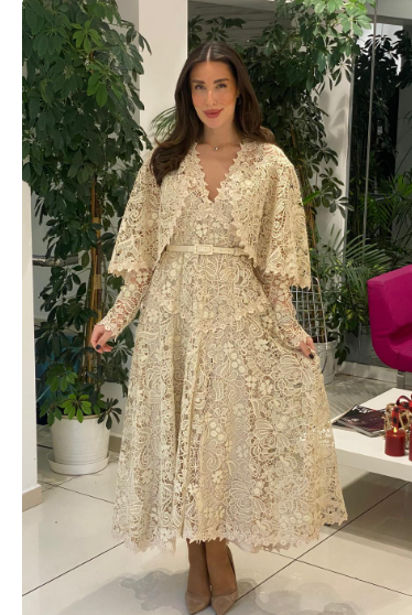 Romantic midi dress crafted from delicate floral lace, featuring scalloped cape-style sleeves and a softly defined waist with a matching belt. Graceful and feminine, this design is perfect for elegant daytime occasions, engagement events, or refined evening gatherings.