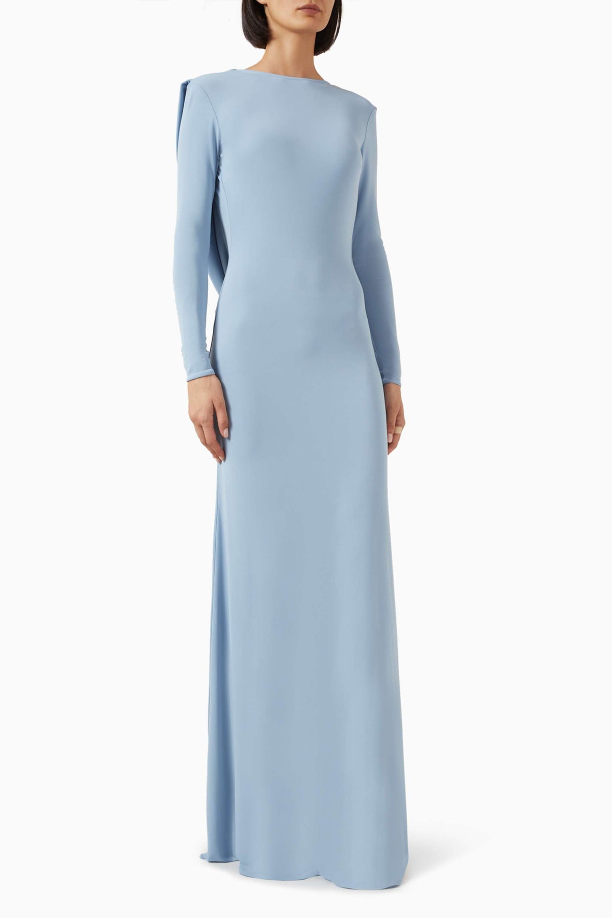 A refined minimalist column gown in a soft sky-blue shade, featuring elegant long sleeves and a clean, sculpted silhouette that enhances the body’s natural lines. The design radiates understated luxury with its smooth finish and subtle shoulder structure—perfect for formal events, modern soirées, and timeless evening elegance.