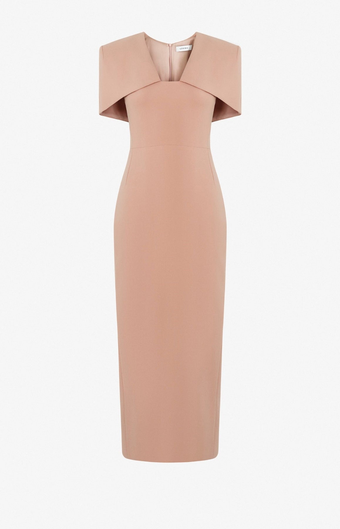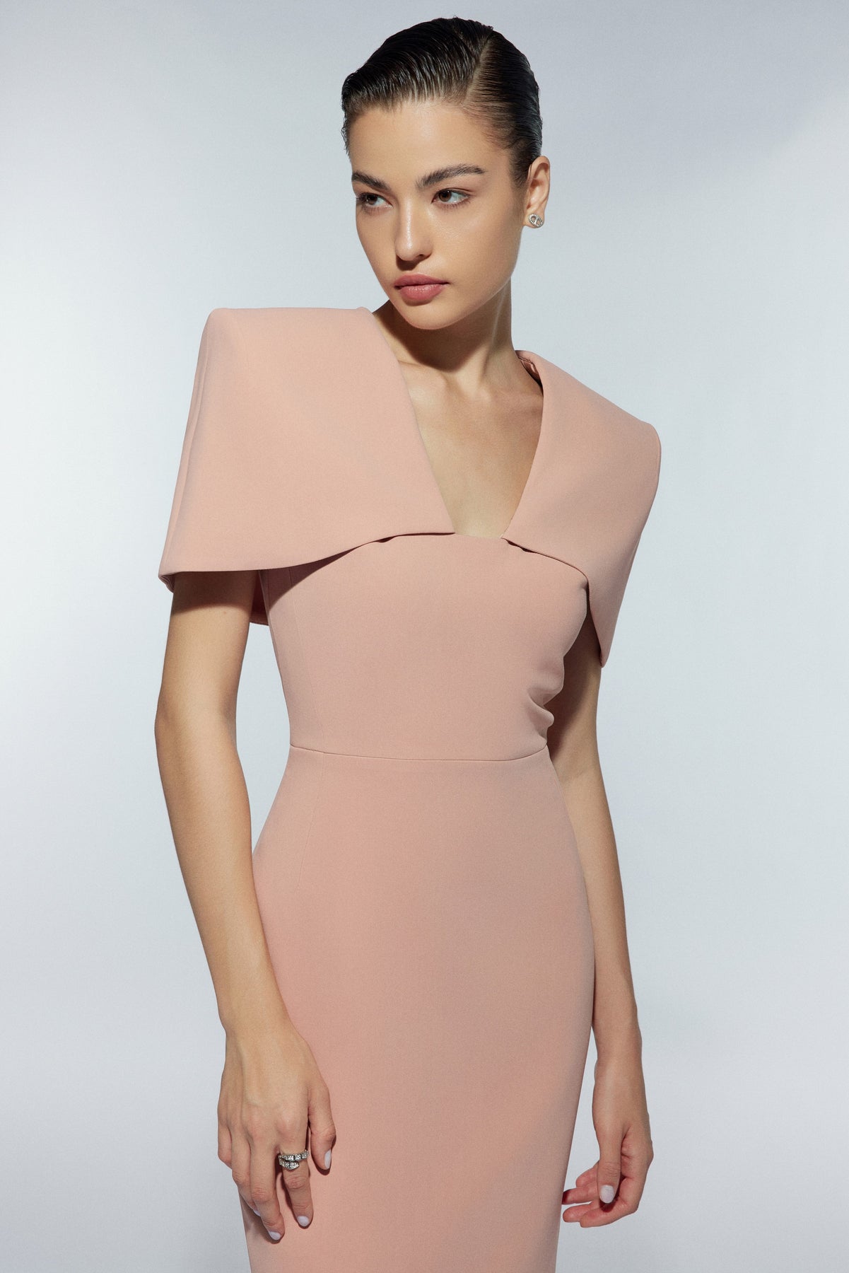 A blush-toned midi dress featuring a sculpted silhouette with bold cape-inspired shoulders and a deep V neckline—sophisticated minimalism with a modern architectural edge.
