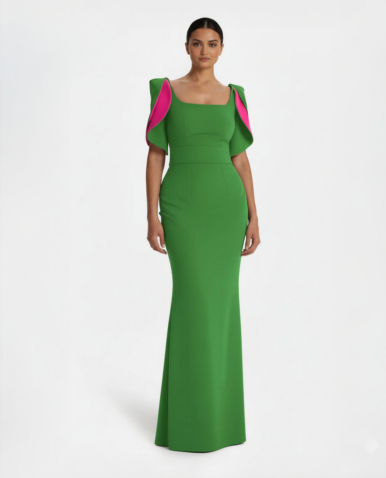Striking column gown in vivid green, defined by bold fuchsia-lined petal sleeves and a structured square neckline. The dramatic color pairing and sculpted silhouette create a standout look for upscale soirées and fashion-forward events.