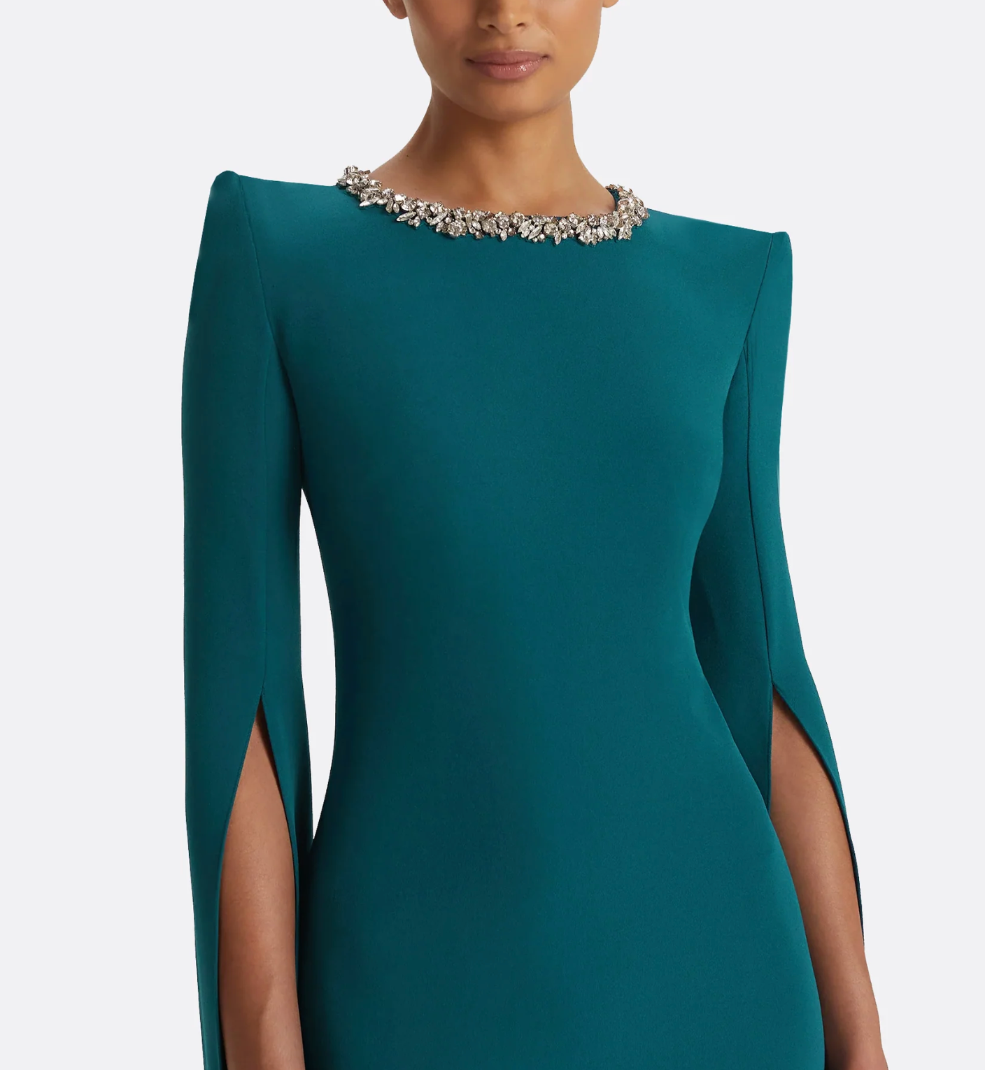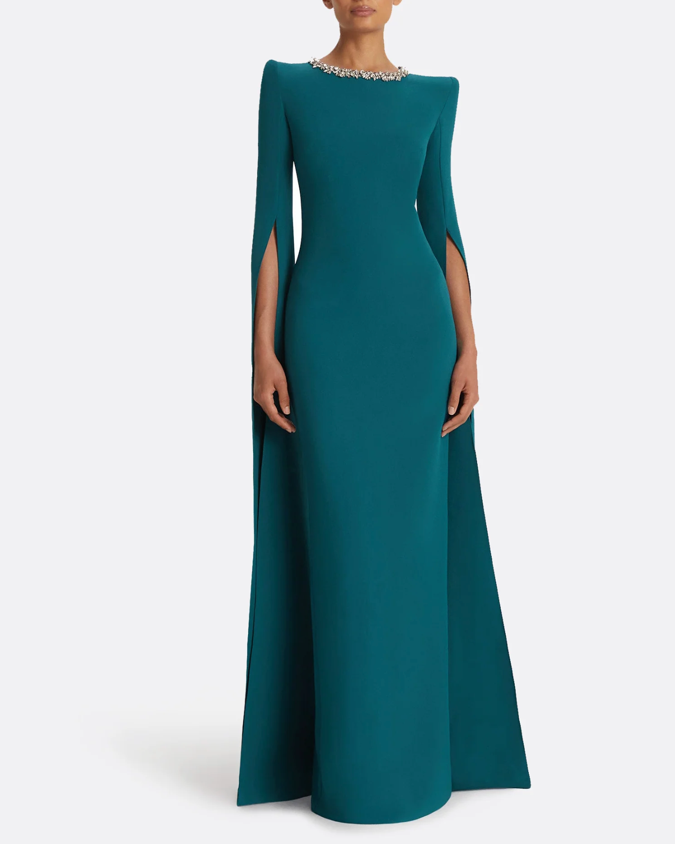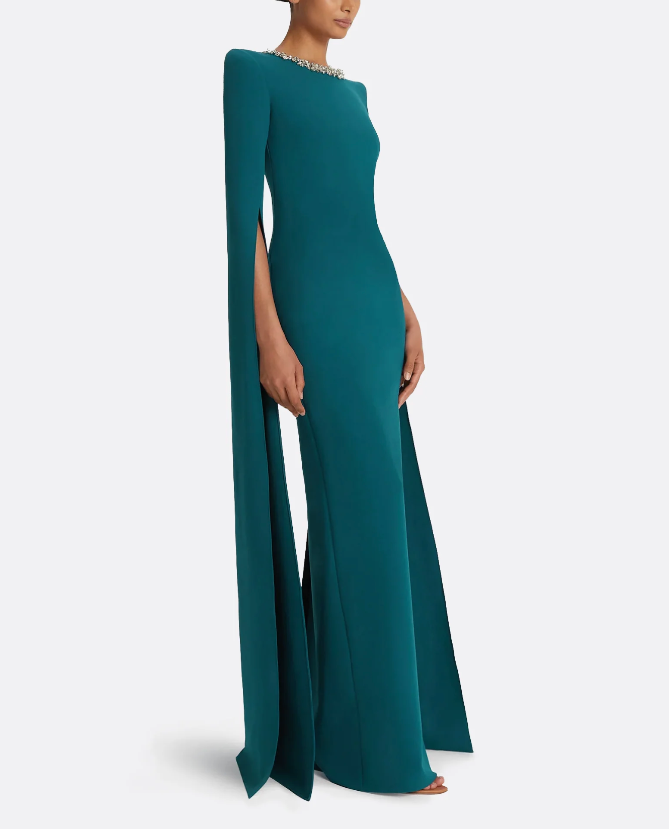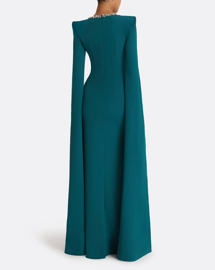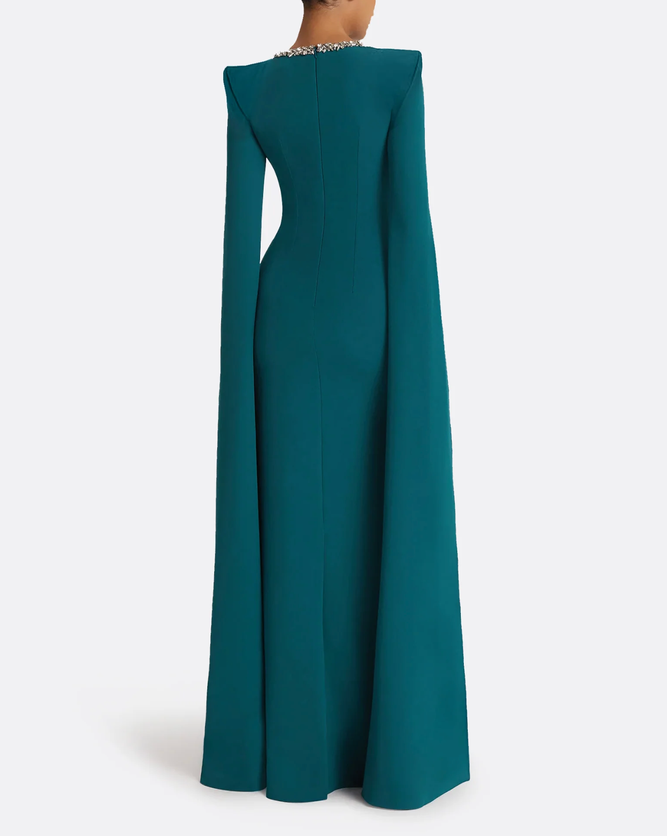 A regal teal gown featuring dramatic cape-style sleeves and a sleek silhouette, elevated with a sparkling crystal-embellished neckline. A statement of poise and modern glamour for formal evenings.