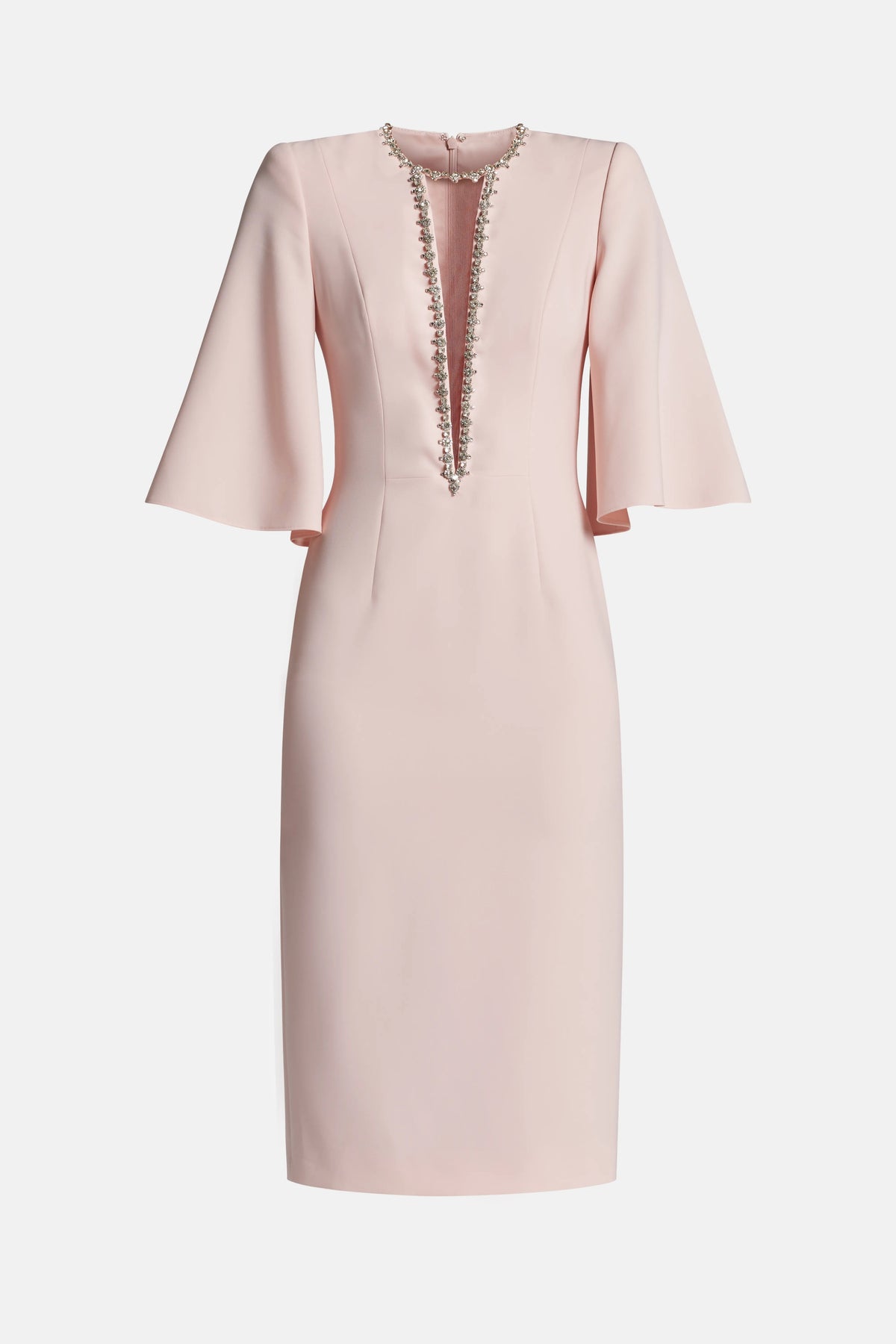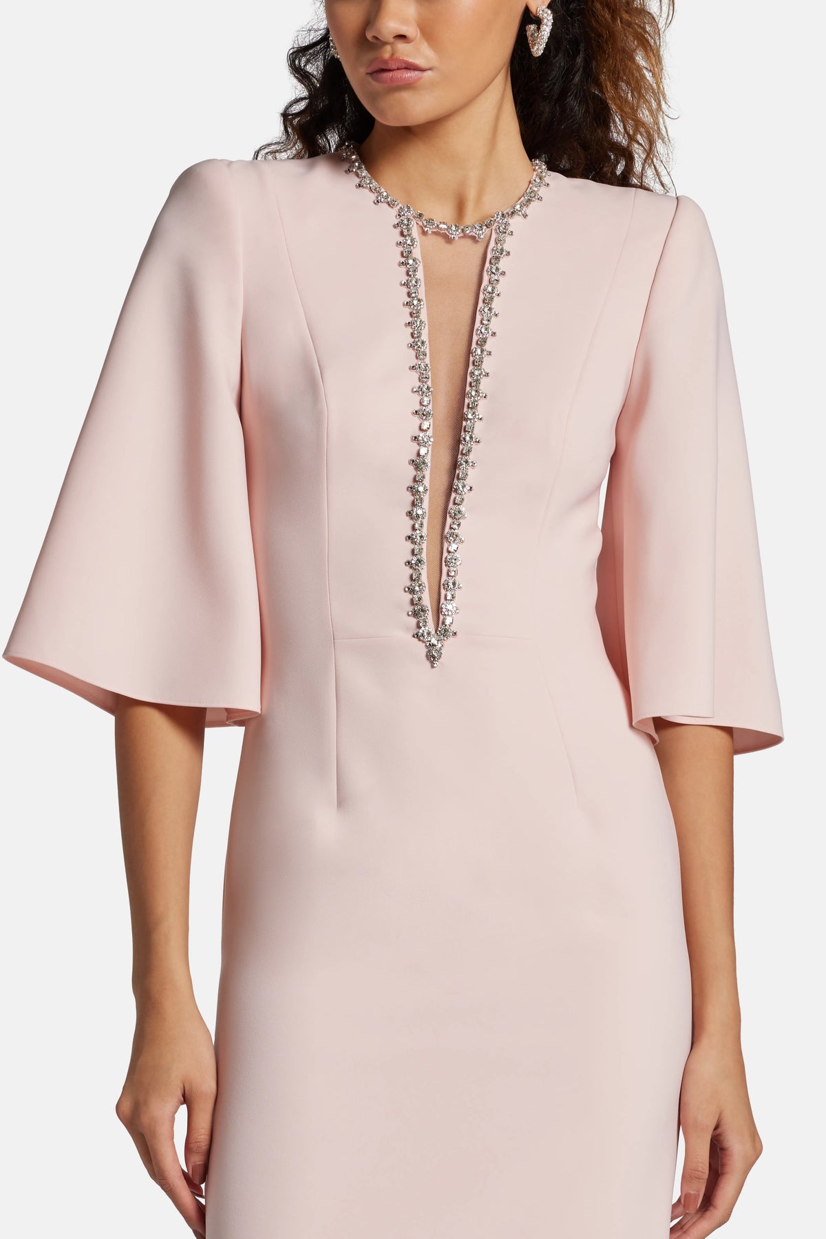 Elegant blush midi dress featuring a deep V neckline framed with crystal embellishments and flowing flared sleeves. Crafted in a sleek, tailored silhouette that flatters the figure—perfect for refined evening occasions.