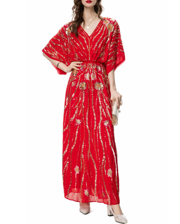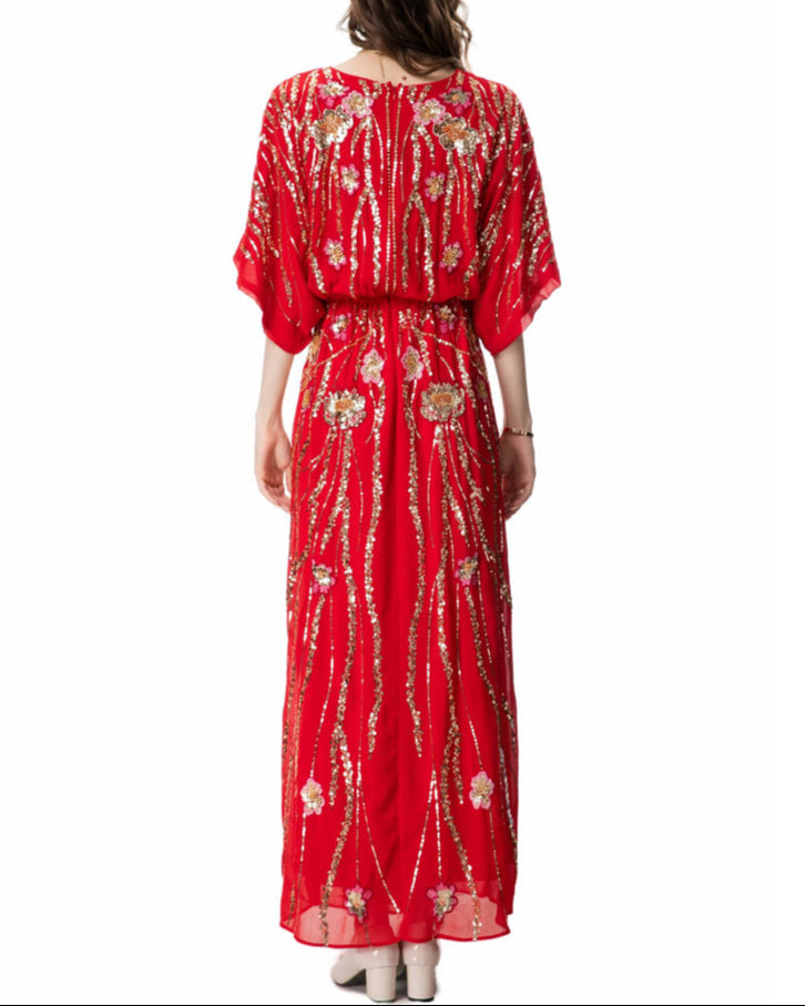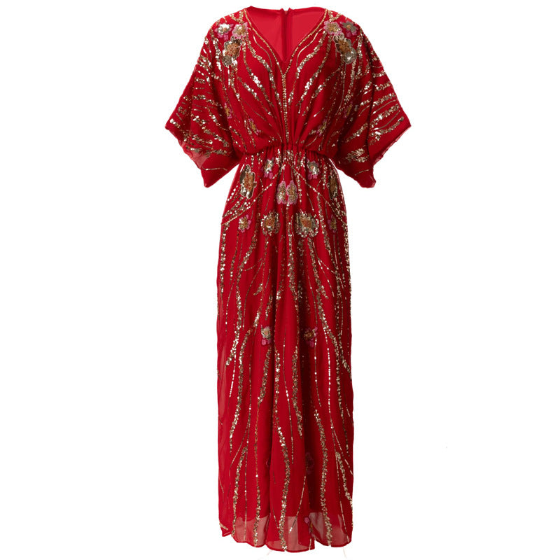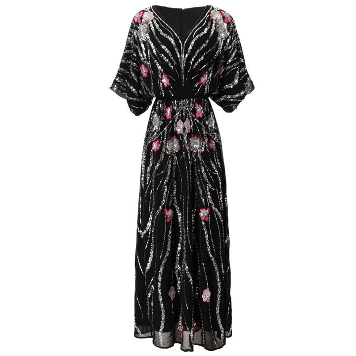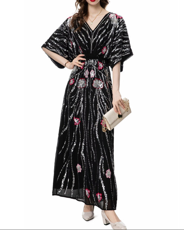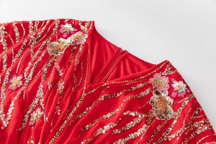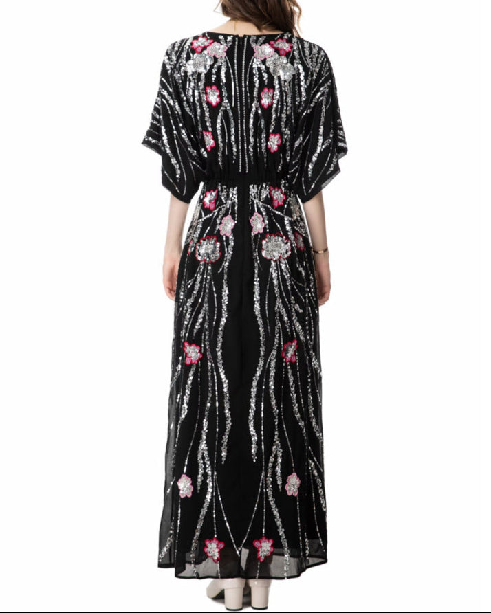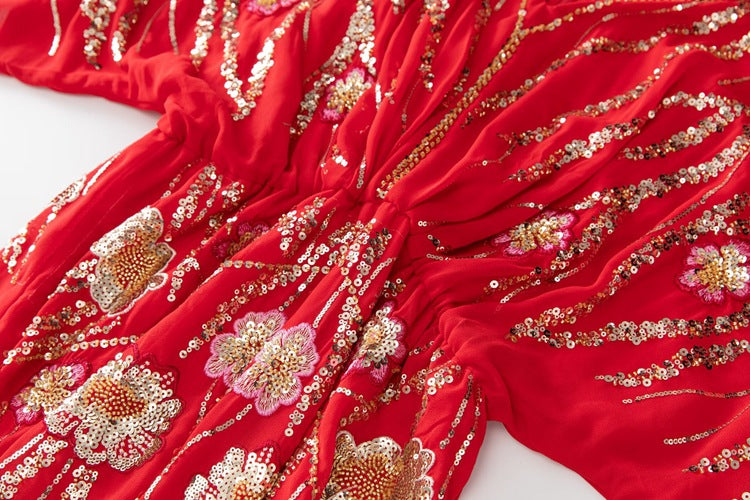 An elegant chiffon dress embellished with shimmering sequins and vibrant floral embroidery, it gracefully flows over a cinched waist and wide, flared sleeves. This dress exudes simple charm, perfect for special occasions and festive evenings.