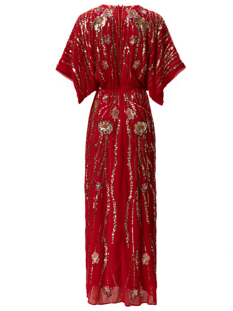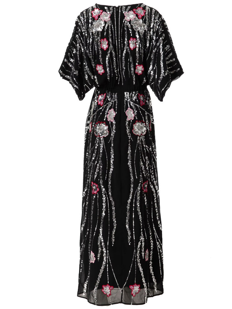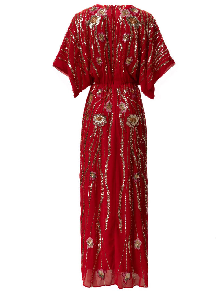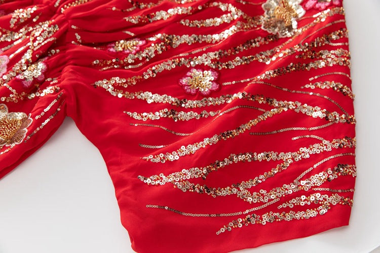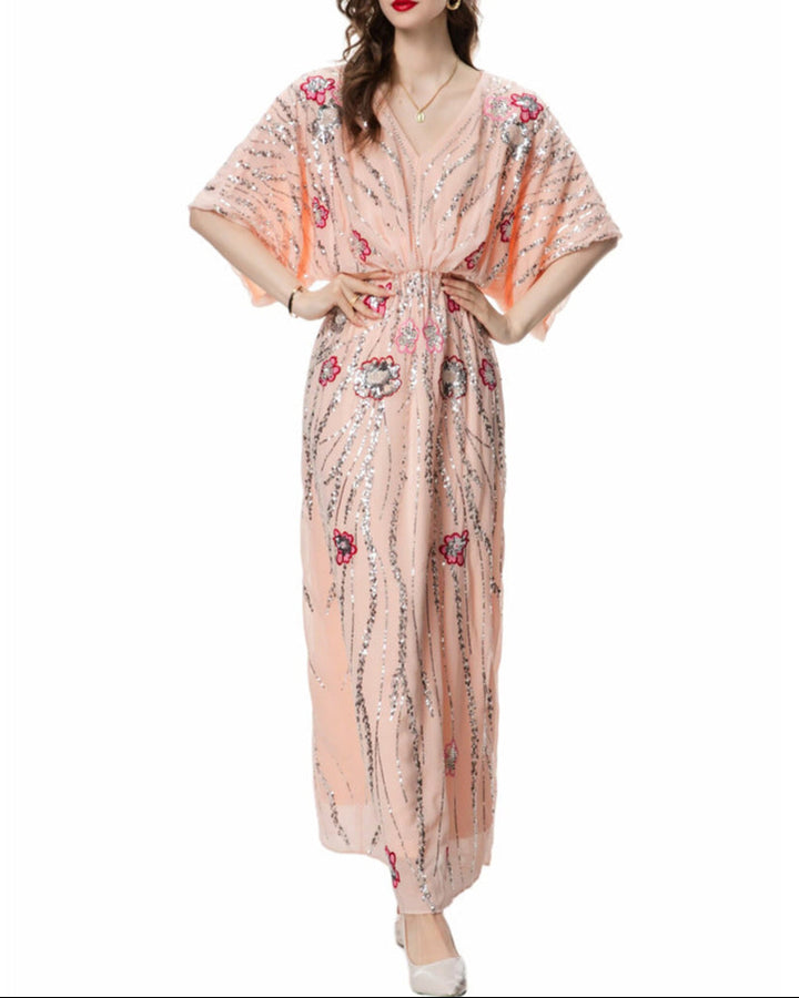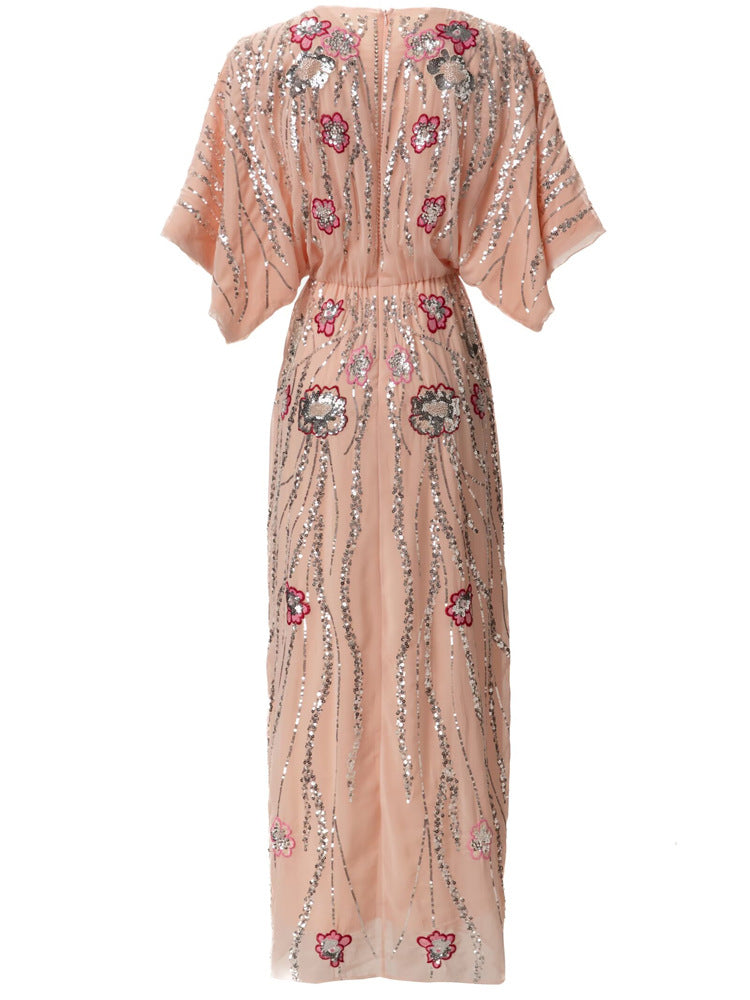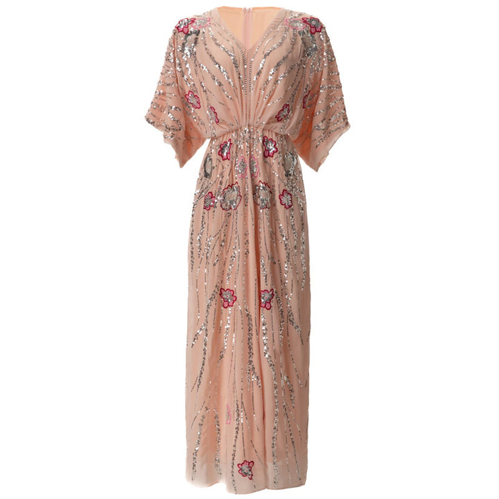 An elegant chiffon dress embellished with shimmering sequins and vibrant floral embroidery, it gracefully flows over a cinched waist and wide, flared sleeves. This dress exudes simple charm, perfect for special occasions and festive evenings.