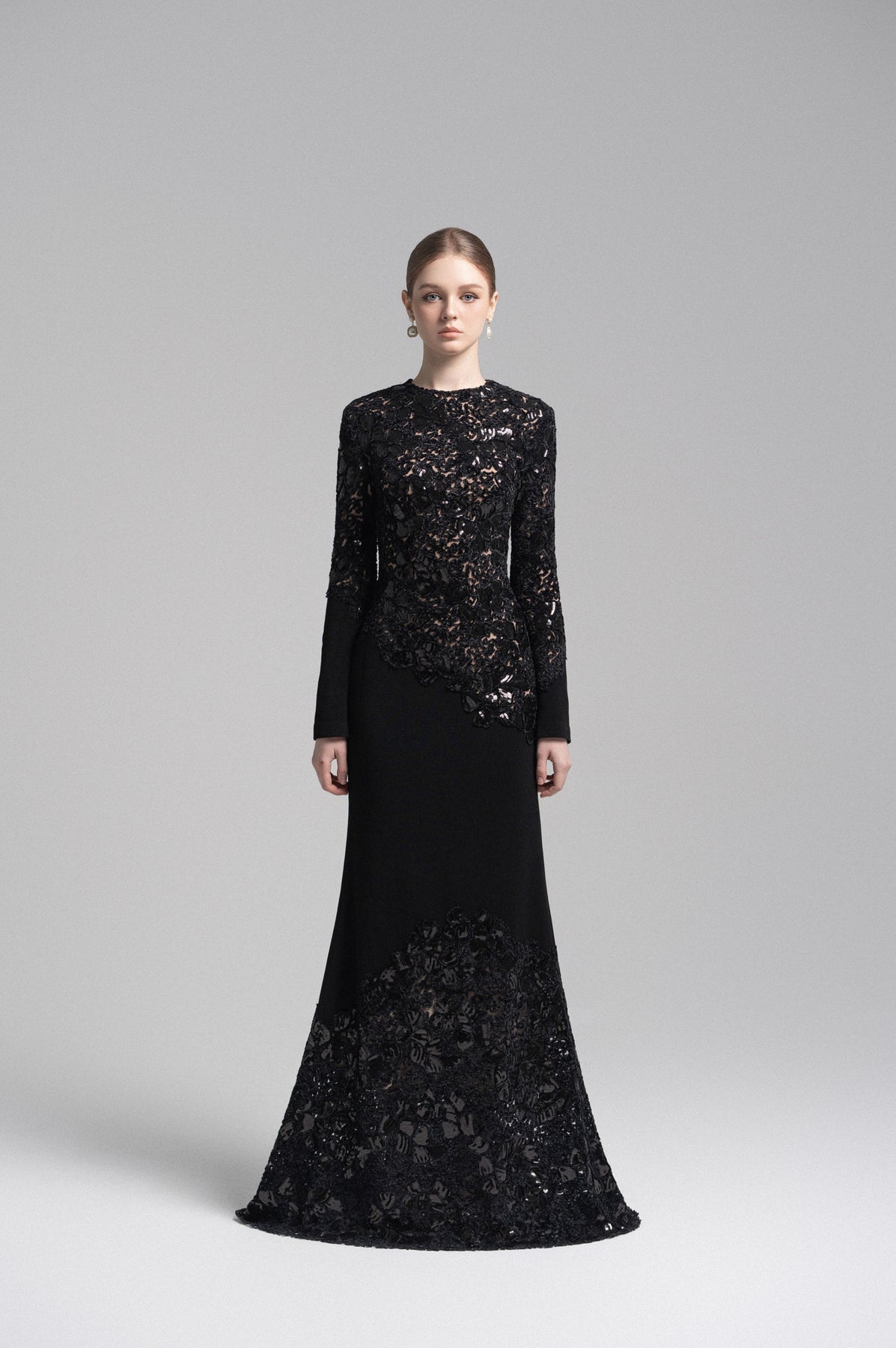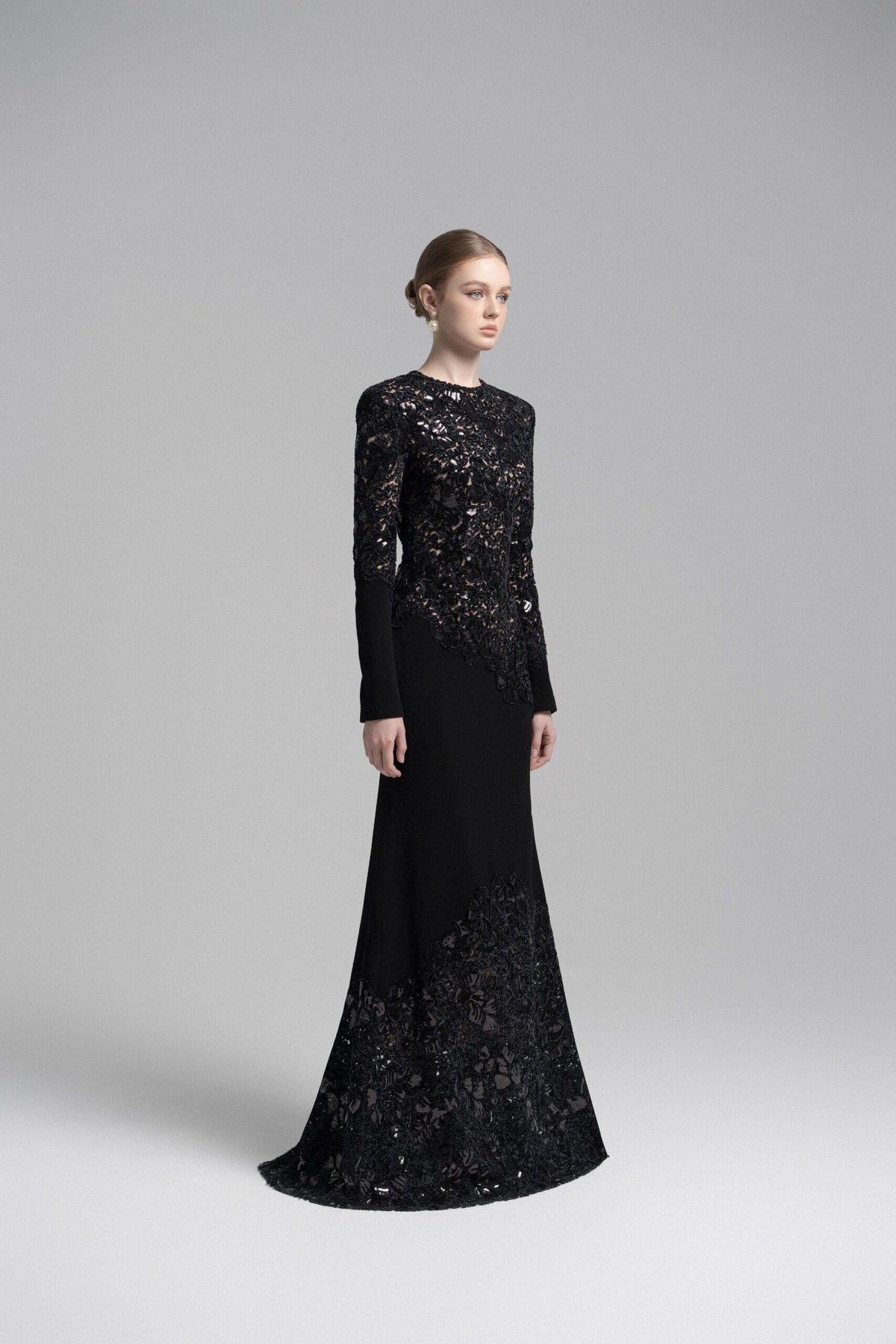 An exquisite ivory mermaid gown crafted with intricate lace panels that trace the bodice and hemline. Featuring a high neckline and fitted silhouette, this elegant piece radiates timeless sophistication—perfect for formal occasions or modern bridal elegance.