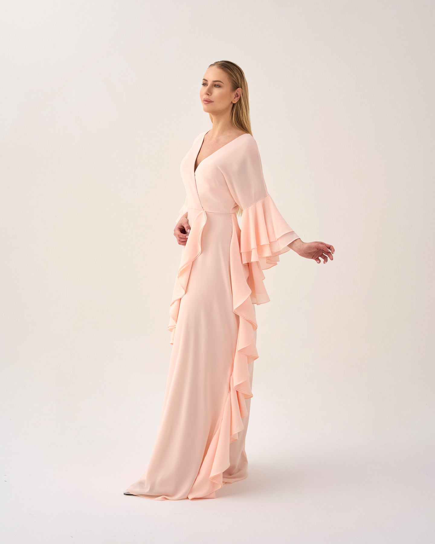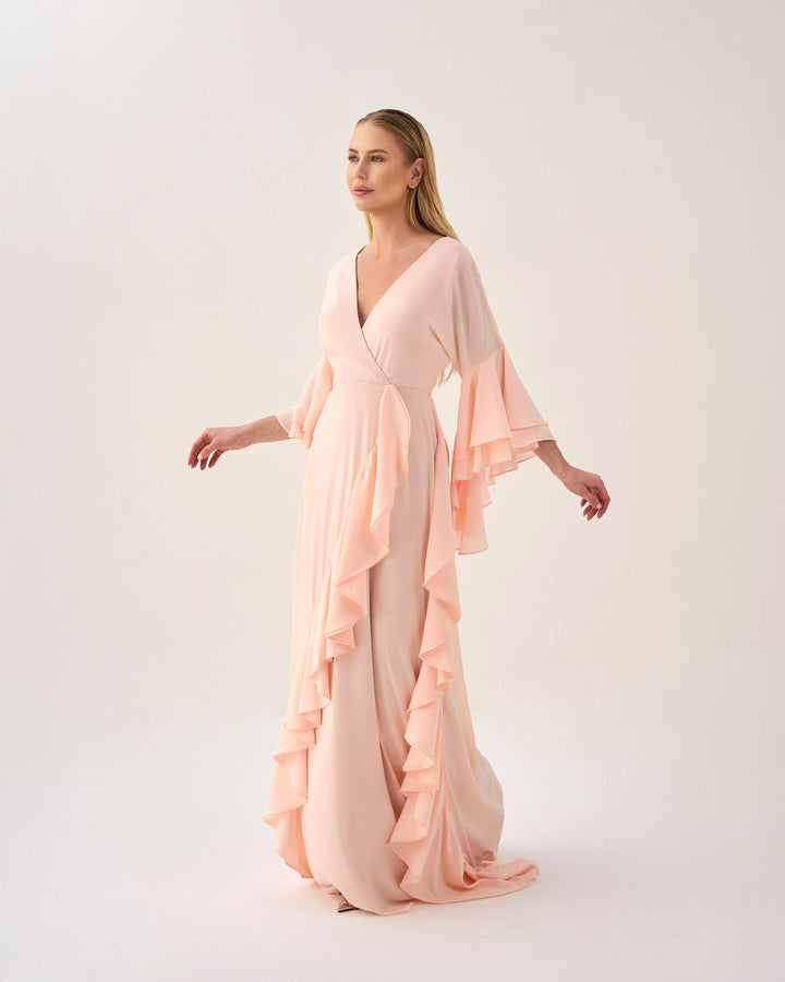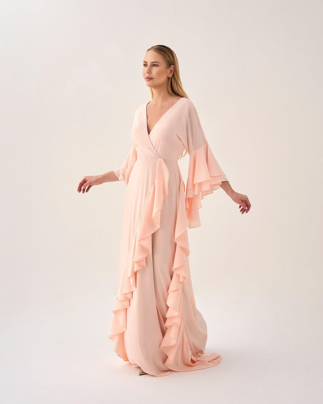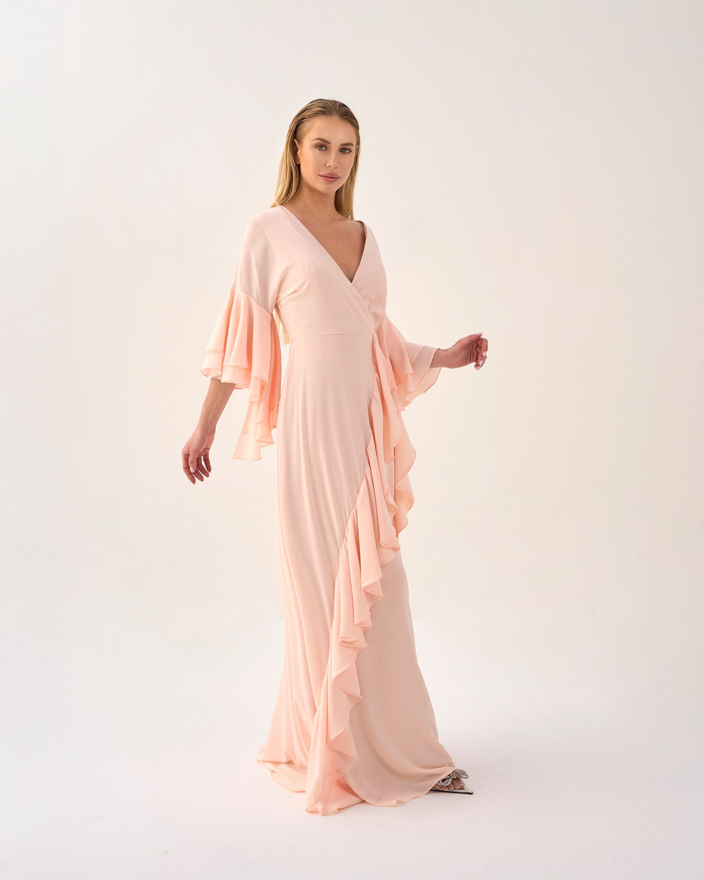 Soft peach gown featuring a flattering wrap-style bodice, cascading ruffle detailing, and flutter sleeves for a romantic and effortlessly feminine evening look.