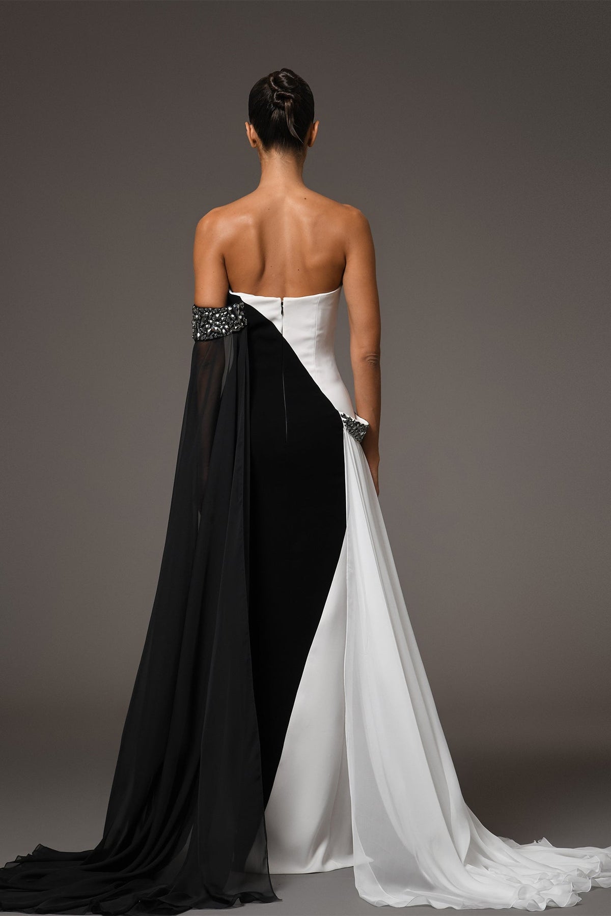A striking strapless evening gown crafted in a bold black-and-white palette for timeless elegance. The sculpted bodice flows into a fluid column silhouette, enhanced by contrasting draped panels and a subtle front slit for graceful movement. Crystal embellishments at the waist and shoulder add a refined touch of sparkle, making this gown a perfect choice for formal evenings, galas, and statement occasions where modern sophistication takes center stage.