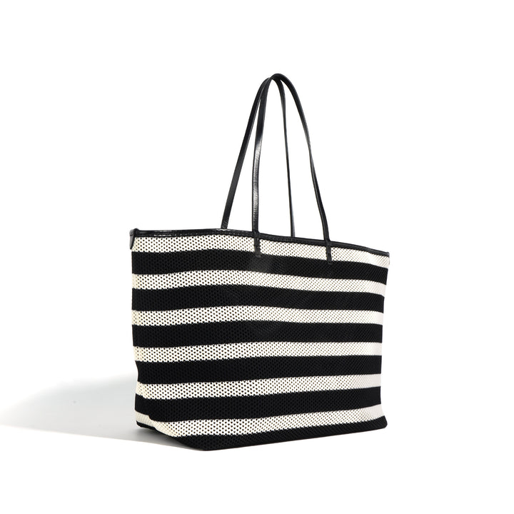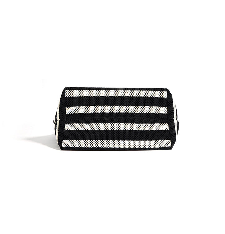Mooi sculpturaal, deze zwart-witte geweven tas heeft een gebogen silhouet, gestructureerde bovenhandvatten en strakke zwarte biezen. Een lichte maar gedurfde metgezel voor je dagelijkse benodigdheden.