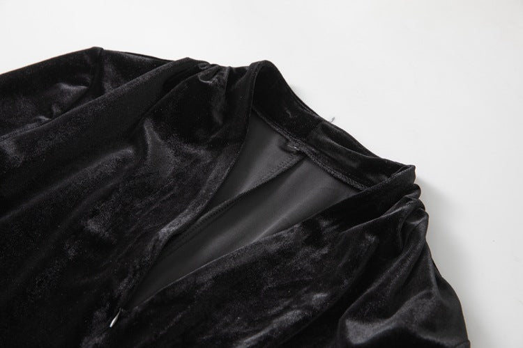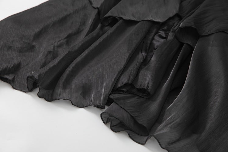 A dramatic black evening gown blending plush velvet with cascading layers of sheer organza. Designed with a deep V neckline and a flowing asymmetrical skirt, this piece embodies timeless glamour and sophistication for elegant soirées.