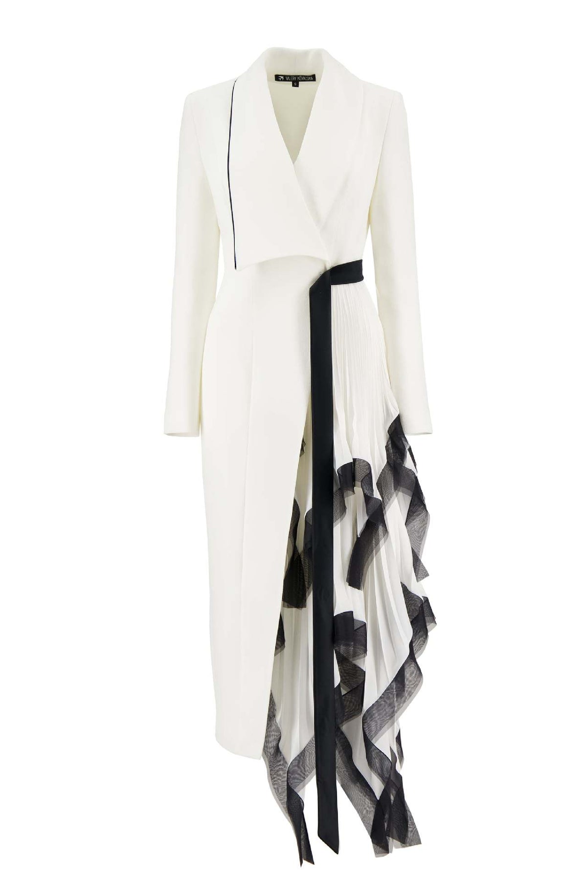 Elegant asymmetric wrap dress in crisp white, featuring a flowing design with black detailing and a pleated ruffle panel for a bold and modern look.