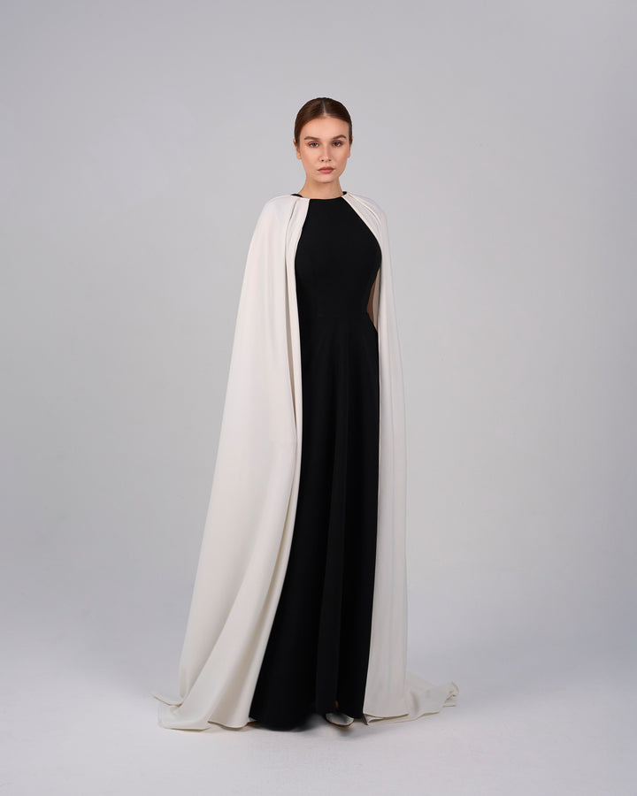 Minimalist floor-length black gown paired with a flowing ivory cape, creating a refined and dramatic monochrome statement for evening elegance.