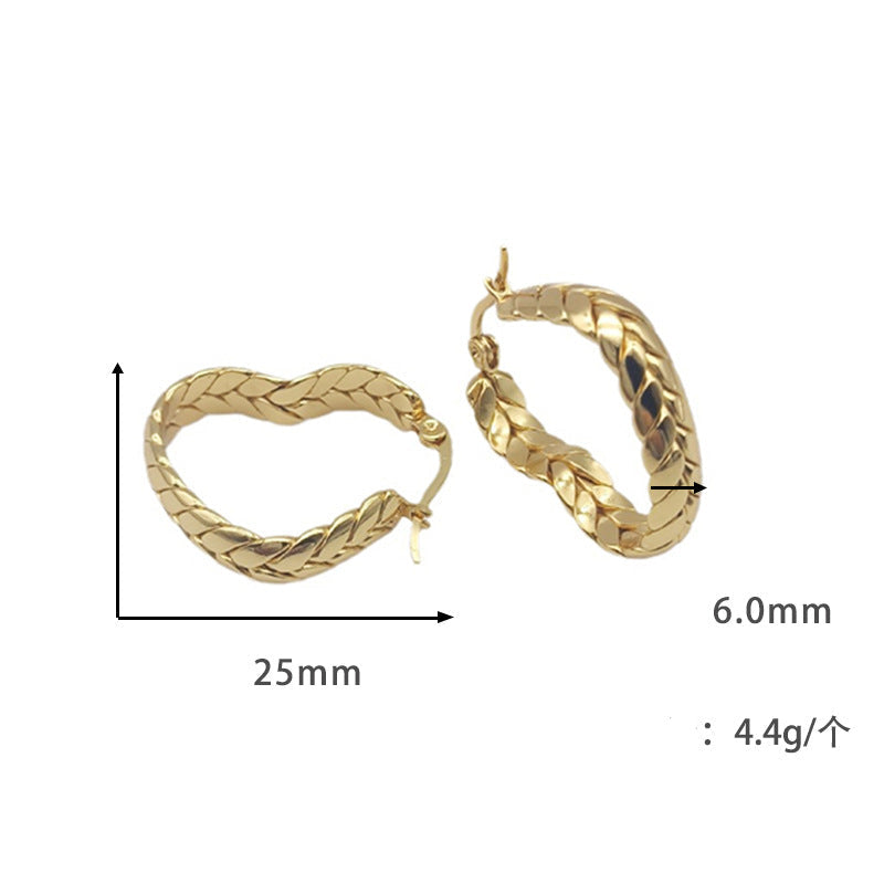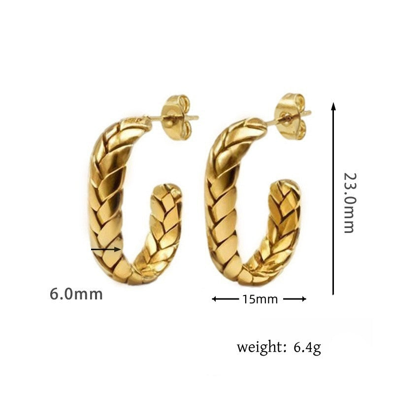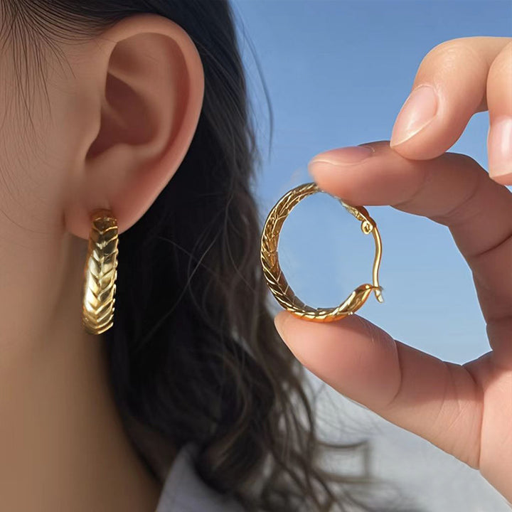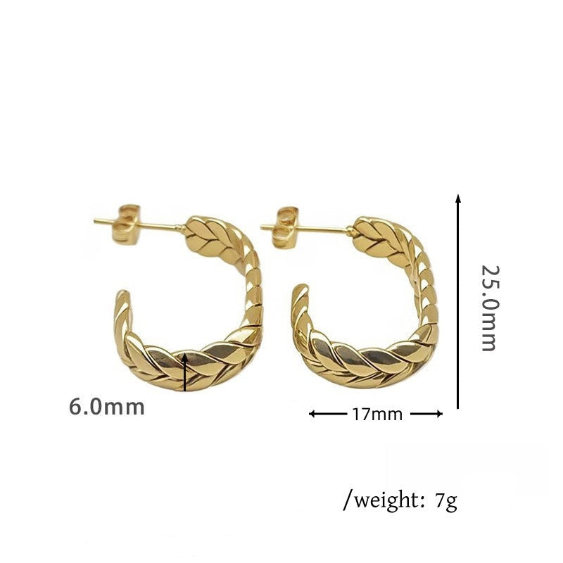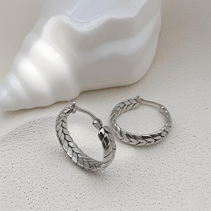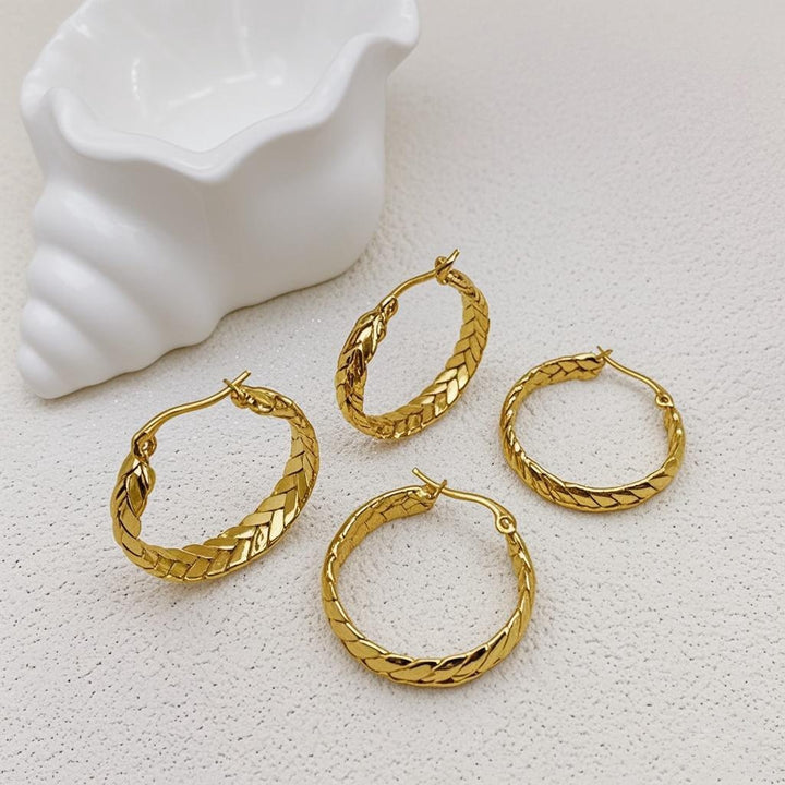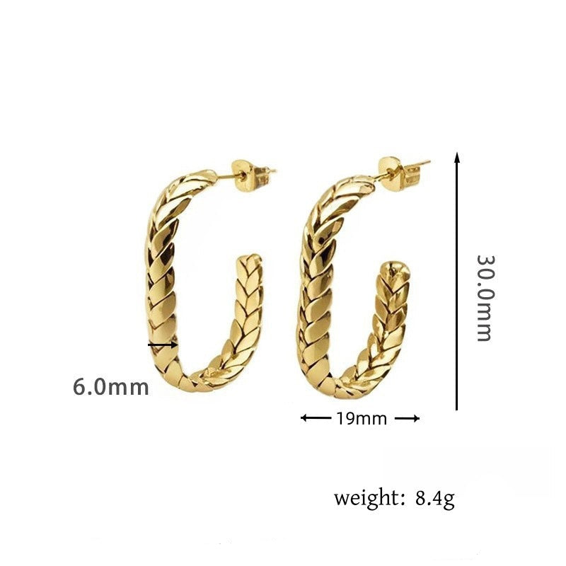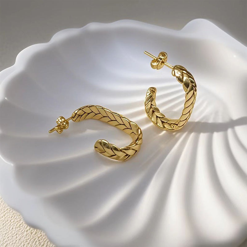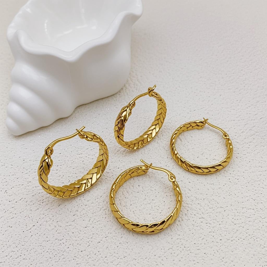 A pair of elegant gold-tone hoop earrings featuring a unique braided design that resembles intertwined leaves or a fishtail pattern. The hoops are medium-sized with a smooth, polished finish that reflects light beautifully, highlighting the intricate texture. Each earring is equipped with a secure hinged clasp for comfortable and safe wear. Displayed on a textured off-white surface next to a sculptural seashell-like decor piece, the earrings cast soft shadows that enhance their luxurious appeal. Perfect for both everyday elegance and special occasions, these earrings combine classic charm with a modern twist.