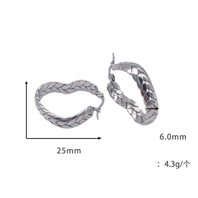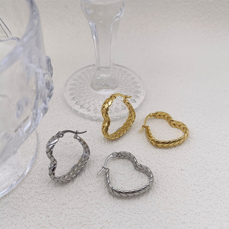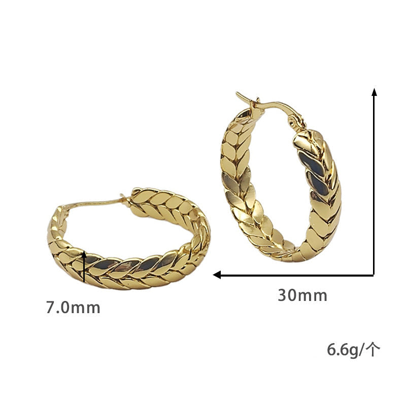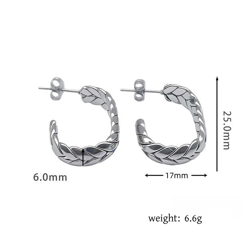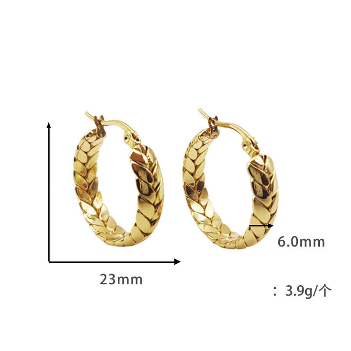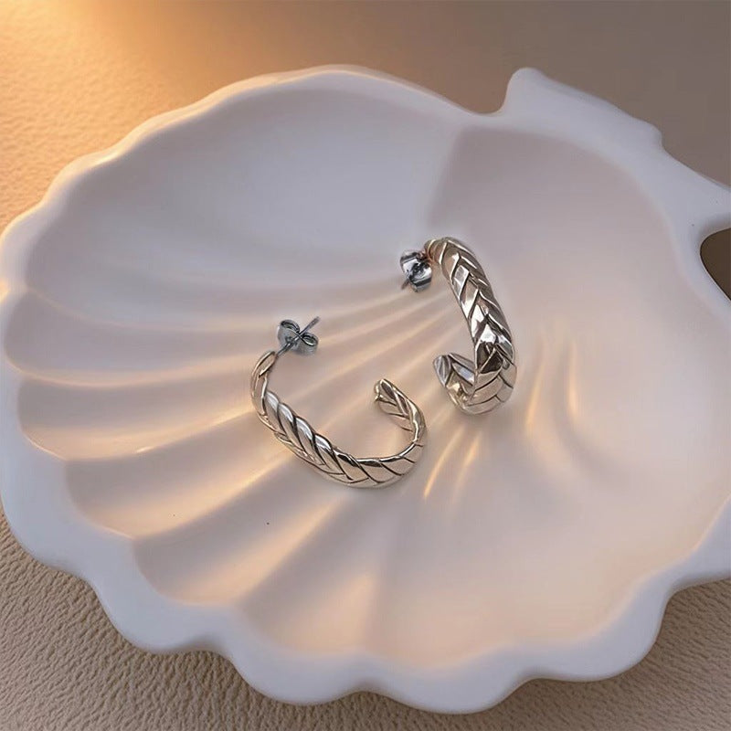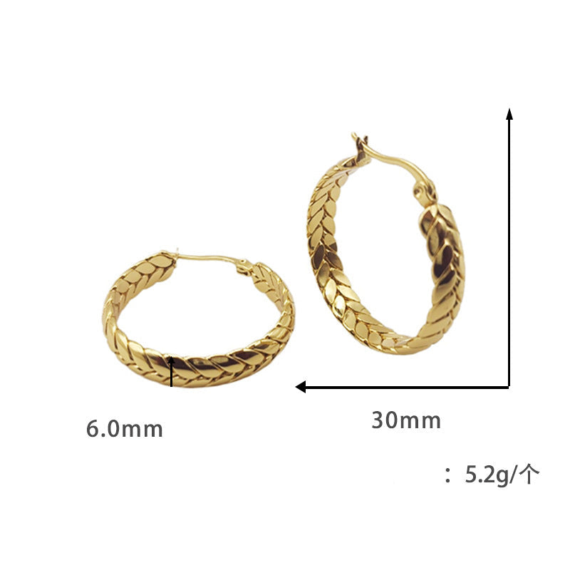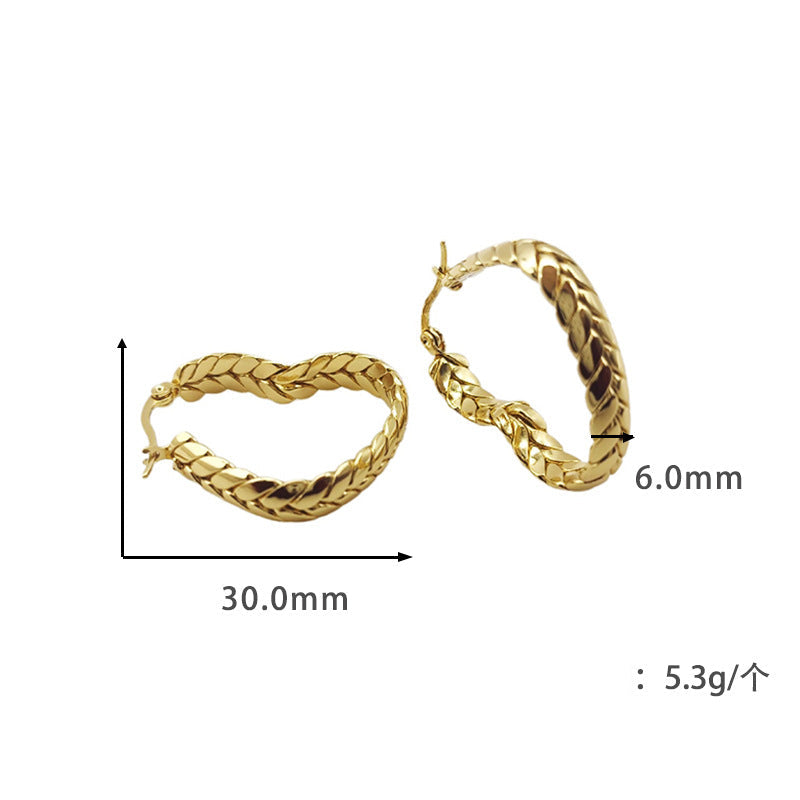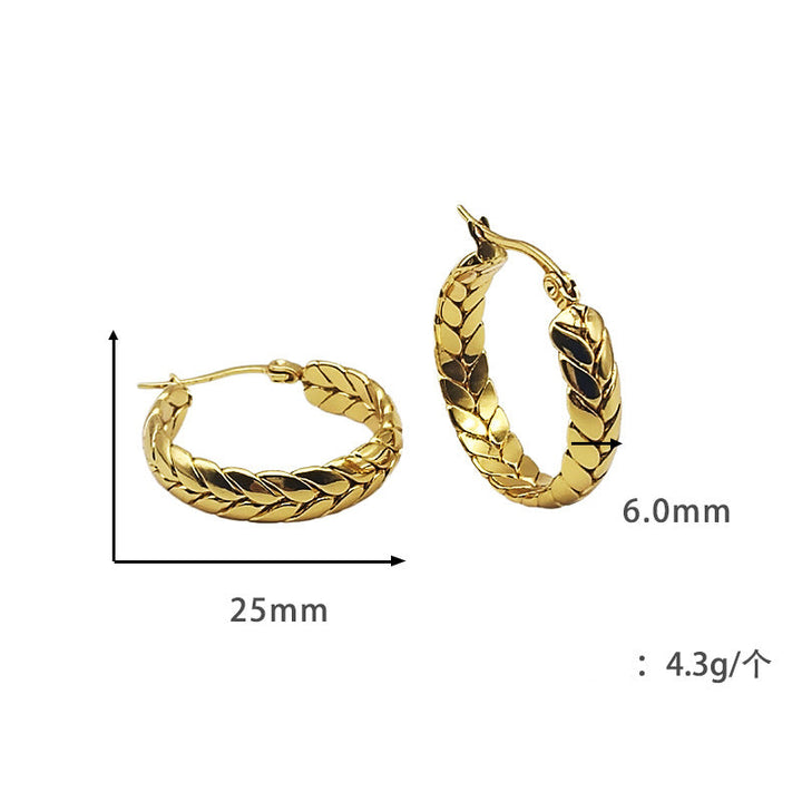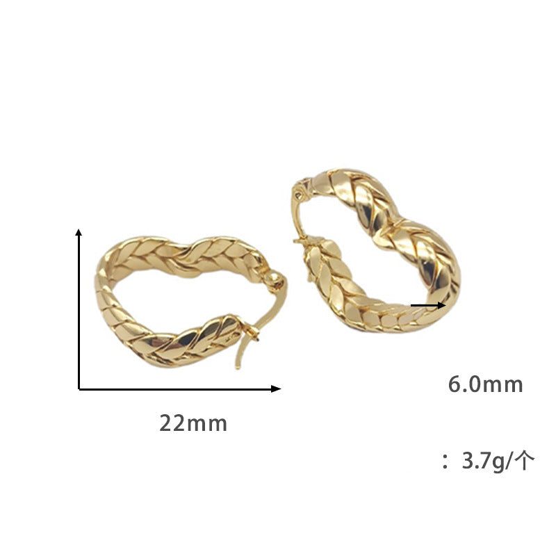 A pair of elegant gold-tone hoop earrings featuring a unique braided design that resembles intertwined leaves or a fishtail pattern. The hoops are medium-sized with a smooth, polished finish that reflects light beautifully, highlighting the intricate texture. Each earring is equipped with a secure hinged clasp for comfortable and safe wear. Displayed on a textured off-white surface next to a sculptural seashell-like decor piece, the earrings cast soft shadows that enhance their luxurious appeal. Perfect for both everyday elegance and special occasions, these earrings combine classic charm with a modern twist.