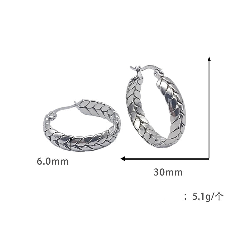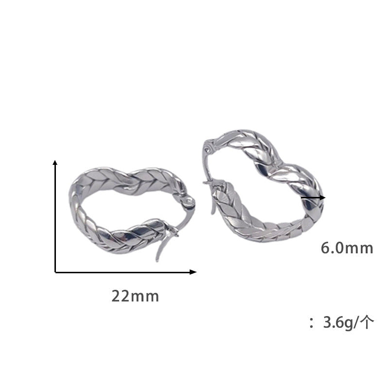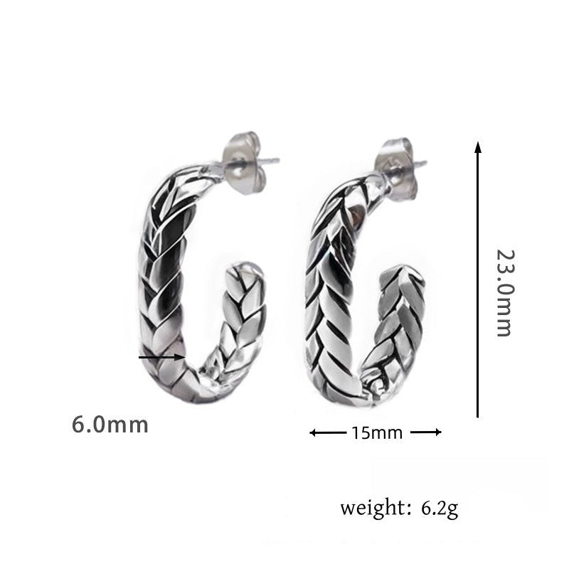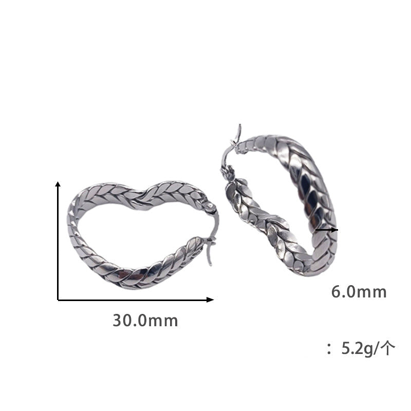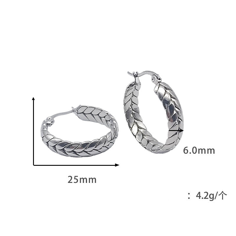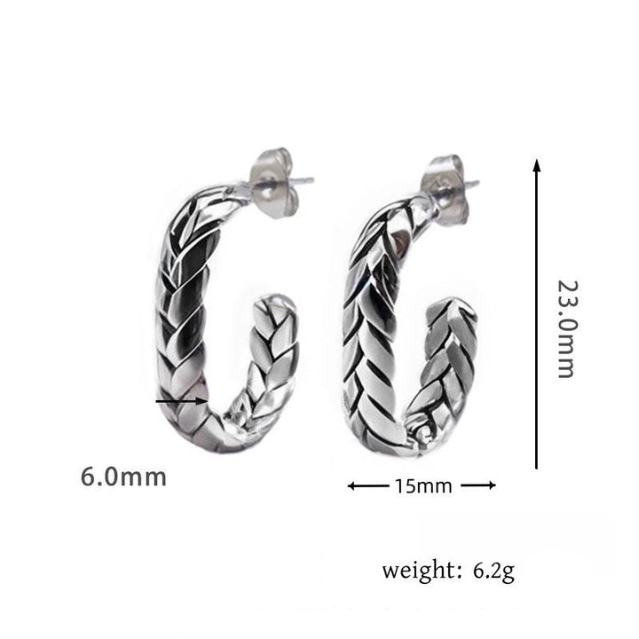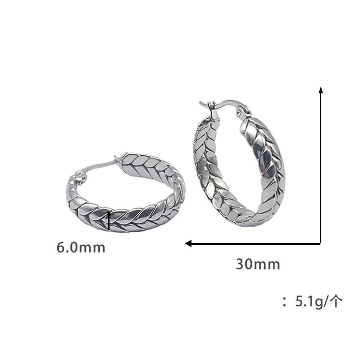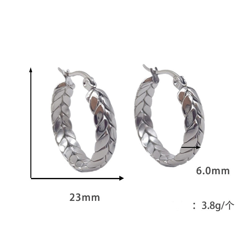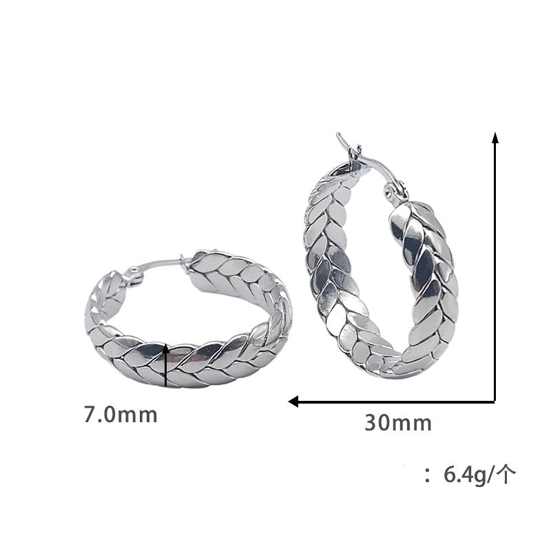 A pair of elegant gold-tone hoop earrings featuring a unique braided design that resembles intertwined leaves or a fishtail pattern. The hoops are medium-sized with a smooth, polished finish that reflects light beautifully, highlighting the intricate texture. Each earring is equipped with a secure hinged clasp for comfortable and safe wear. Displayed on a textured off-white surface next to a sculptural seashell-like decor piece, the earrings cast soft shadows that enhance their luxurious appeal. Perfect for both everyday elegance and special occasions, these earrings combine classic charm with a modern twist.