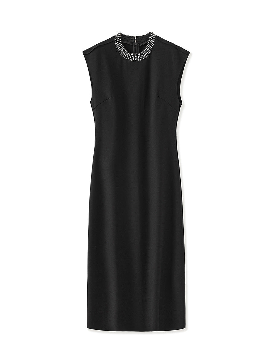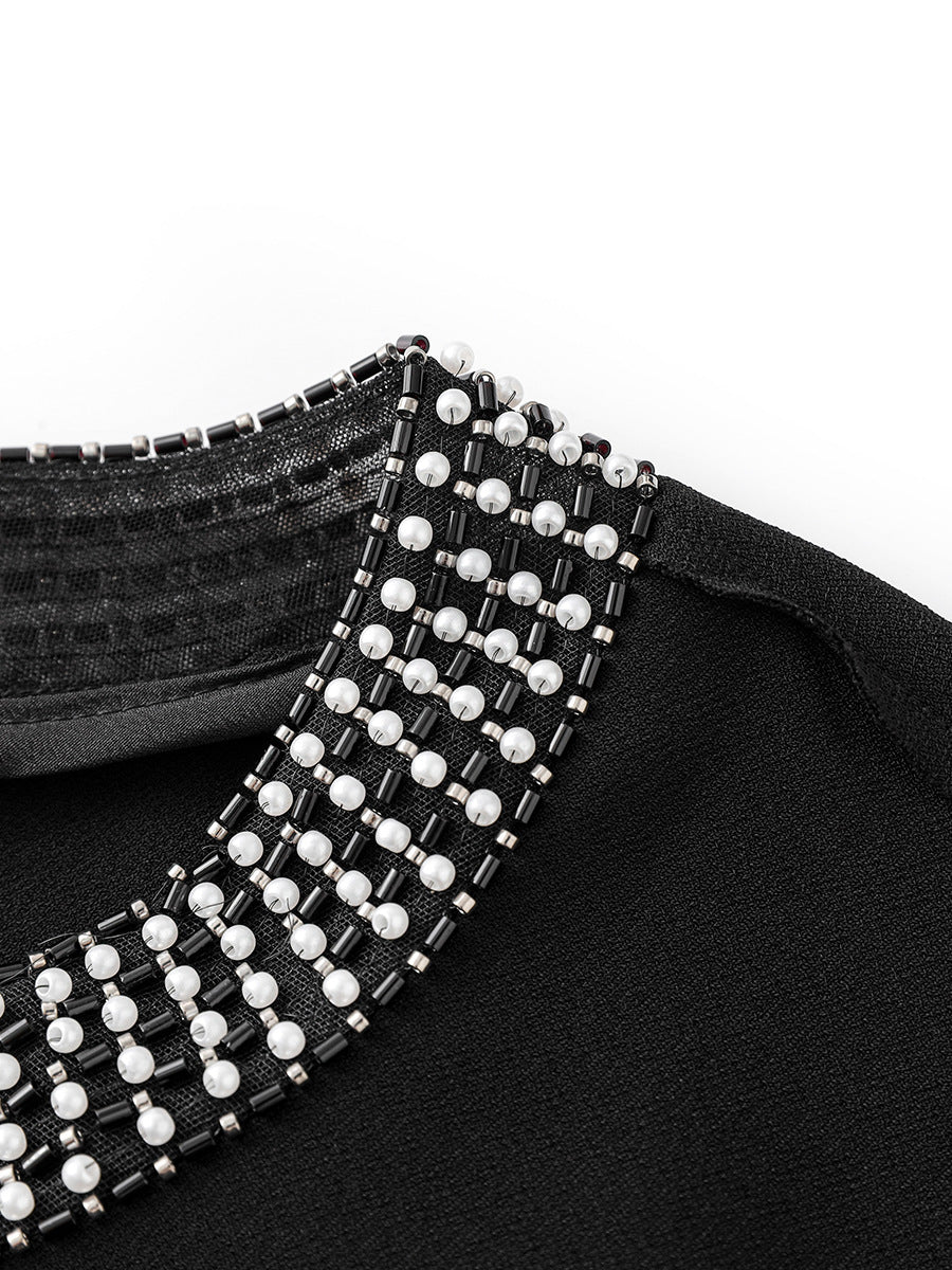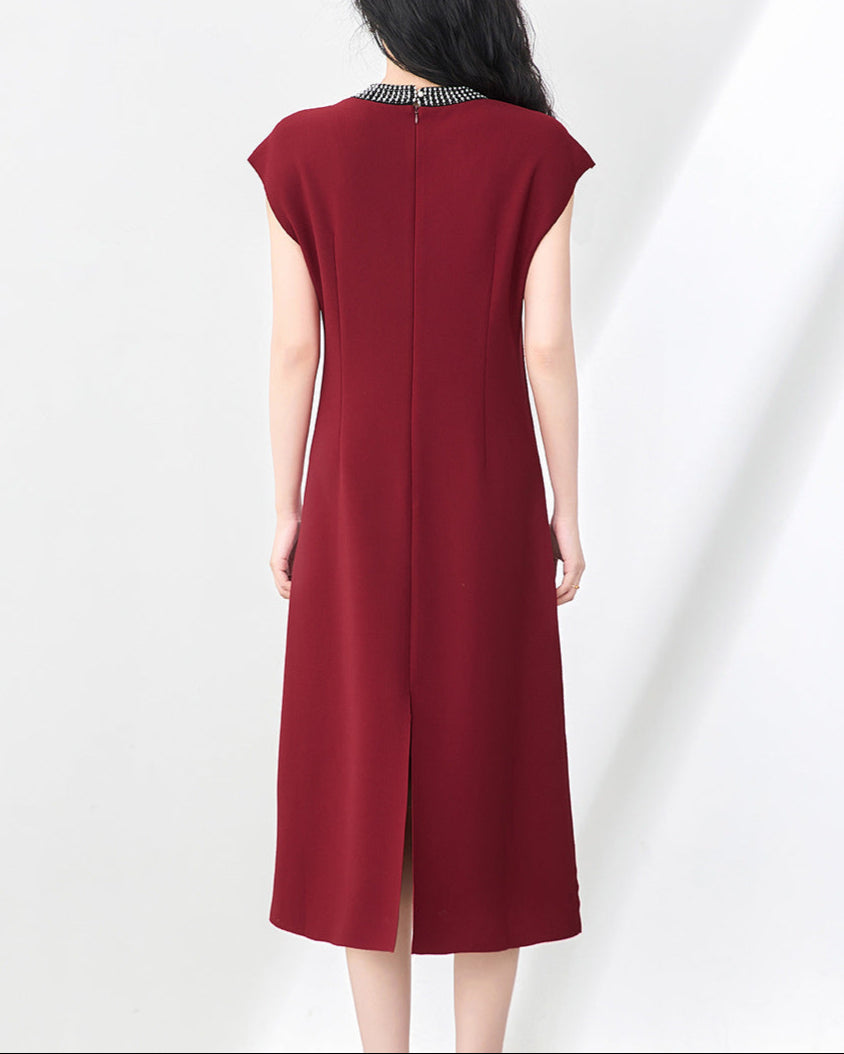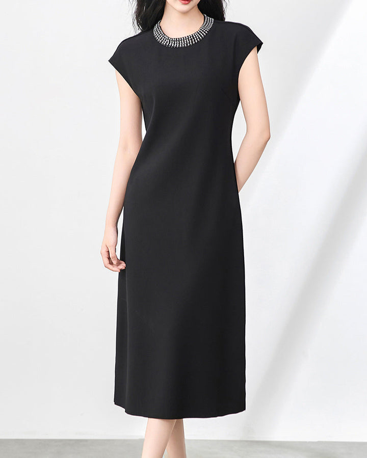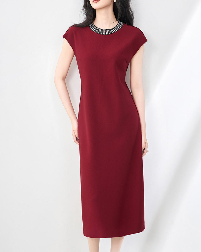 This elegant and simple dress features short sleeves, embellished with a beaded neckline, adding a touch of sparkle to its sleek design. It blends simple sophistication with delicate elegance.