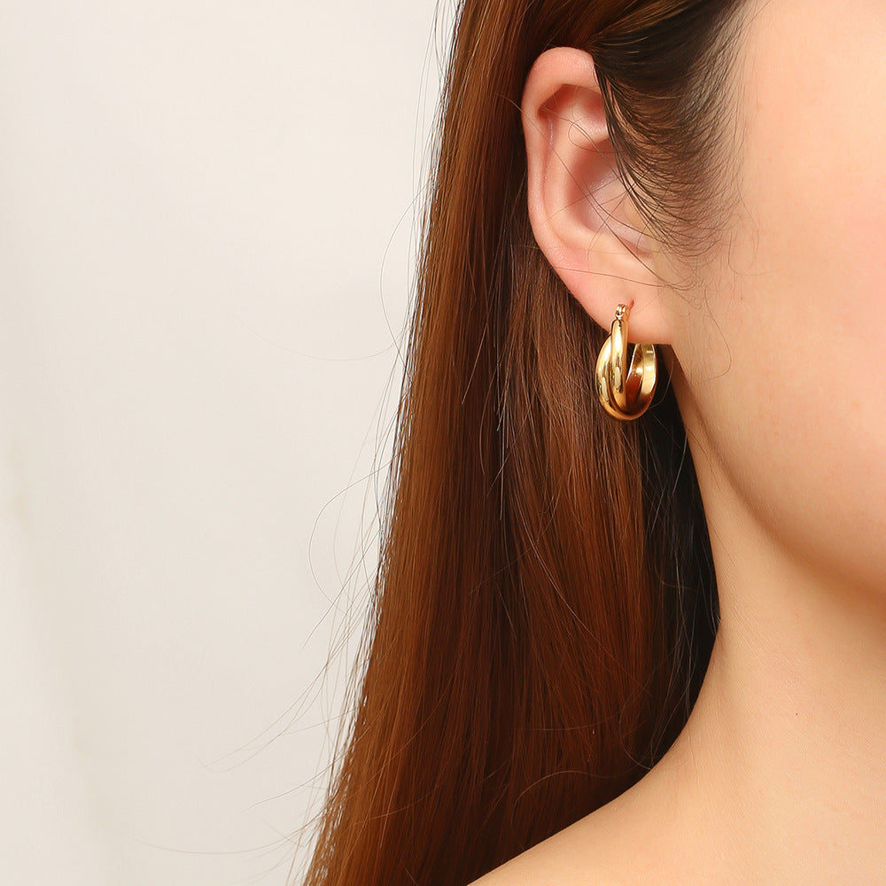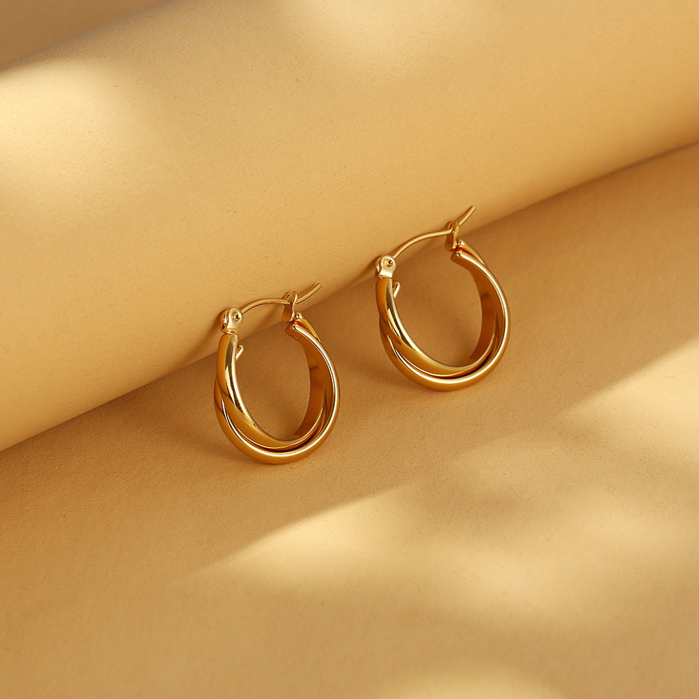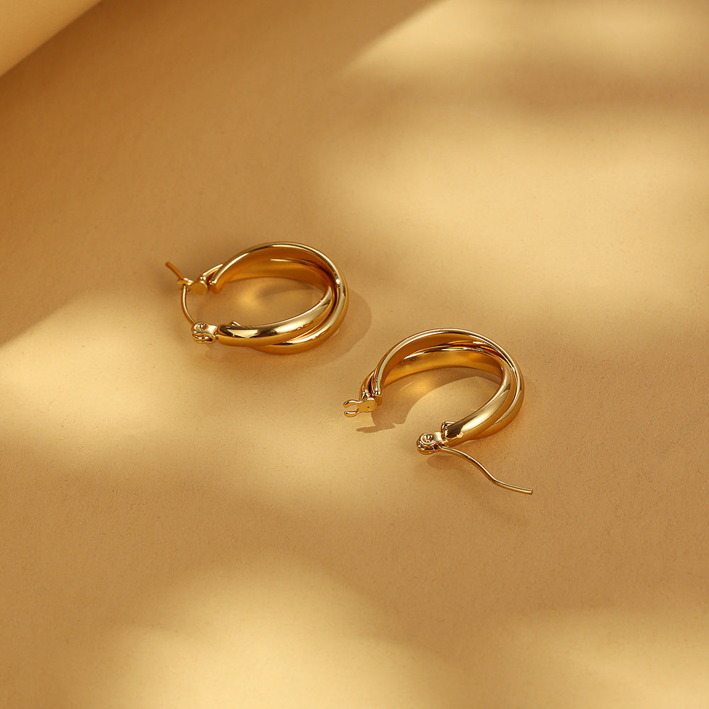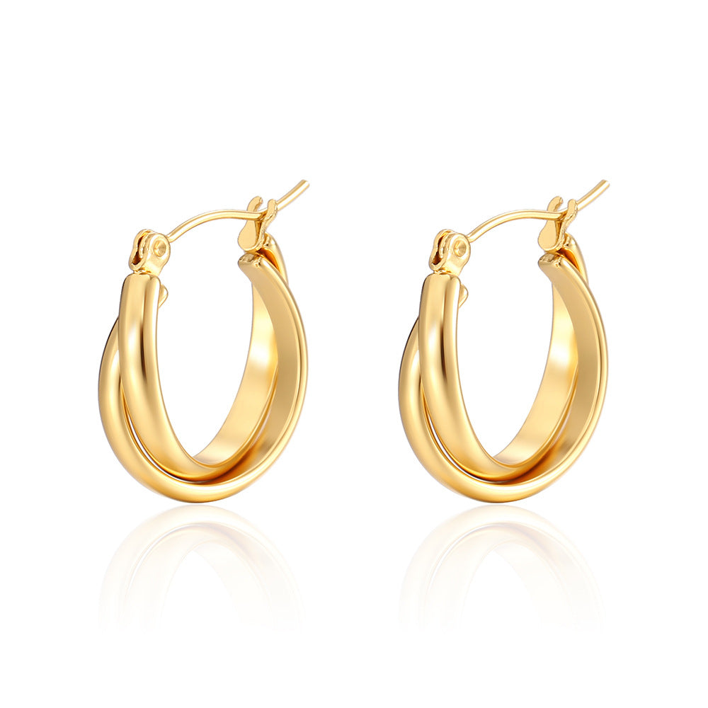 These elegant gold-tone earrings feature a double-layered hoop design that exudes sophistication and modern charm. Crafted with a polished finish, they catch the light beautifully, making them the perfect accessory to elevate both everyday and evening looks. Lightweight and versatile, these hoops offer a timeless silhouette with a contemporary twist.