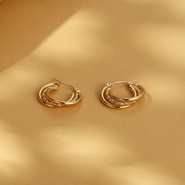 These elegant gold-toned earrings feature a double-hoop design with intricate etched detailing on the inner curve, adding depth and texture to a classic silhouette. Perfect for elevating both everyday and evening looks with a touch of vintage charm.