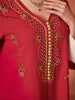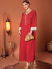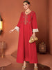 An elegant red maxi dress featuring delicate embroidery along the neckline and front, and chic white contrast sleeves. Perfect for festive gatherings and evening events.