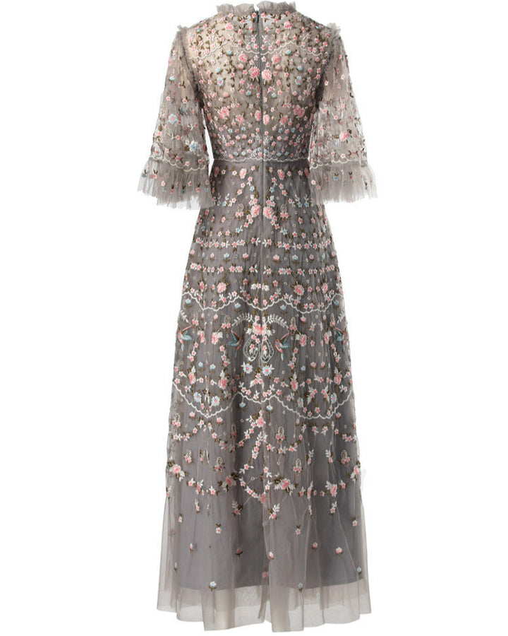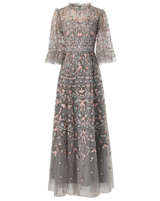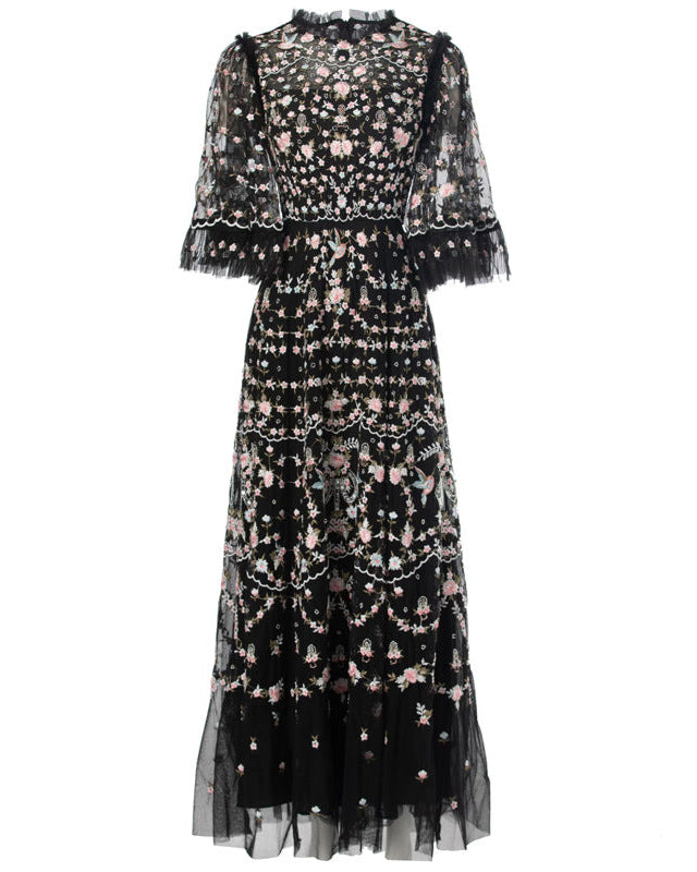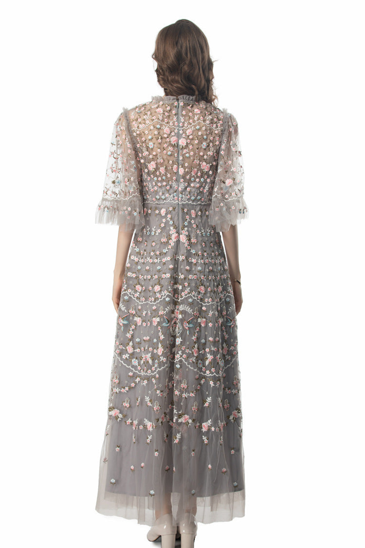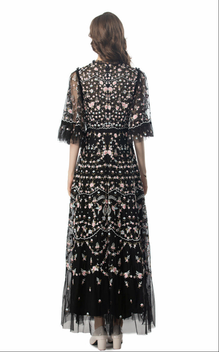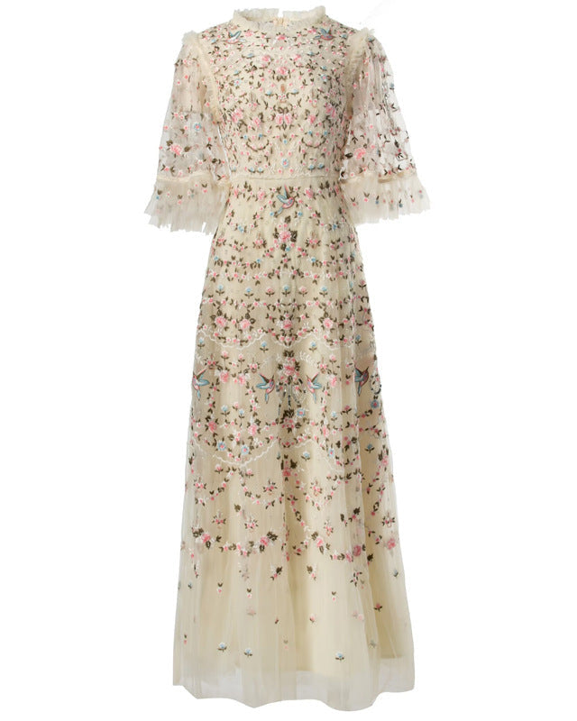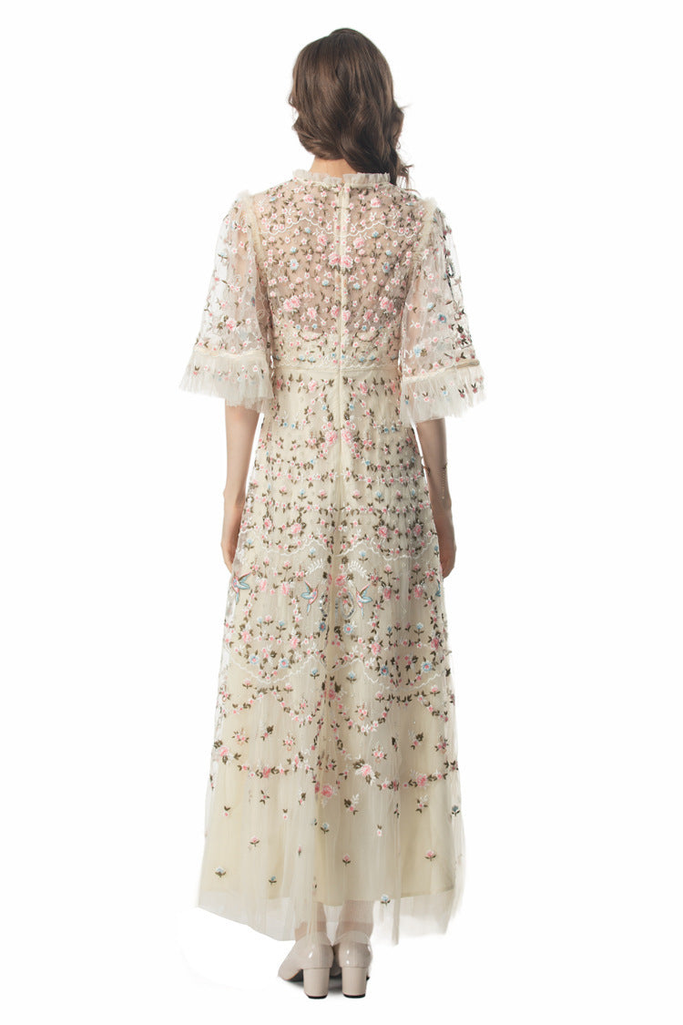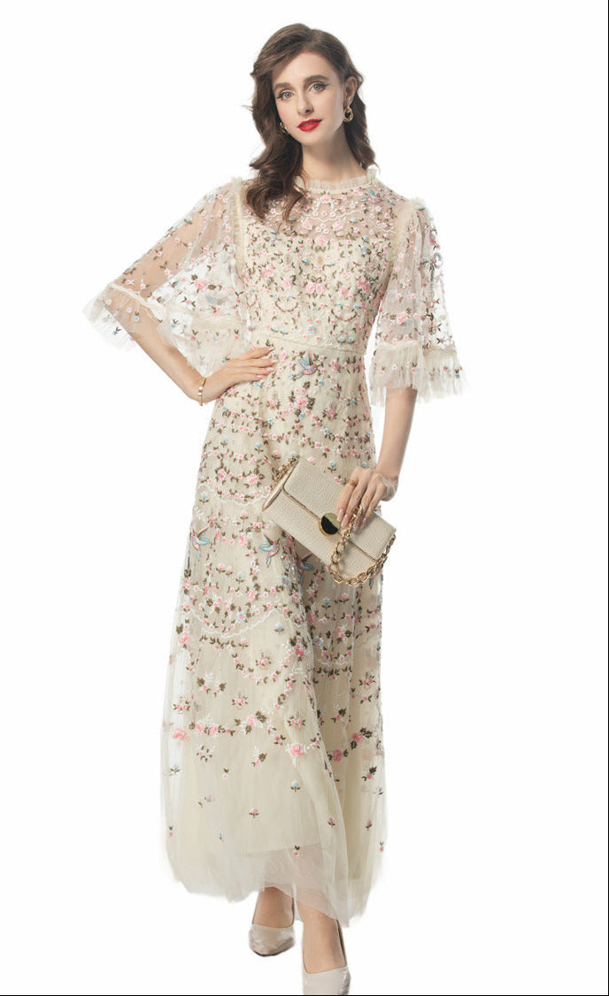 A romantic long dress, adorned with delicate floral embroidery and ruffled sleeves. Featuring a high neckline and a fitted waist, this delicate dress adds a timeless touch of elegance to a modern femininity.