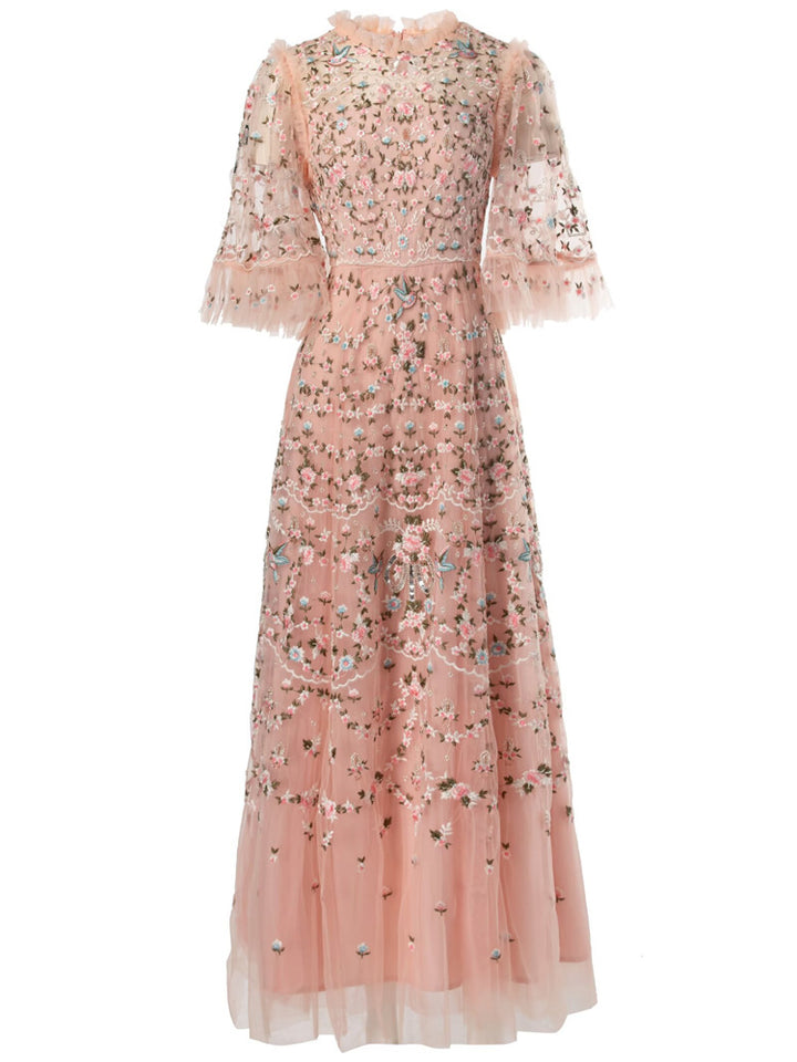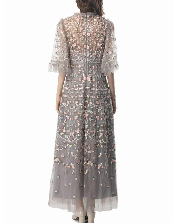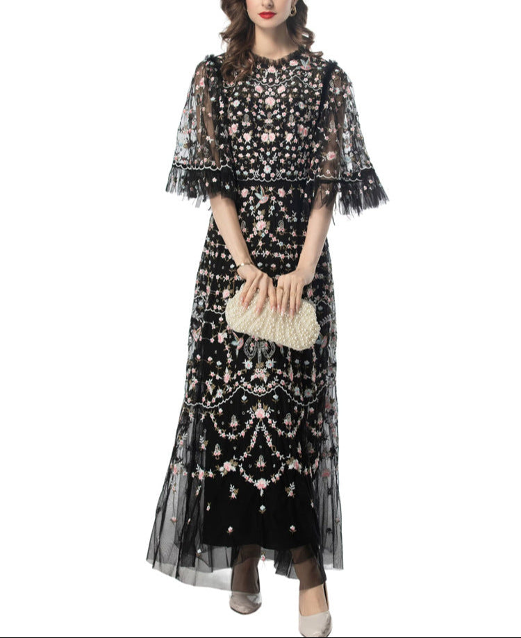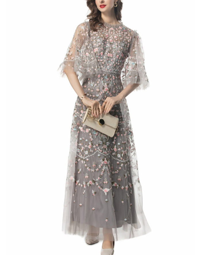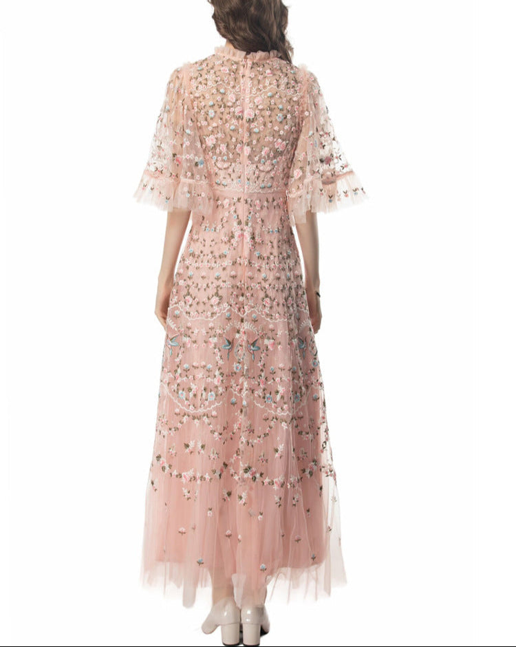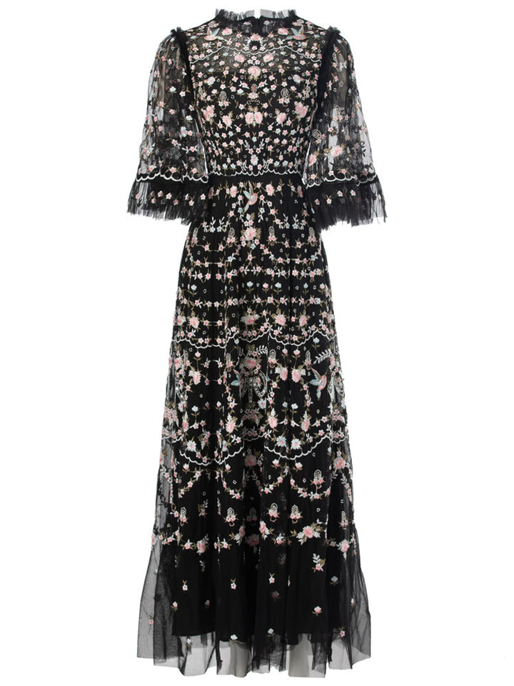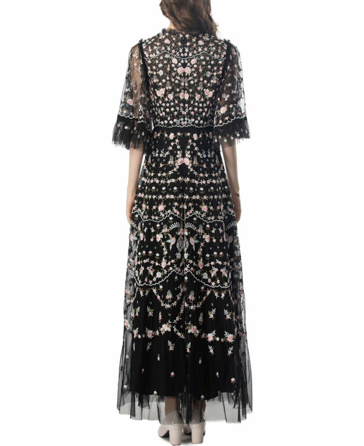 Step into a fairytale with the ESMEE gown, crafted from delicate black tulle and richly embroidered with floral motifs in blush pink and soft green. Featuring sheer flutter sleeves, a high neckline, and scalloped lace accents, this floor-length dress blends romance and sophistication—perfect for enchanting evenings and elevated soirées.