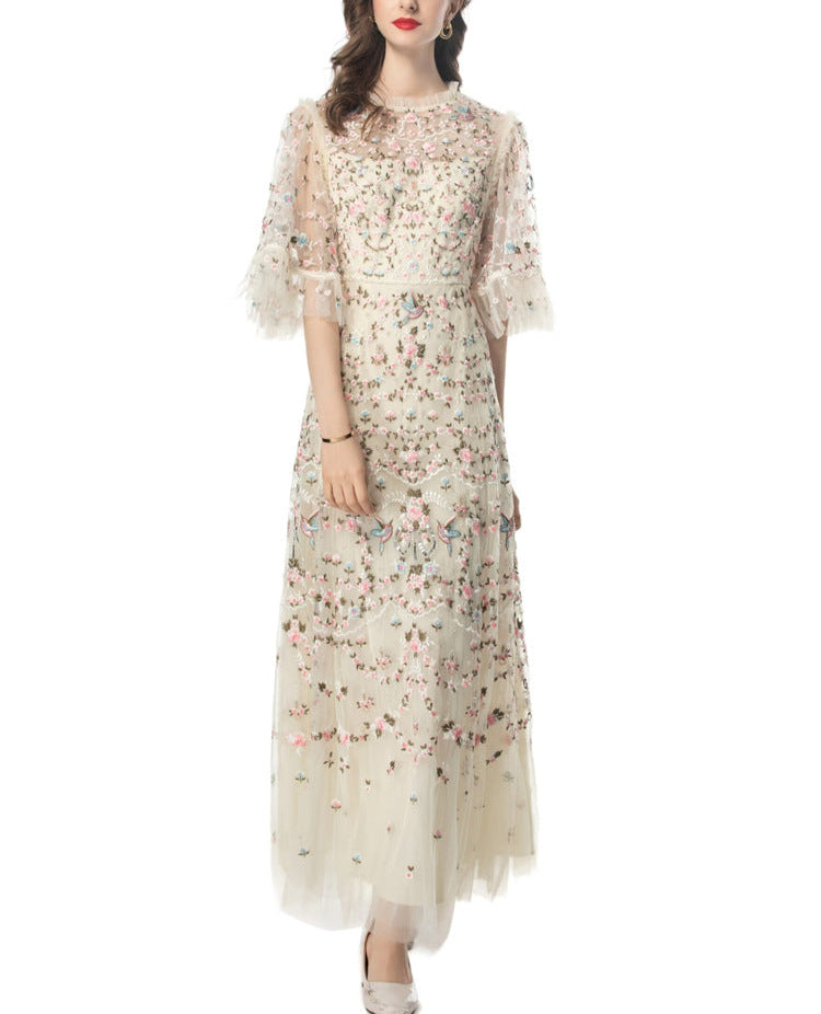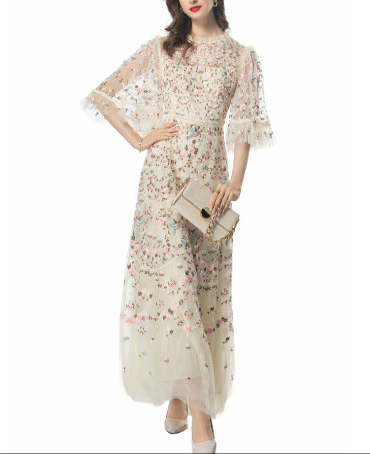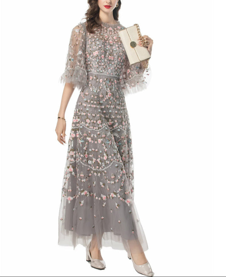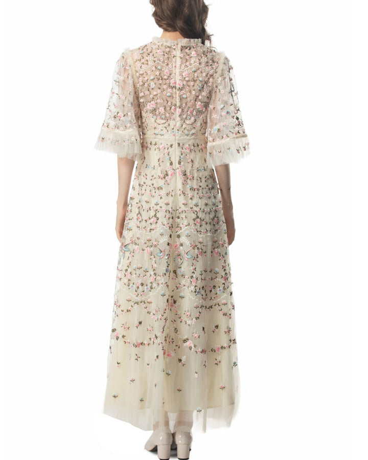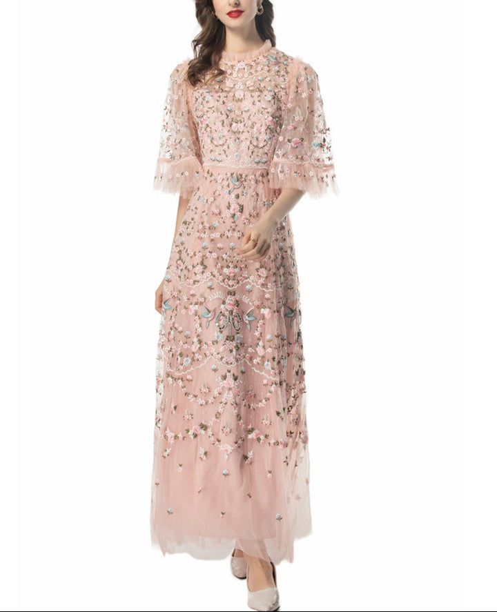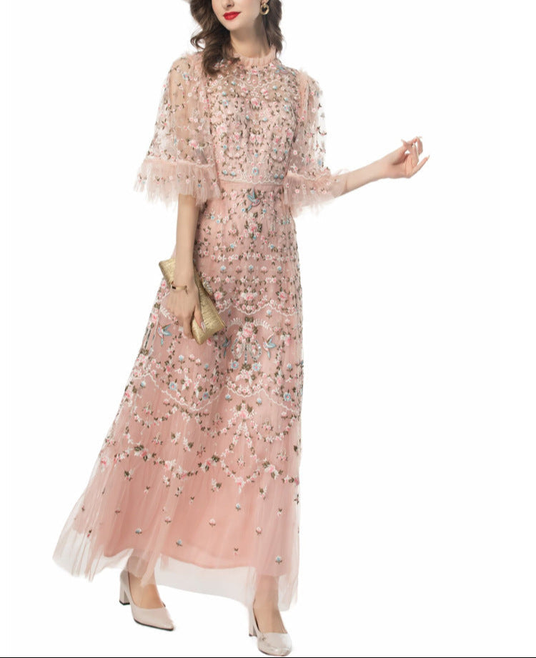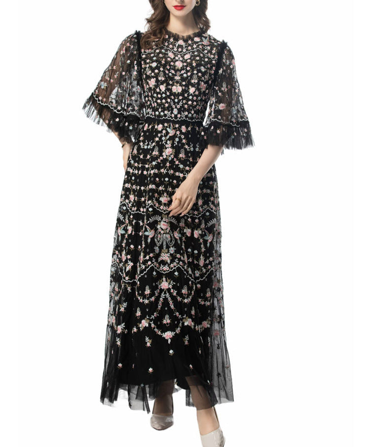 Step into a fairytale with the ESMEE gown, crafted from delicate black tulle and richly embroidered with floral motifs in blush pink and soft green. Featuring sheer flutter sleeves, a high neckline, and scalloped lace accents, this floor-length dress blends romance and sophistication—perfect for enchanting evenings and elevated soirées.