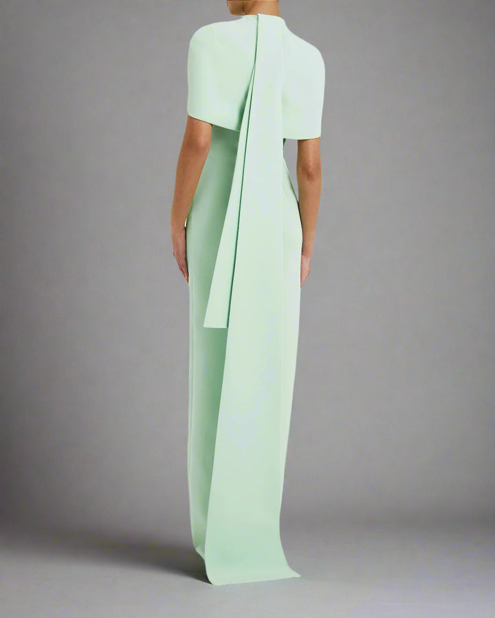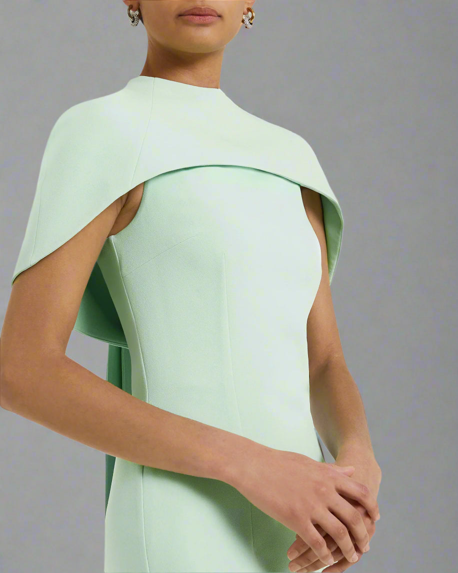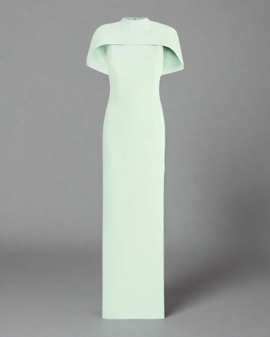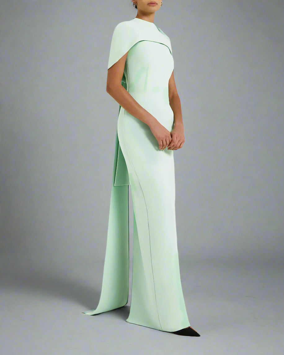 A sleek high-neck mint green column gown featuring a structured shoulder cape that adds architectural elegance. Finished with a subtle front slit and a dramatic back tail, this design is perfect for refined occasions with a modern twist.