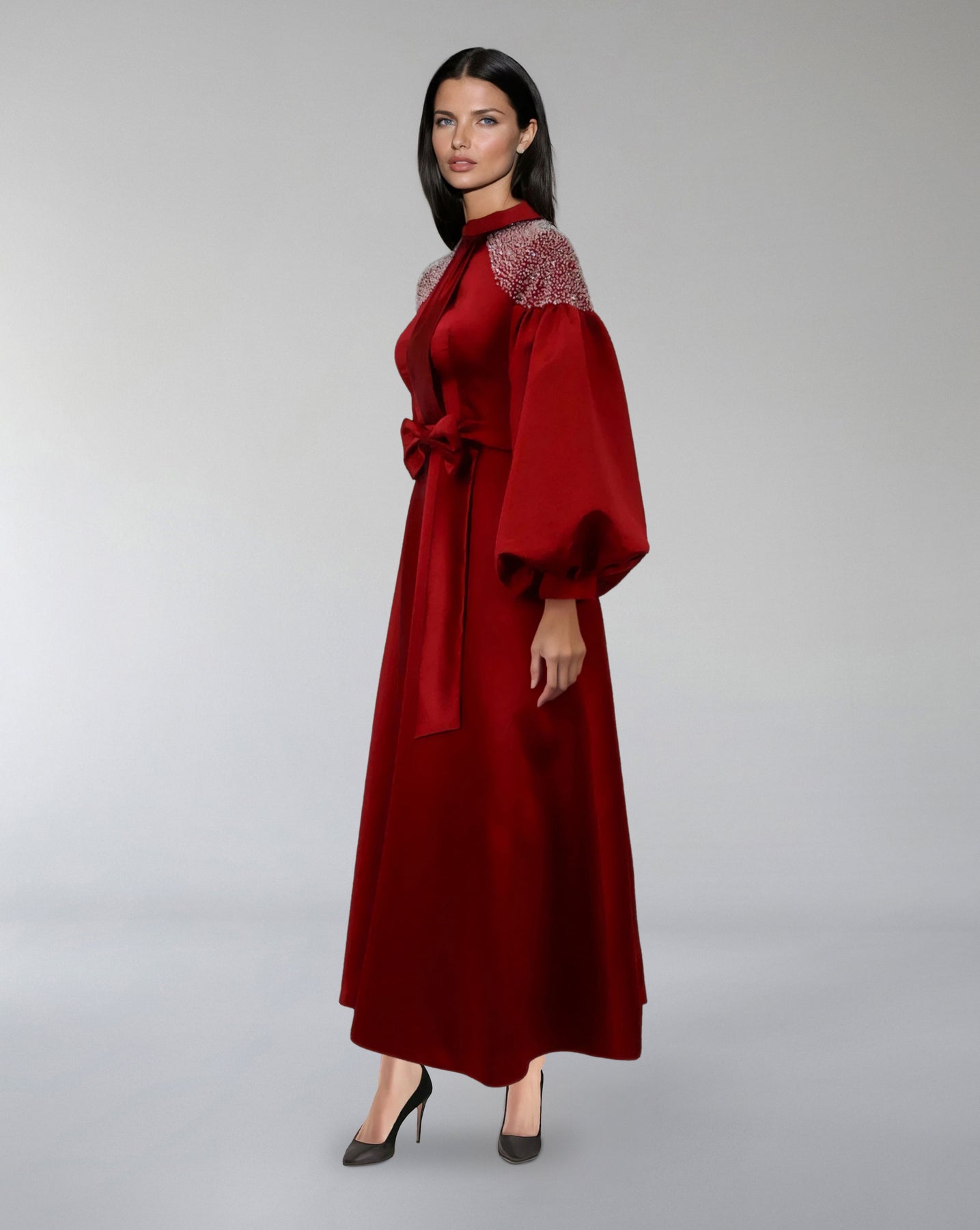 Command attention in this striking deep red A-line dress, crafted for timeless elegance with a touch of sparkle. The design features a high neckline with a soft front tie that adds a delicate, feminine touch.The shoulders are adorned with intricate hand-applied embellishments, creating a subtle shimmer that contrasts beautifully with the rich satin-like fabric. Voluminous balloon sleeves taper at the cuffs for a sophisticated silhouette, cultural celebrations, or evening events. Elegant and regal, SCARLET is a versatile piece that blends contemporary charm with classic refinement.