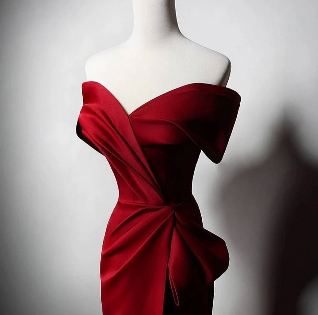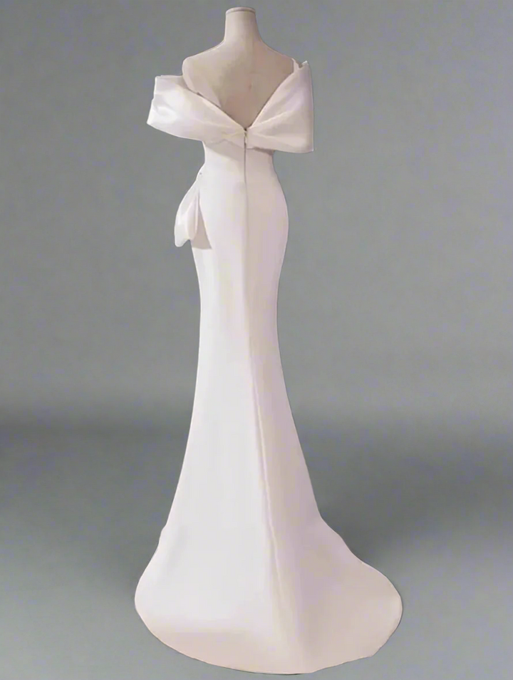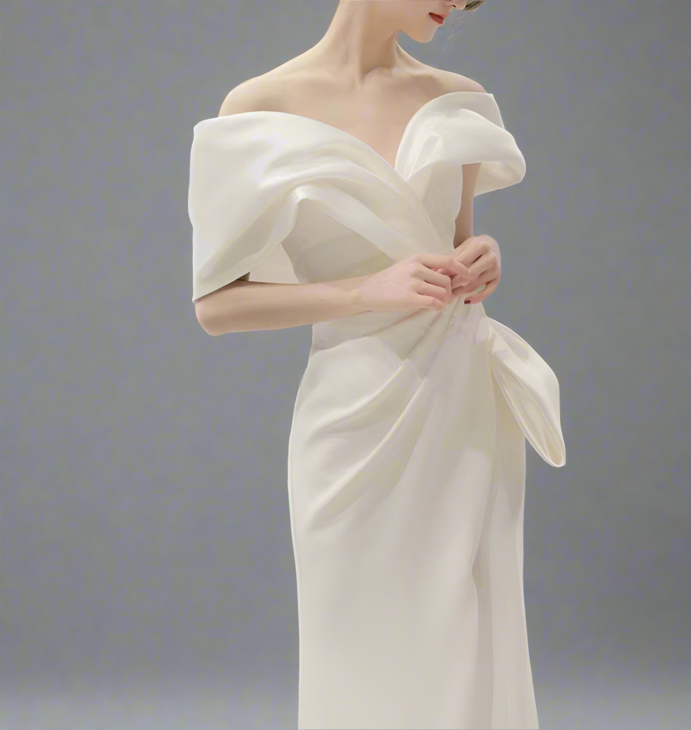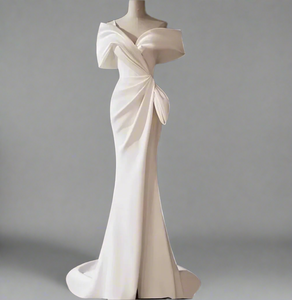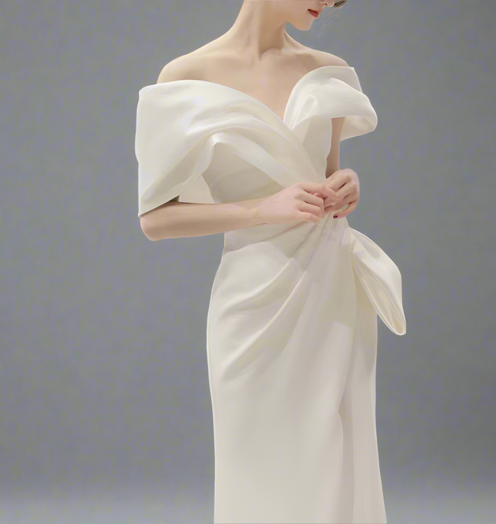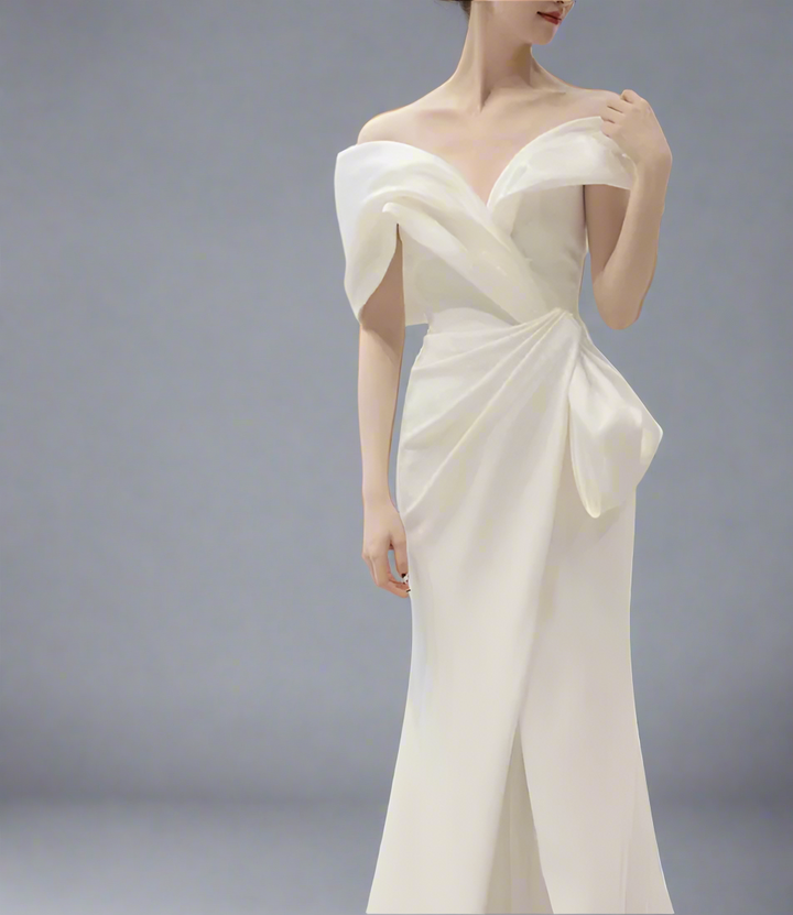 An elegant ivory gown with a sculpted off-shoulder neckline and artful draping across the bodice. Finished with a side bow detail and a subtle slit, this design exudes timeless sophistication—ideal for weddings, galas, and evening soirées.