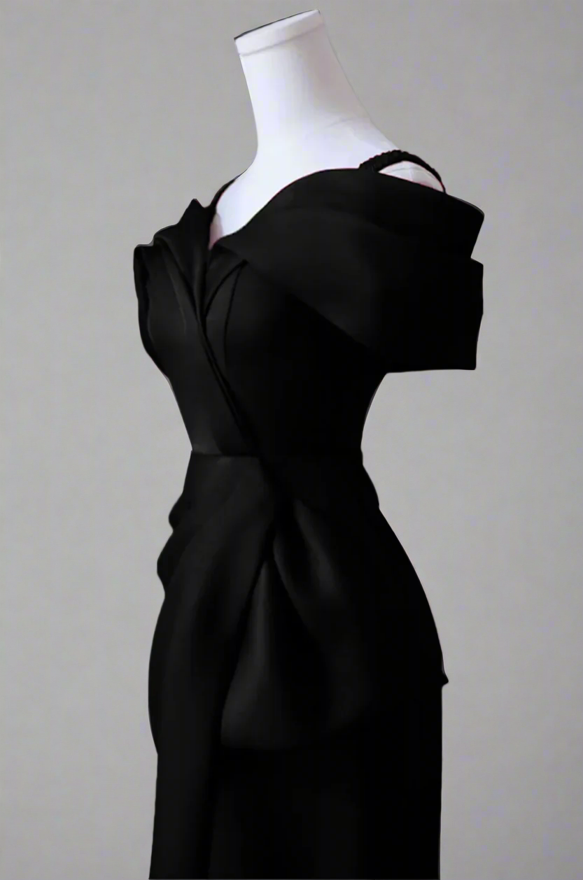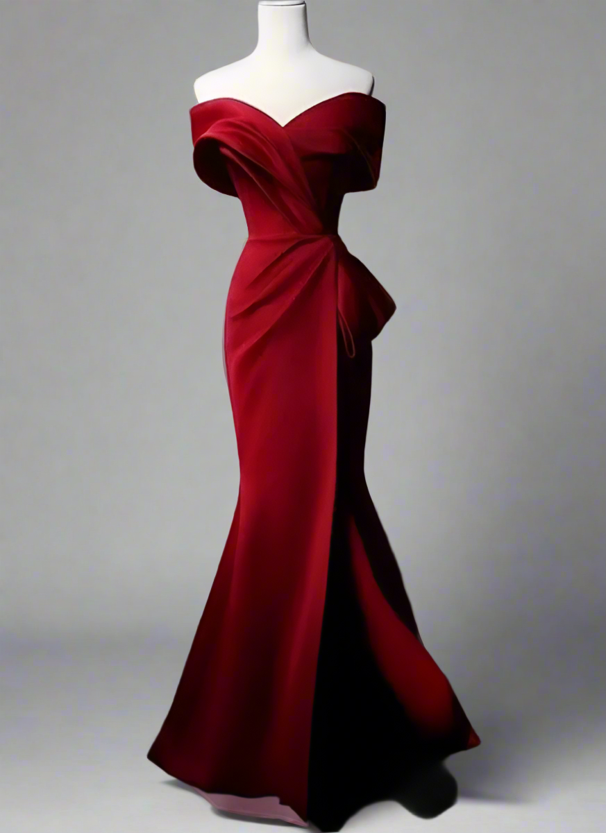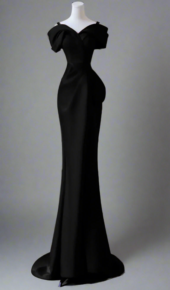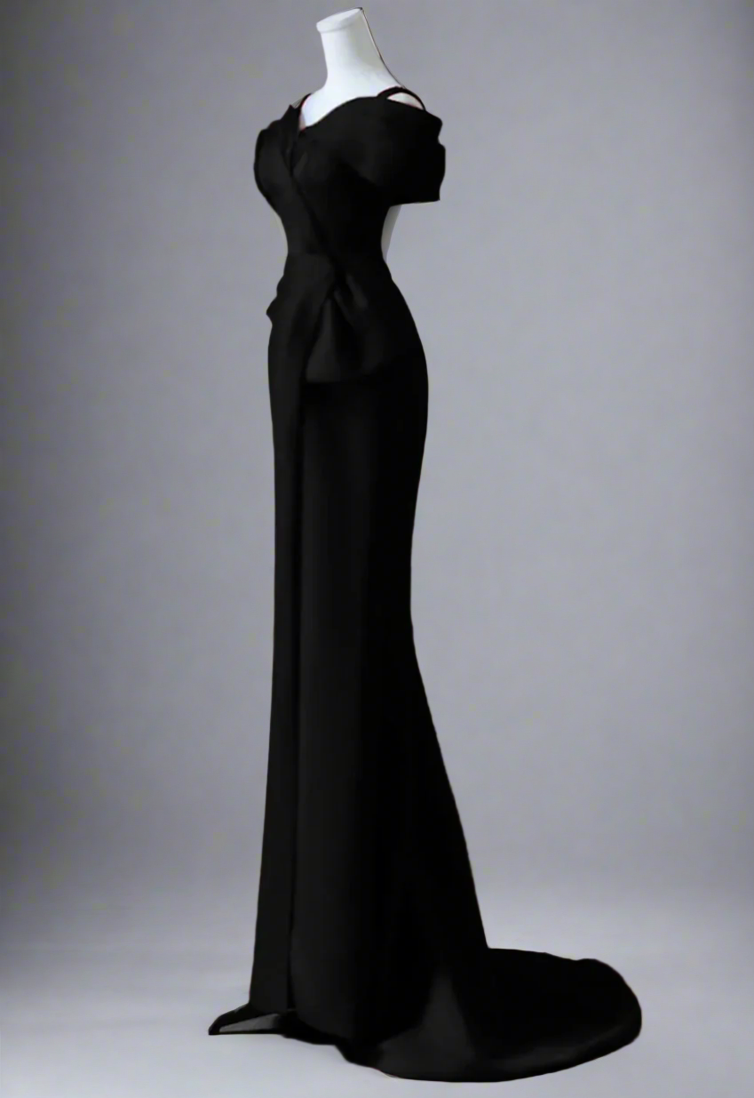 An elegant ivory gown with a sculpted off-shoulder neckline and artful draping across the bodice. Finished with a side bow detail and a subtle slit, this design exudes timeless sophistication—ideal for weddings, galas, and evening soirées.