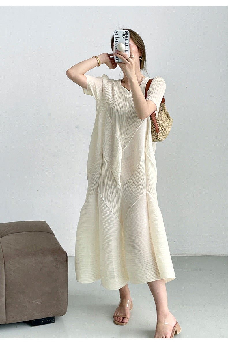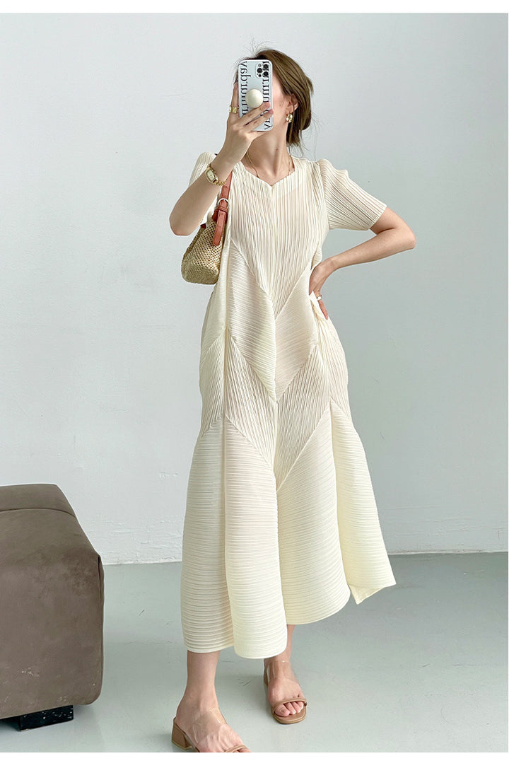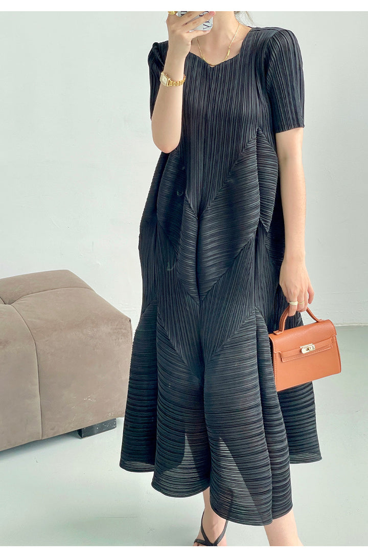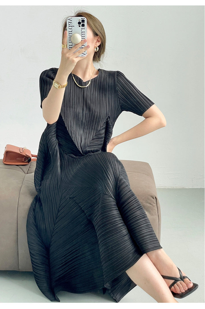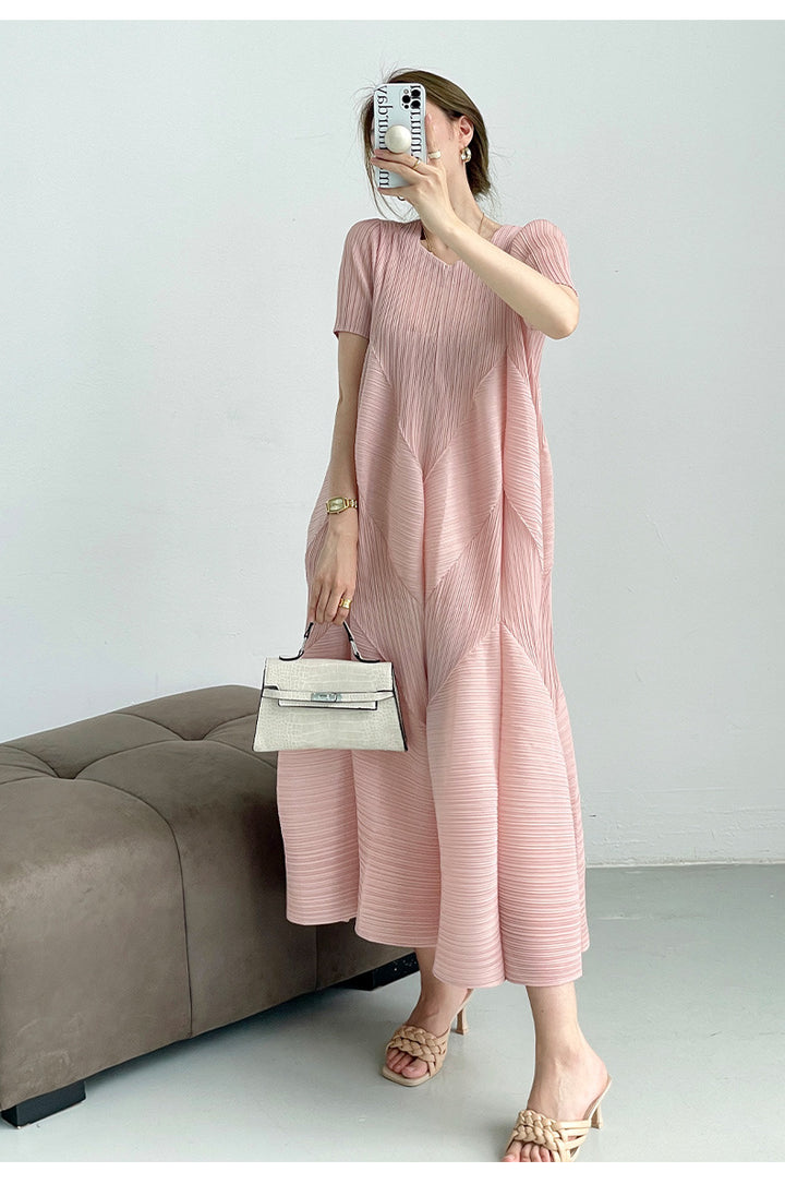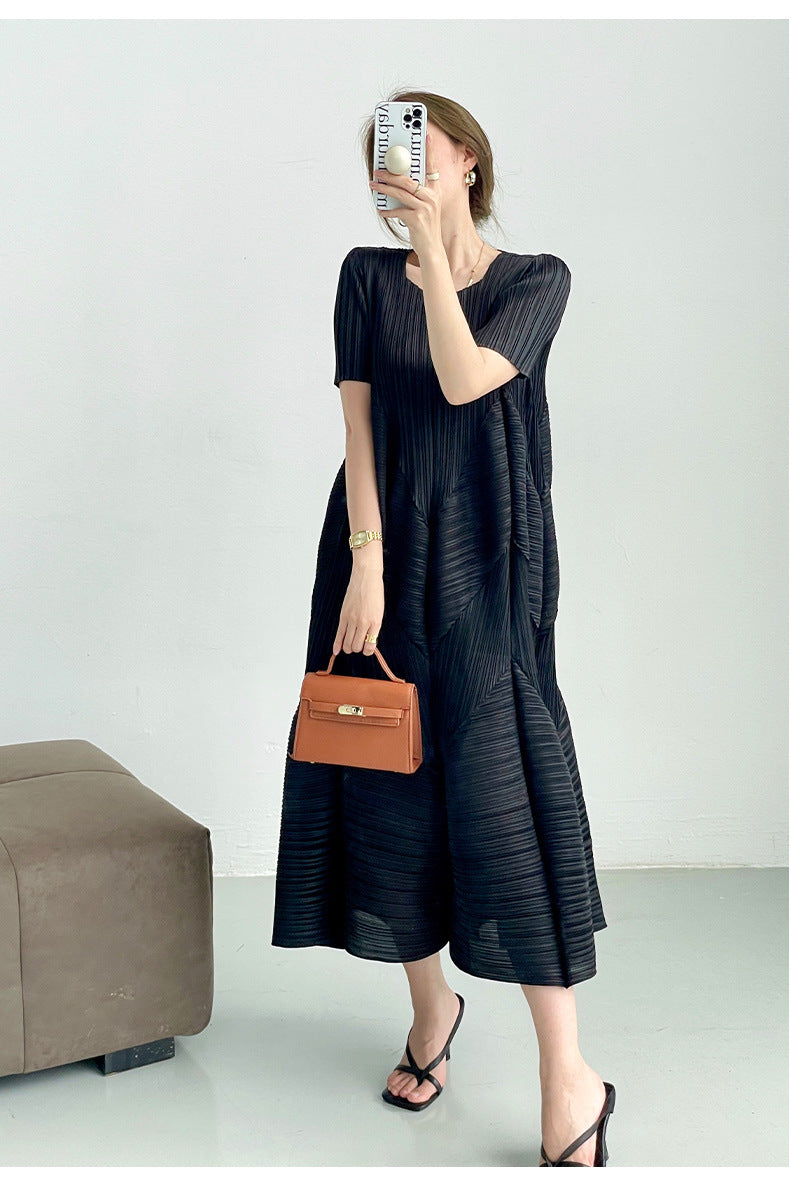 Relaxed Fit Short Sleeve Midi Dress with Sculpted Pleats and Flowing Geometric Panels