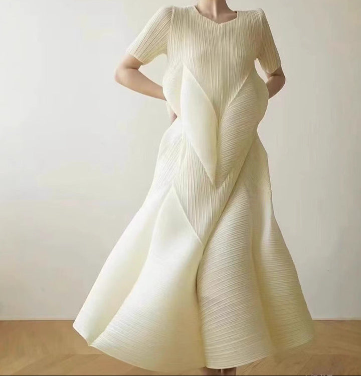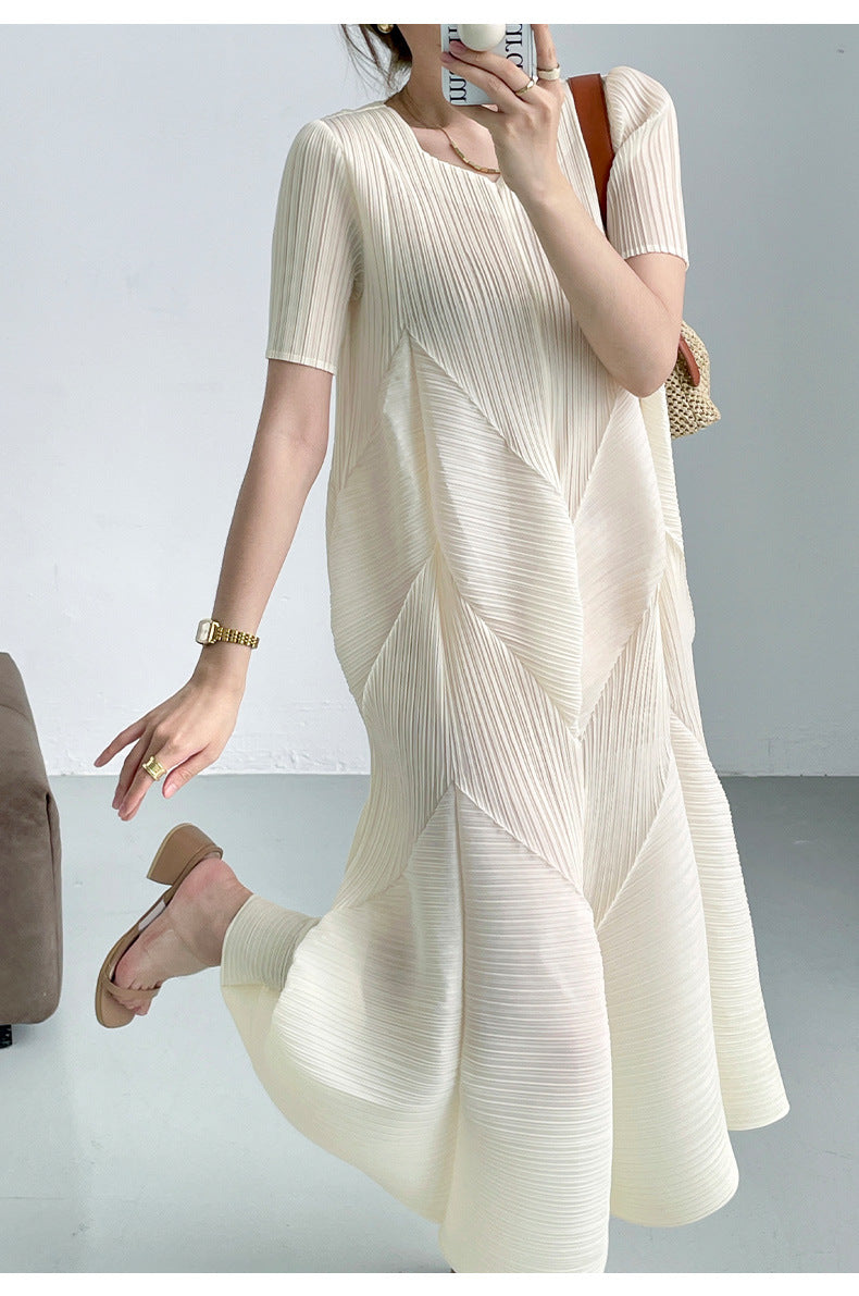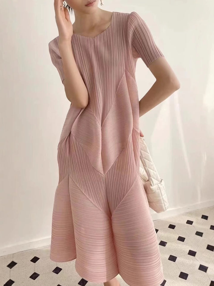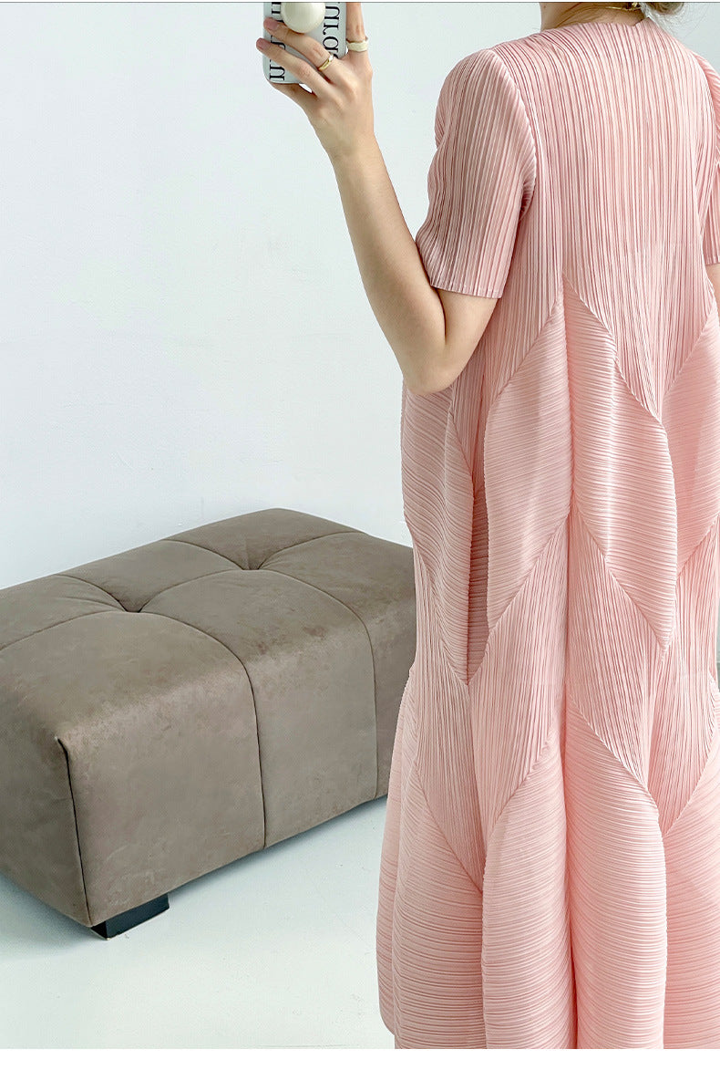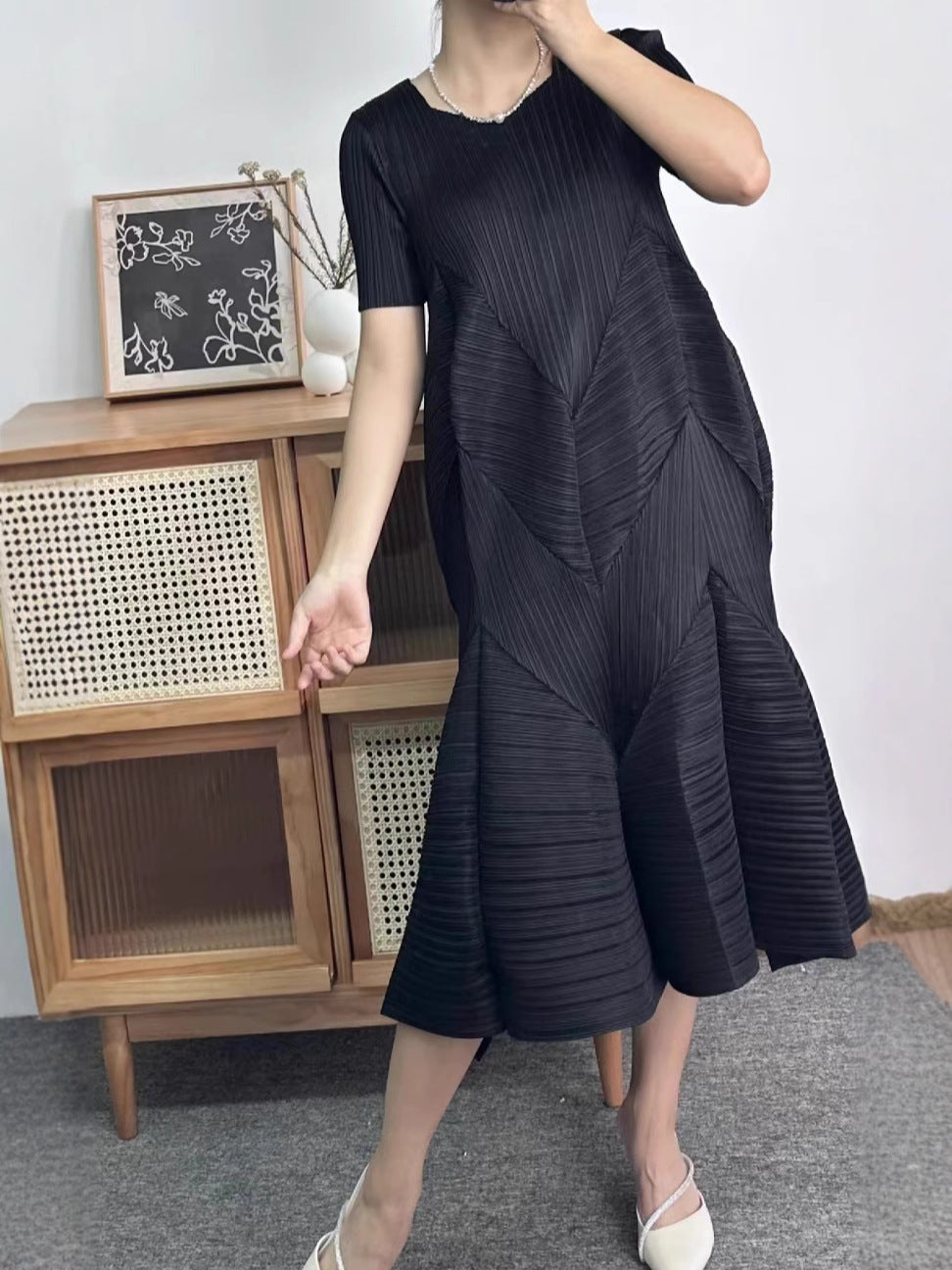 Relaxed Fit Short Sleeve Midi Dress with Sculpted Pleats and Flowing Geometric Panels