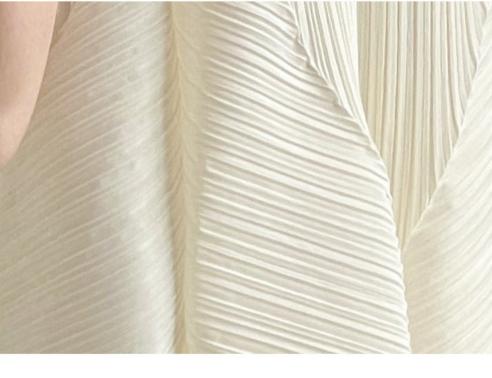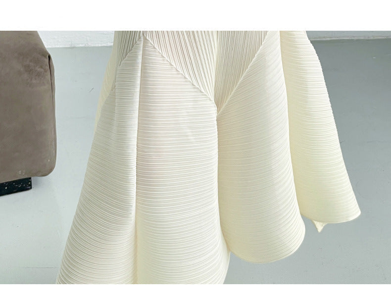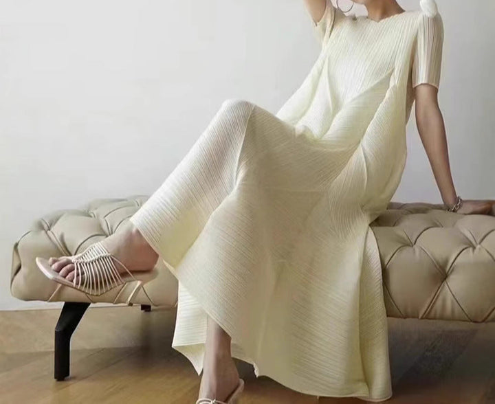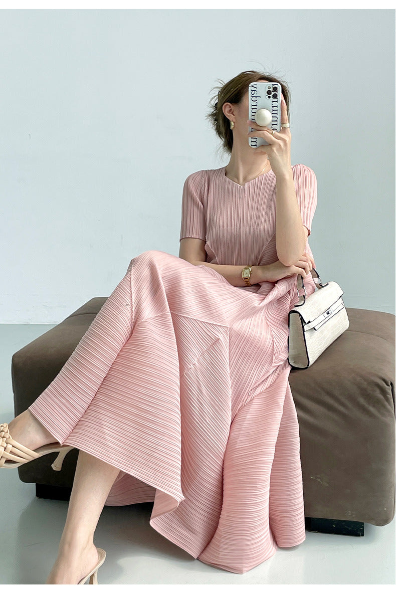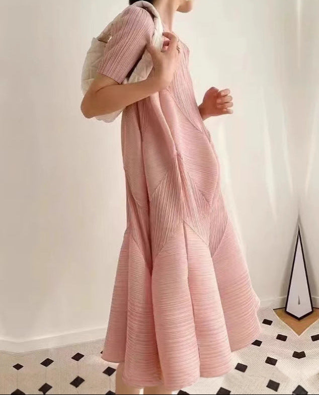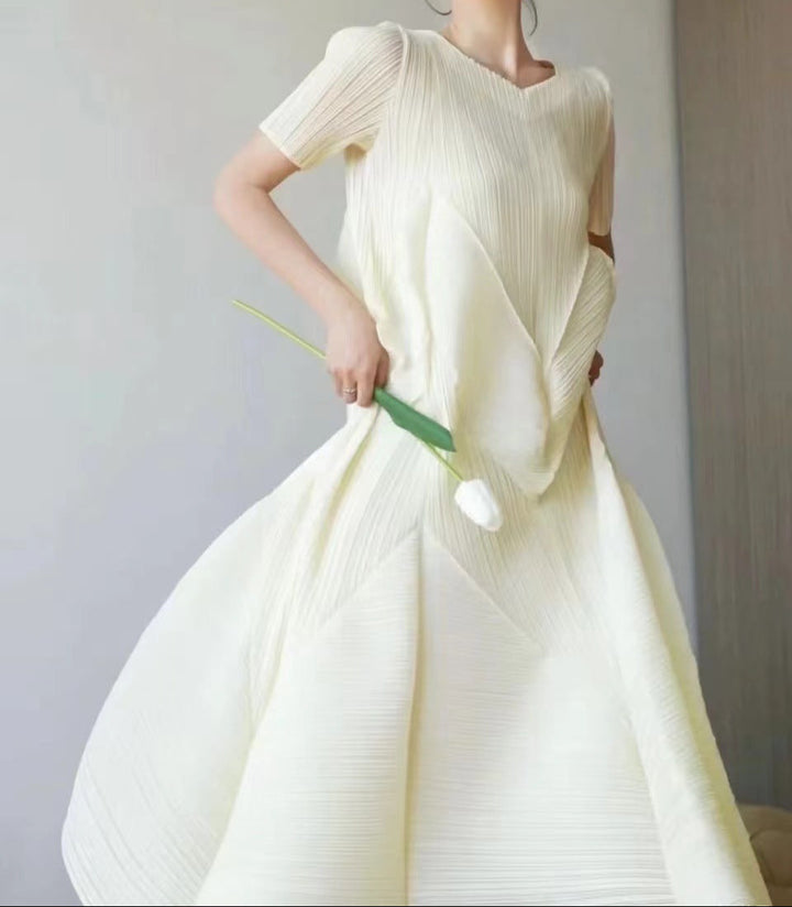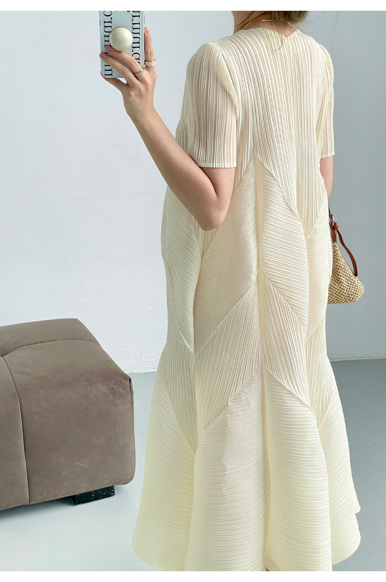 Relaxed Fit Short Sleeve Midi Dress with Sculpted Pleats and Flowing Geometric Panels