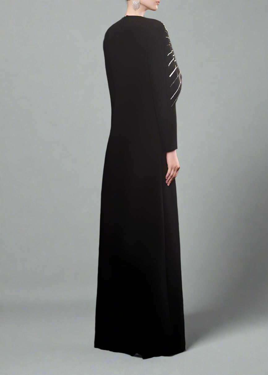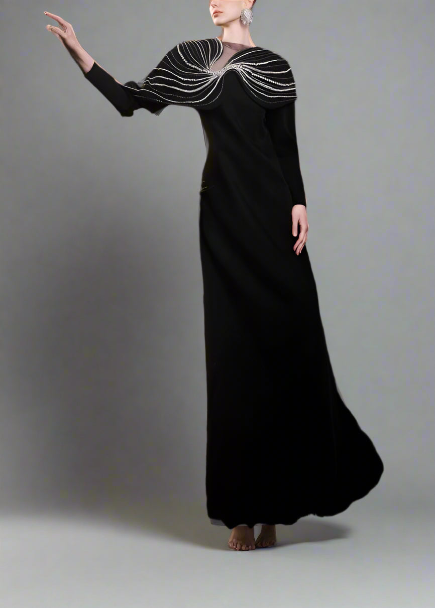 An elegant black floor-length gown featuring a sculpted cape neckline adorned with cascading wave-like beadwork. The flowing straight silhouette emphasizes timeless sophistication, making it a refined choice for evening galas and red-carpet moments.