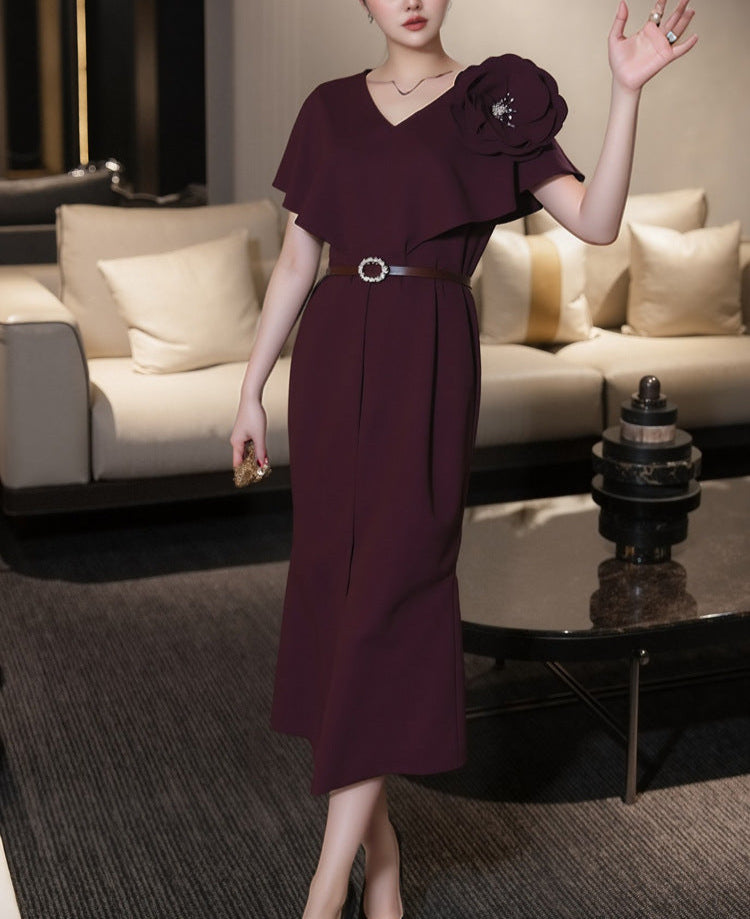 midi dress with oversized floral shoulder and front slit – LEMIEN