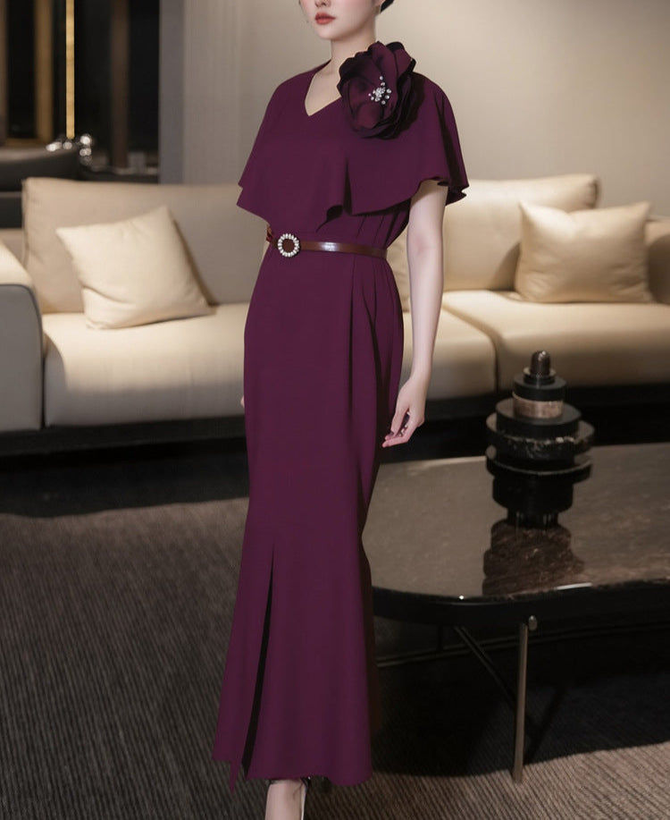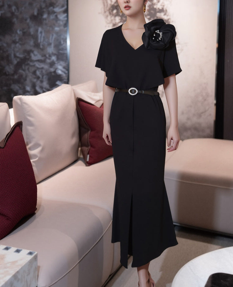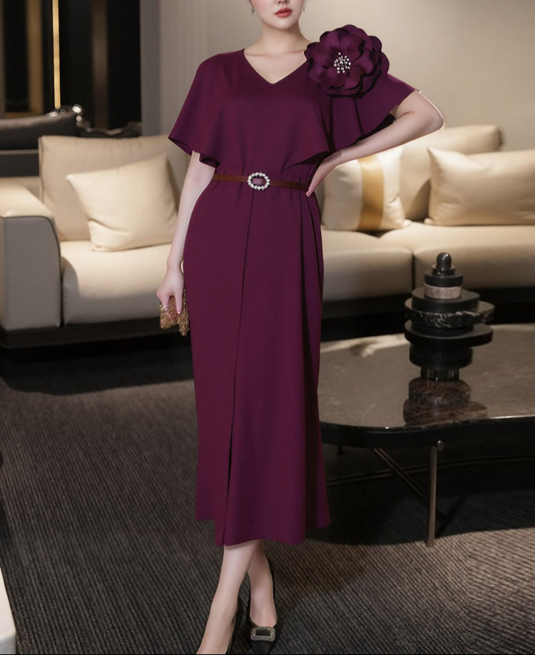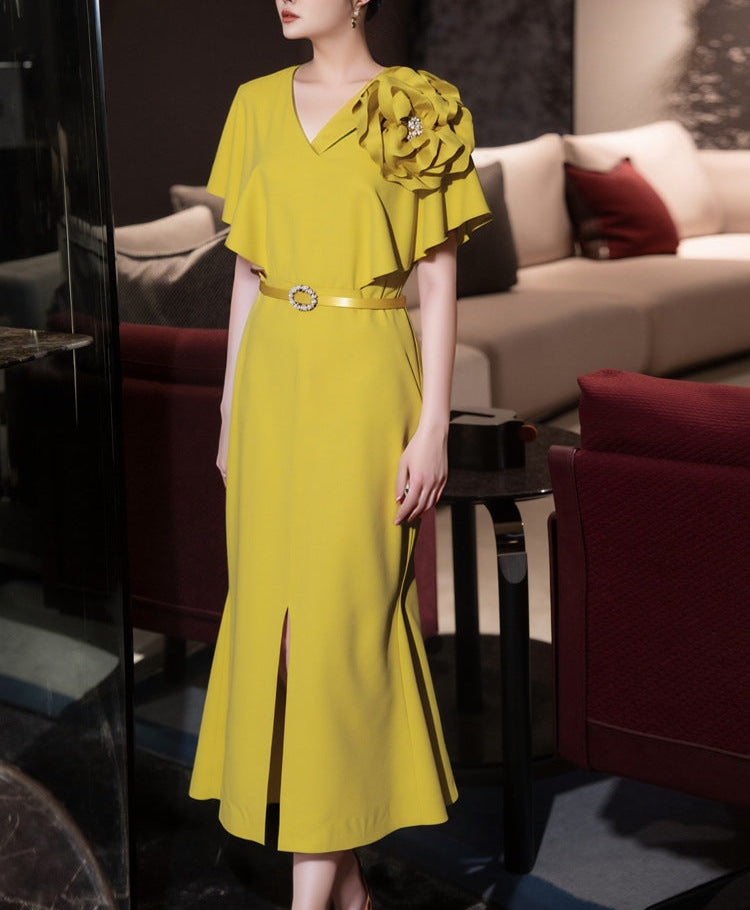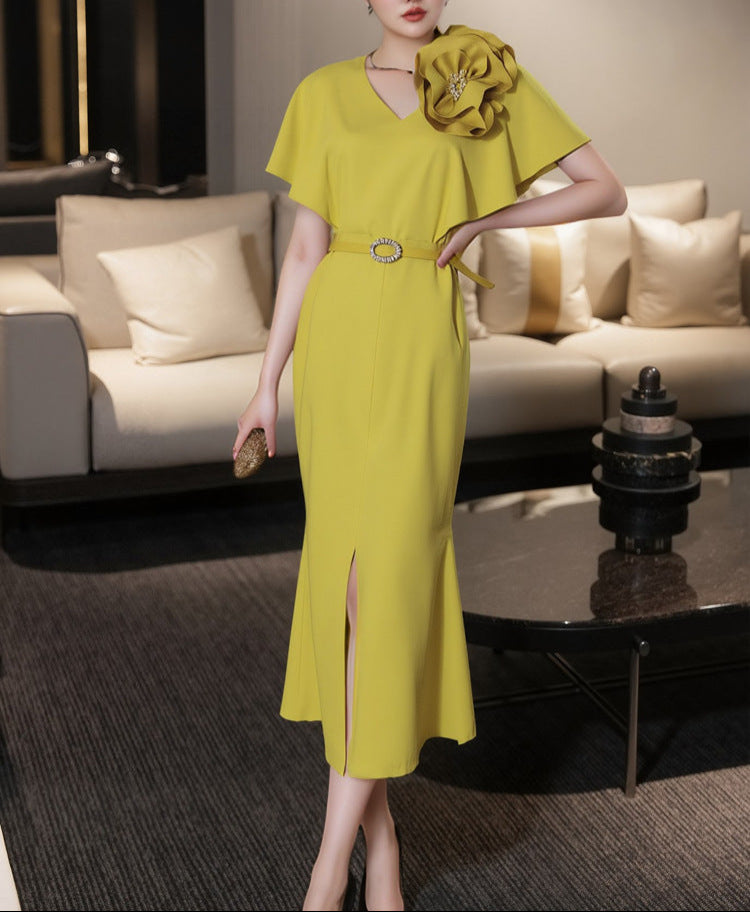 Make a bold statement in this lemon-hued midi dress, featuring a dramatic oversized flower detail on the shoulder, a cinched waist with a jeweled belt, and a tasteful front slit. Ideal for stylish soirées and upscale gatherings.