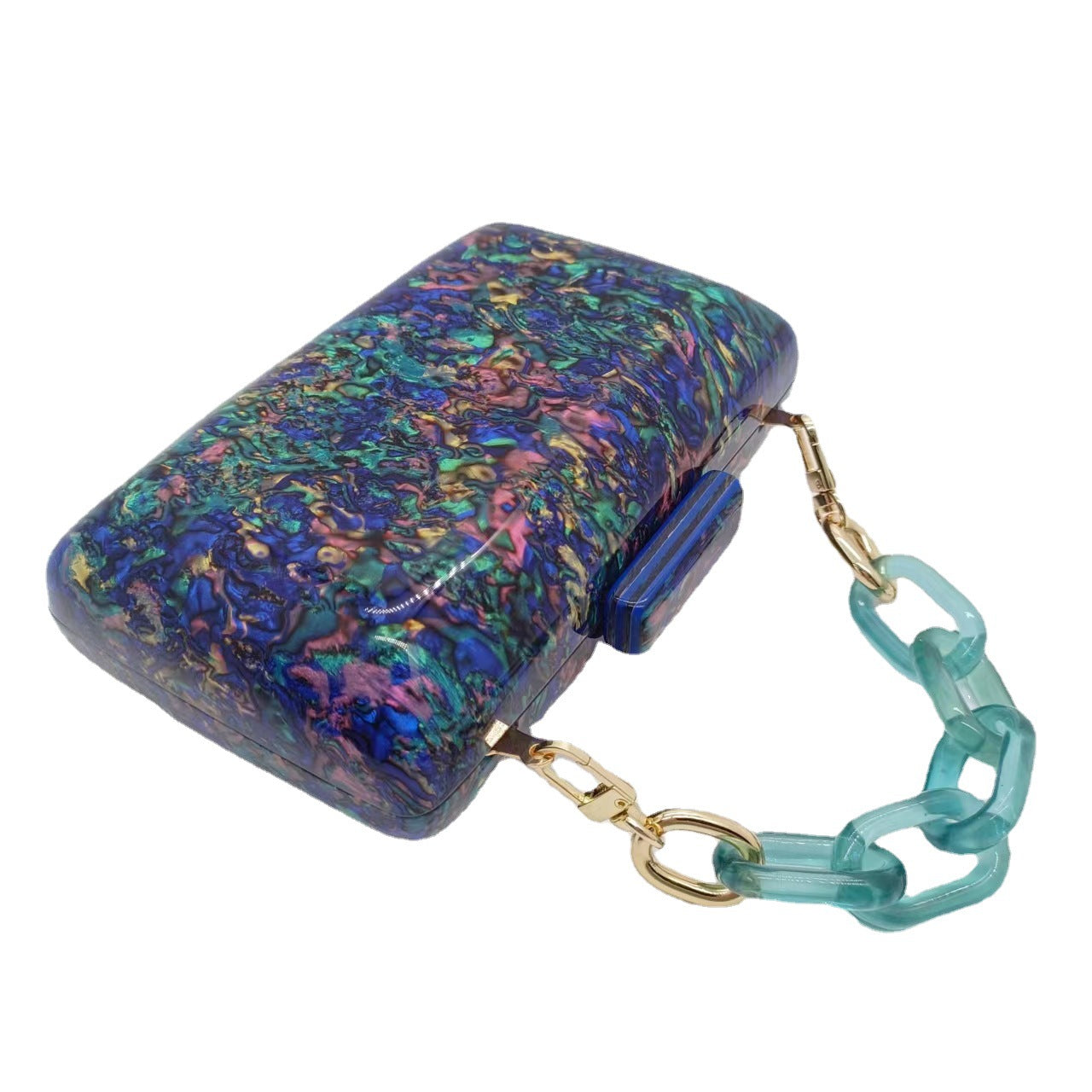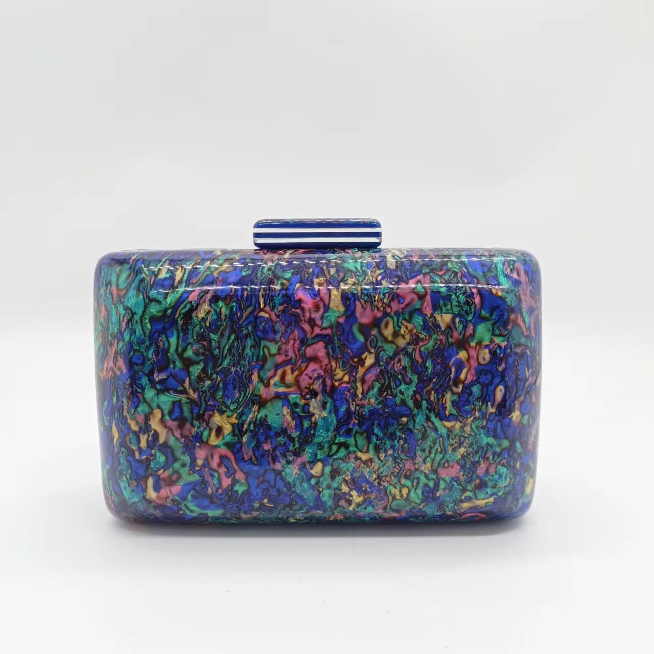 A bold rectangular clutch featuring a marble-inspired acrylic finish in vibrant tones. Its glossy surface and structured shape add an artistic edge to any elegant outfit.