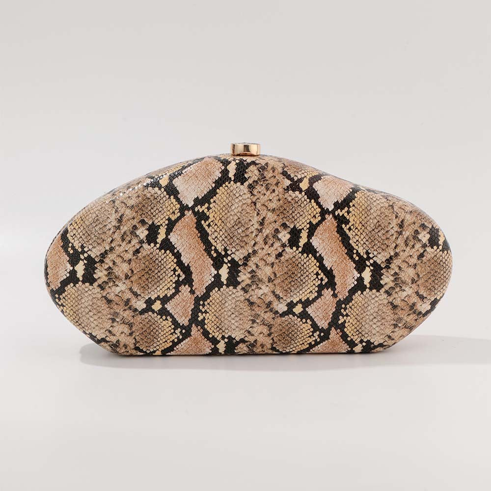 Add a touch of elegance to your evening look with this bold oval bag, finished with luxurious snakeskin leather and a shiny metal clasp. Its elegant design and perfect structure