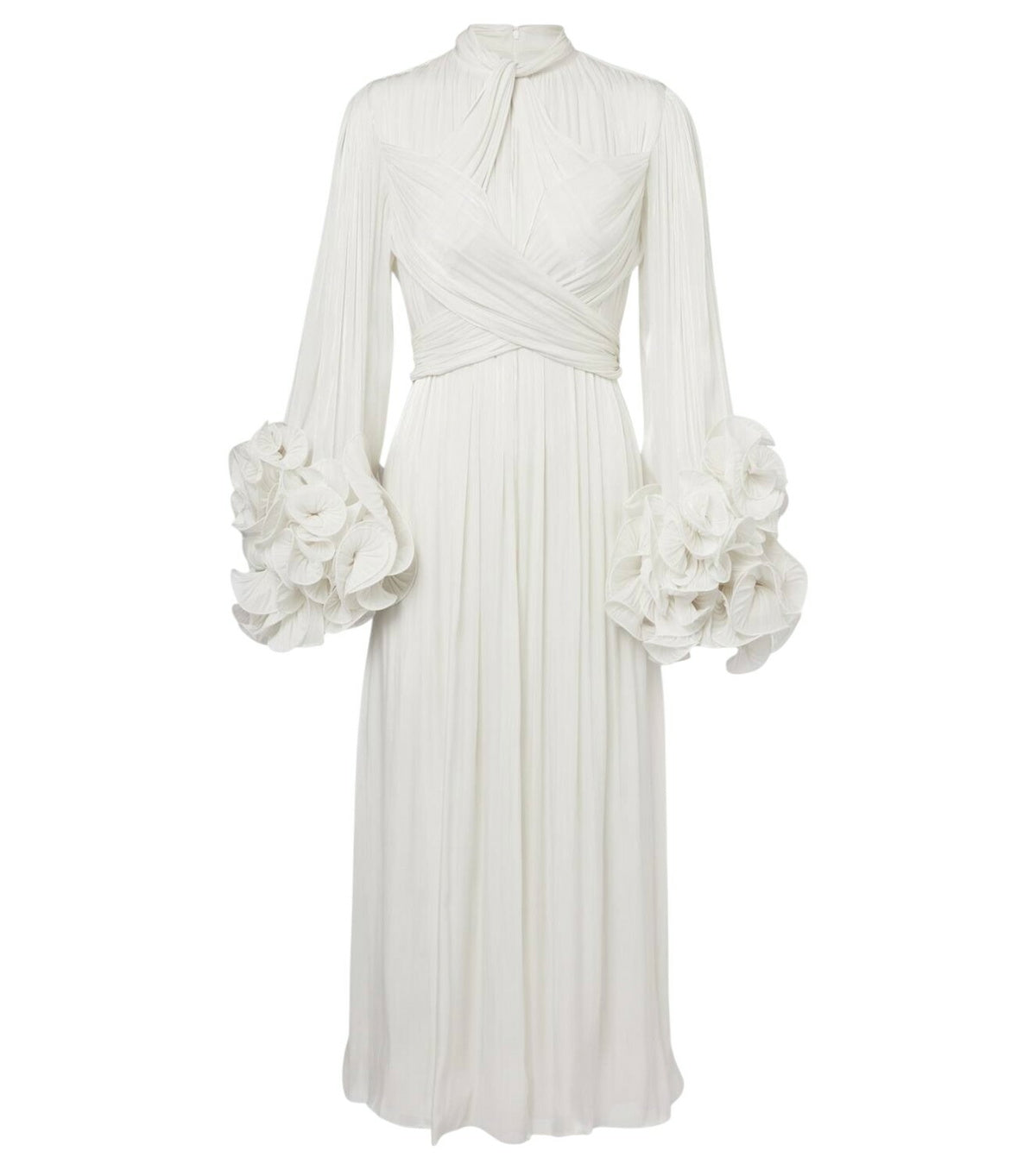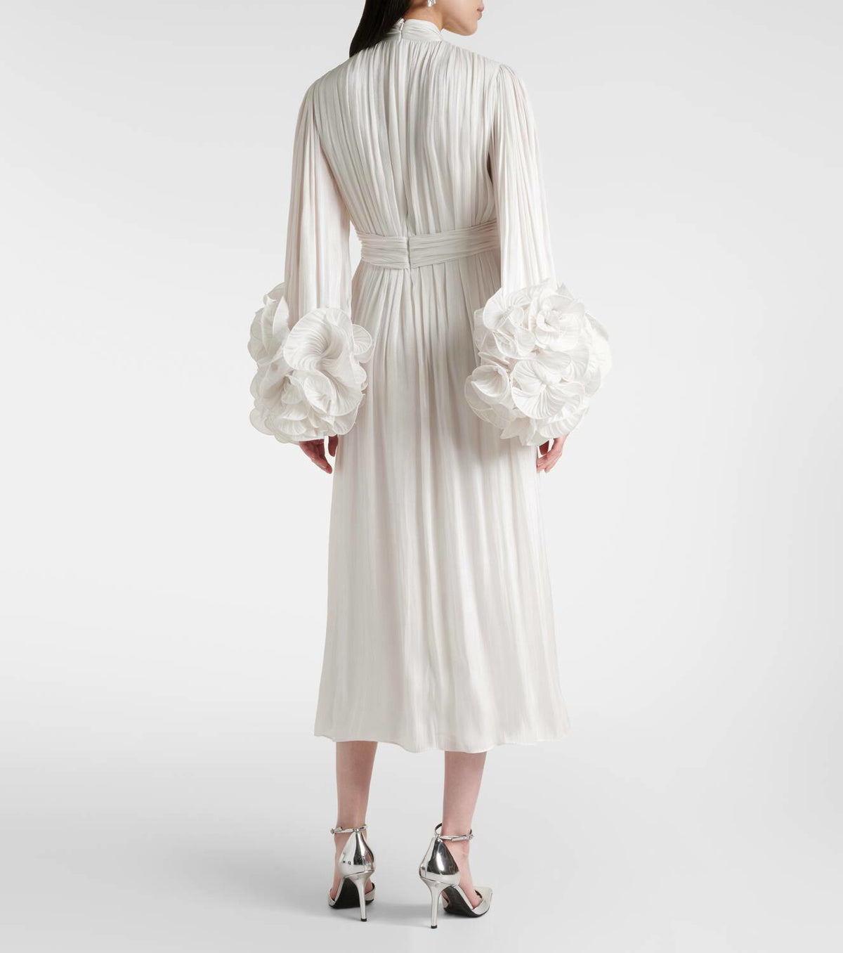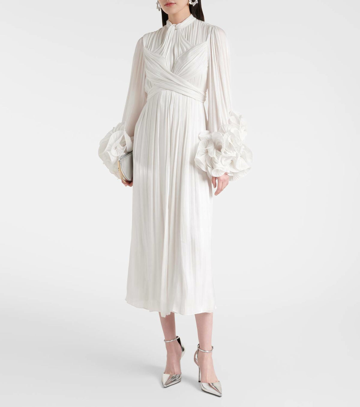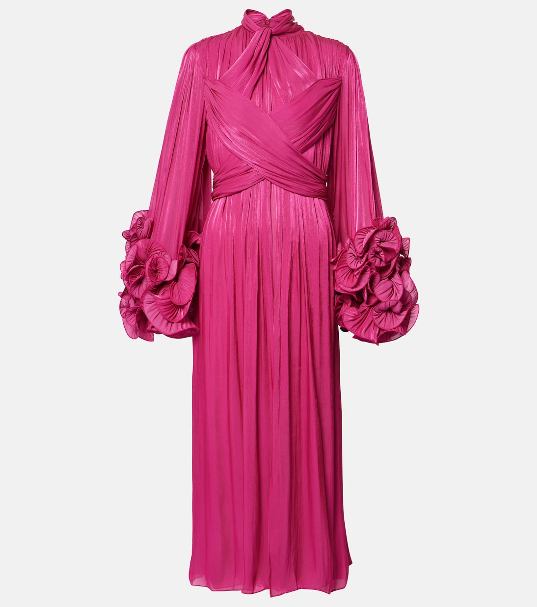 A radiant fuchsia midi dress crafted from fluid pleated chiffon, featuring dramatic floral cuff sleeves and a high neck with a wrapped bodice. Its graceful silhouette and vibrant color exude modern femininity and effortless sophistication.