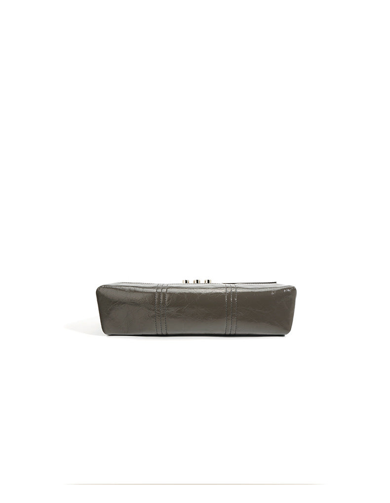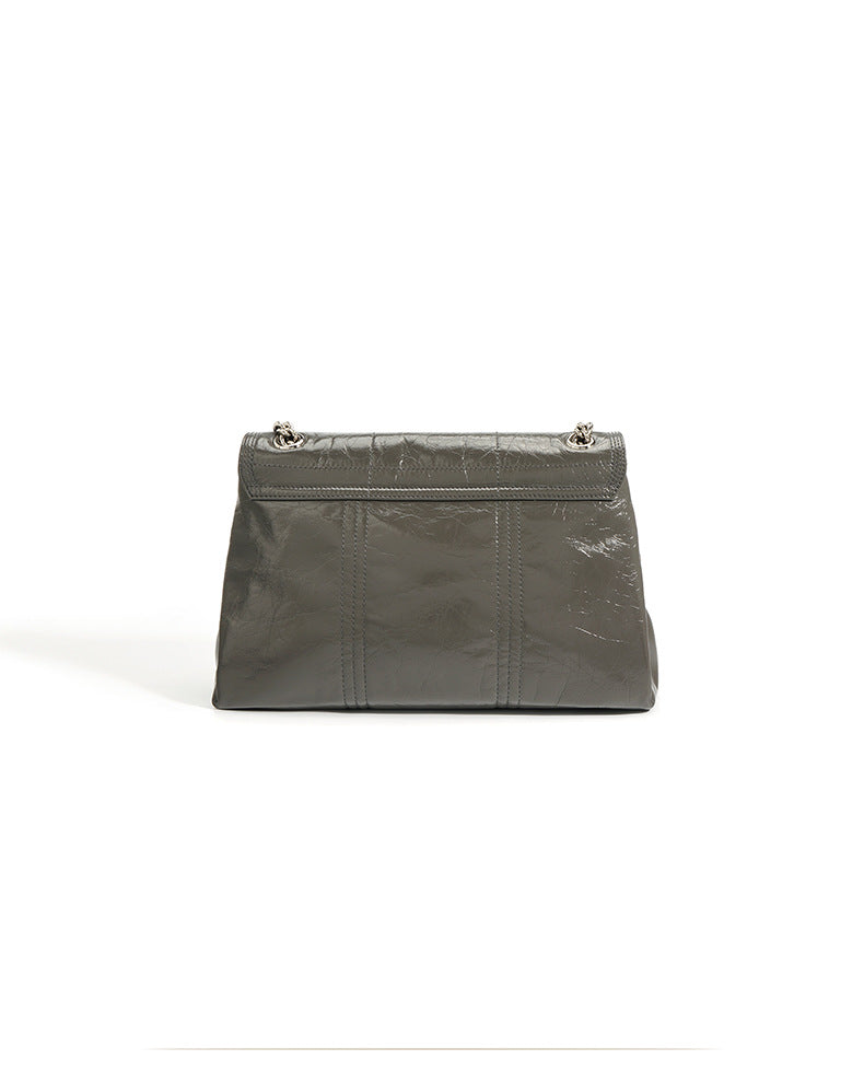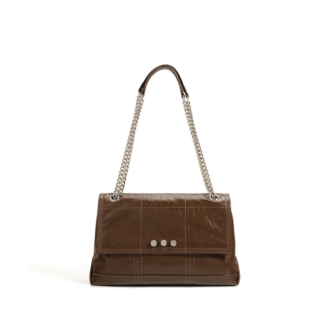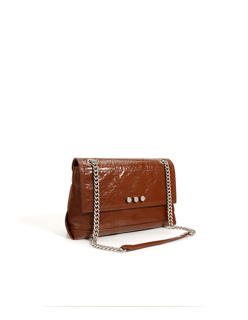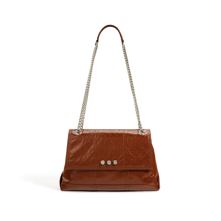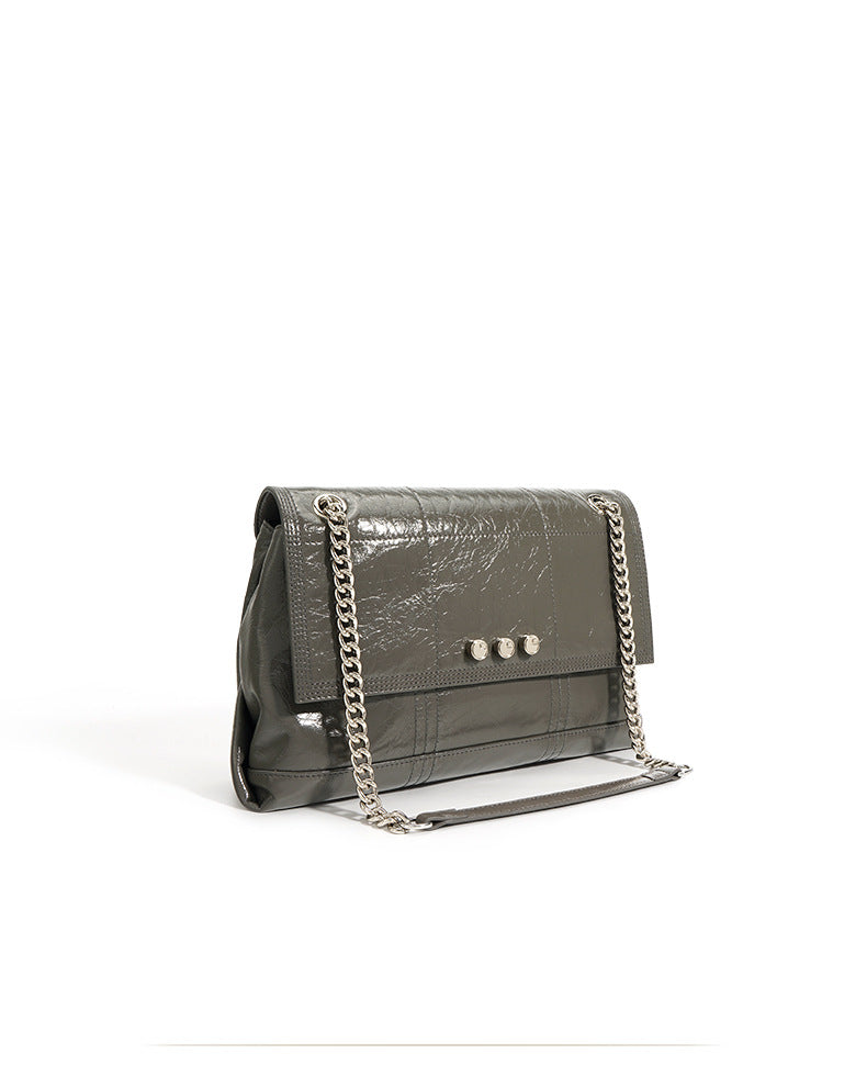 This elegant shoulder bag is crafted from glossy crinkled leather, featuring a quilted flap, two double chain straps with a leather shoulder guard, and signature metal rivet detailing for a sophisticated yet bold look.