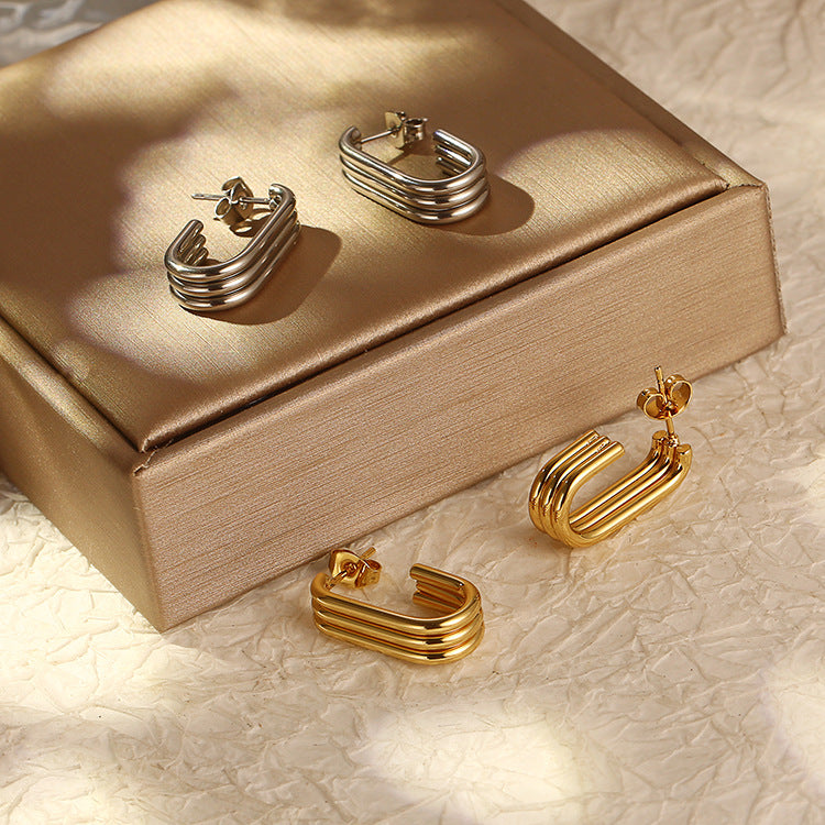 These ribbed U-shaped earrings bring a bold, sculptural touch to your jewelry collection. Crafted with a high-shine finish in both gold and silver tones, their layered ridged design adds dimension and elegance. Perfect for elevating day-to-night looks, these earrings strike the perfect balance between statement and sophistication. Lightweight yet impactful, they're a must-have for the modern minimalist.