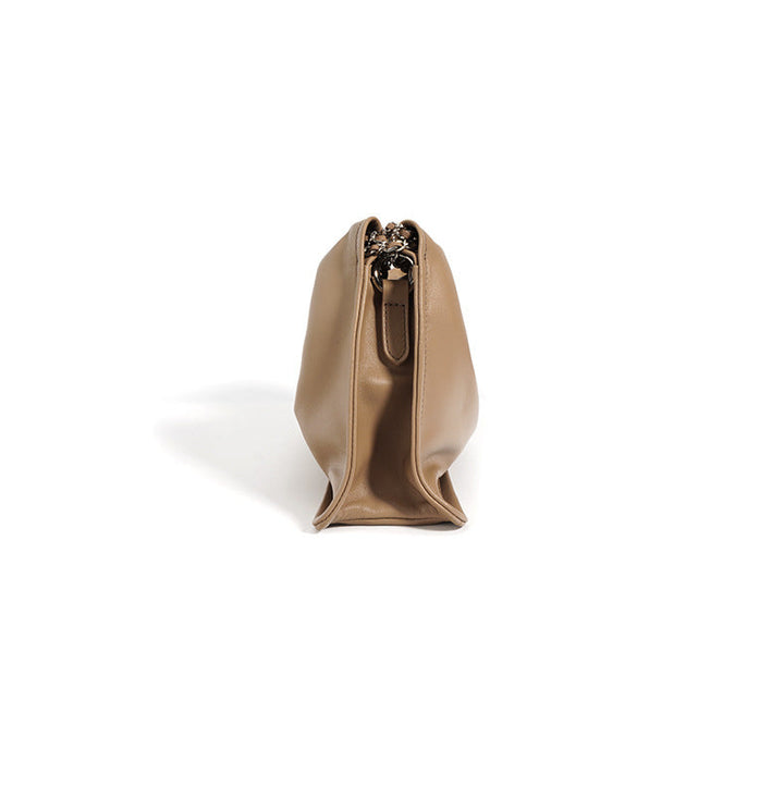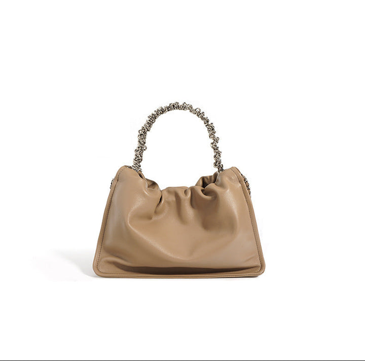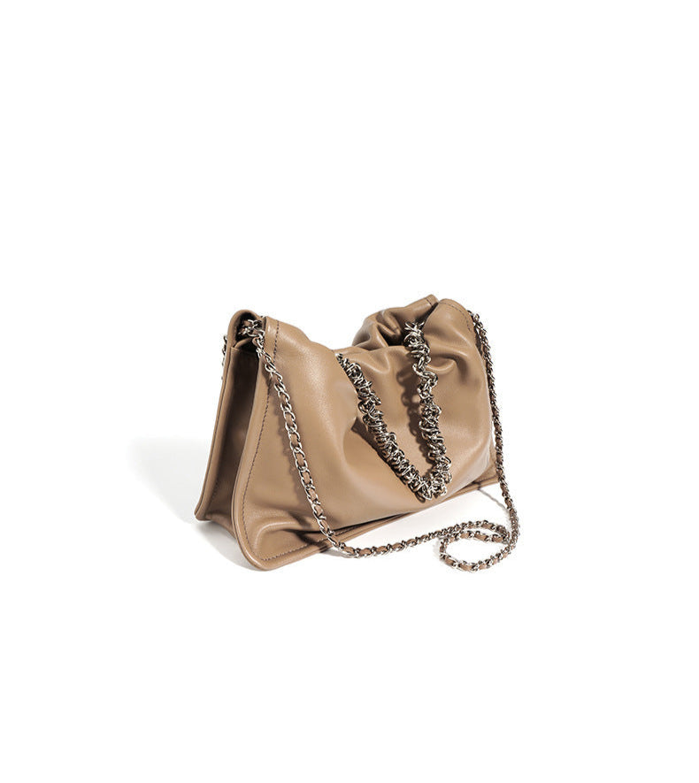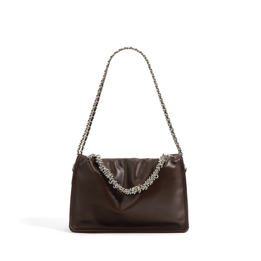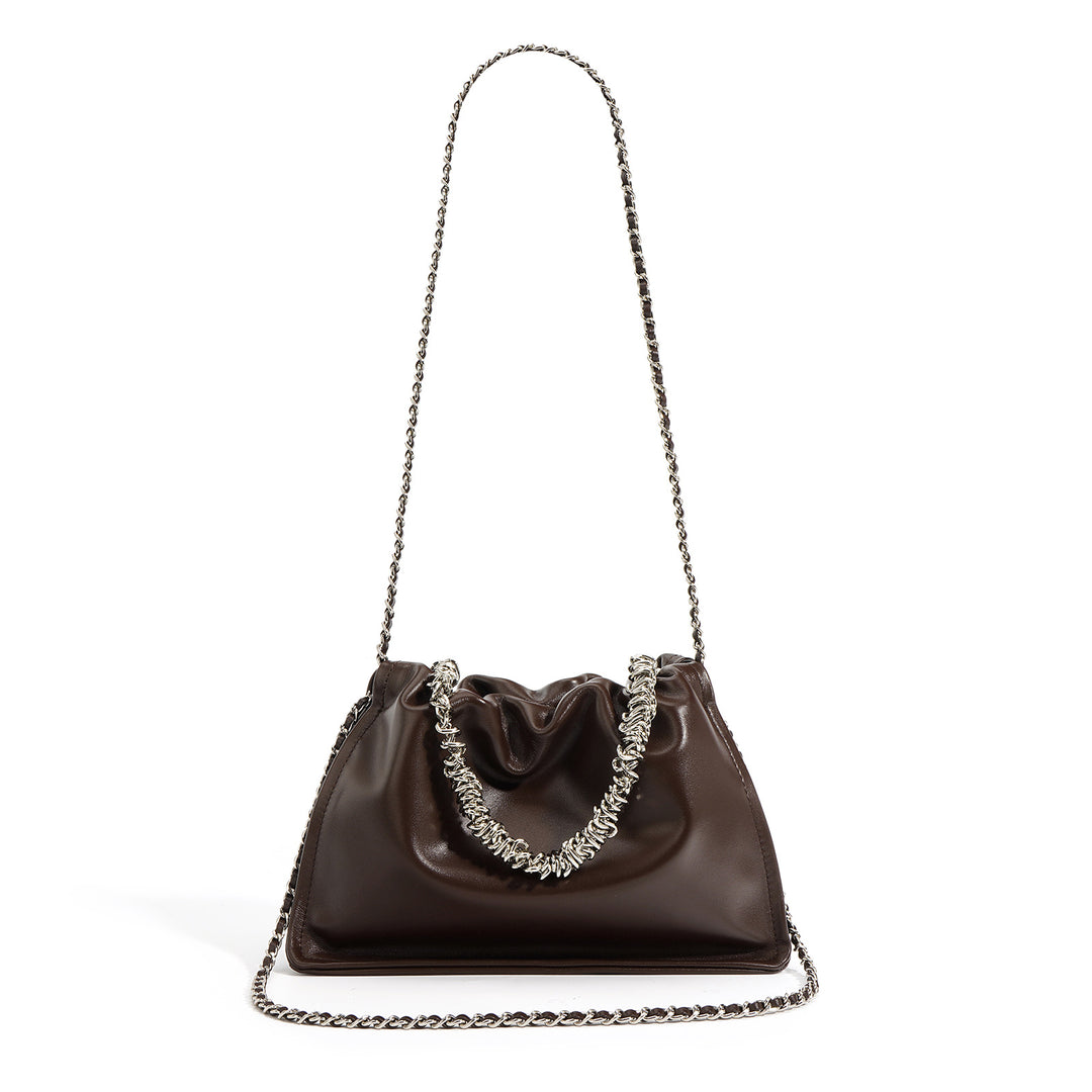 Chic brown shoulder bag crafted from smooth ruched leather, featuring dual silver-tone chains—one sleek and one statement spiral—for a modern yet timeless finish.