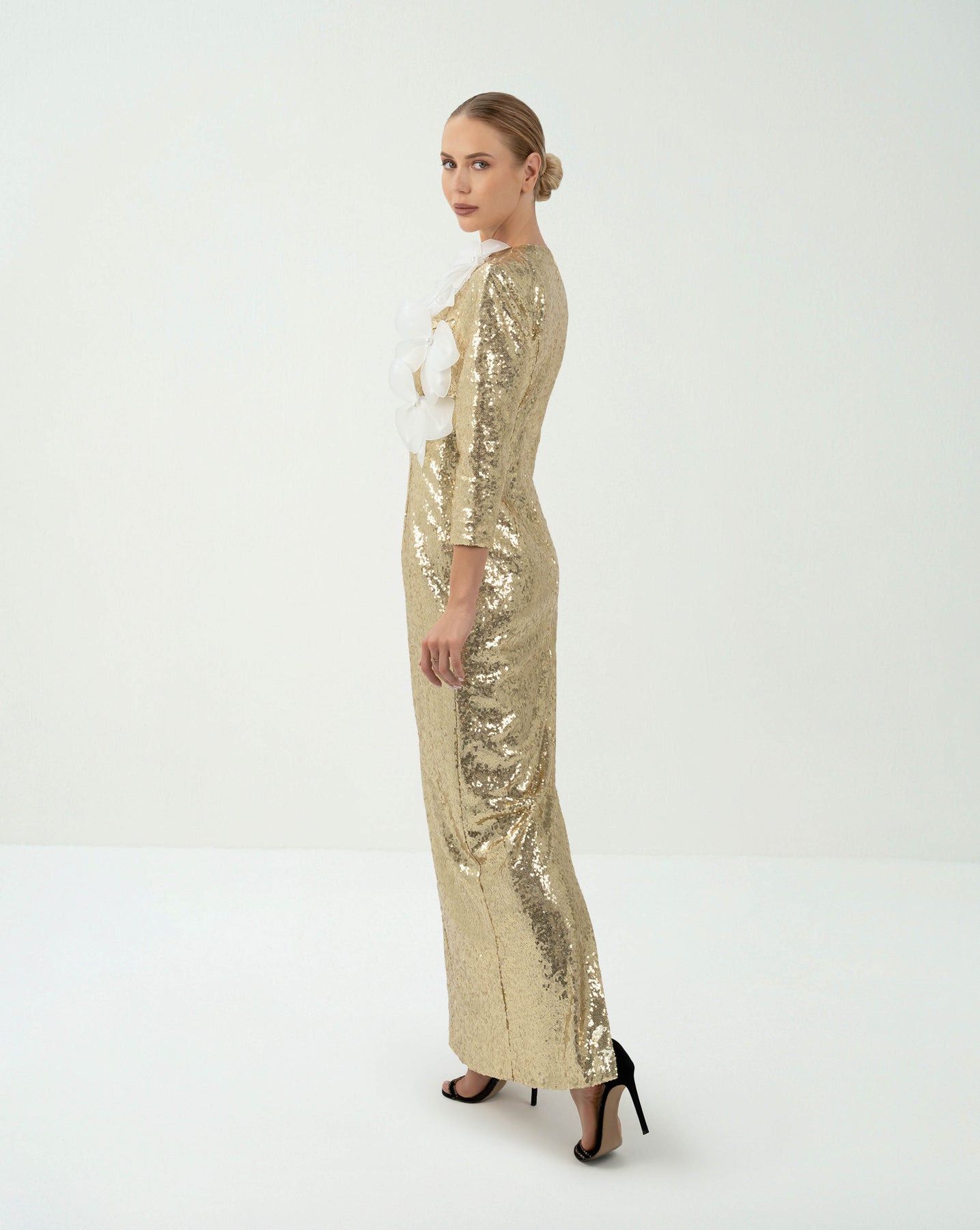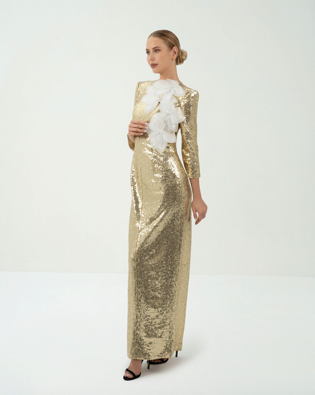 Radiant gold sequin gown with a straight silhouette, three-quarter sleeves, and a striking oversized white floral appliqué on the shoulder for a glamorous yet artistic touch.